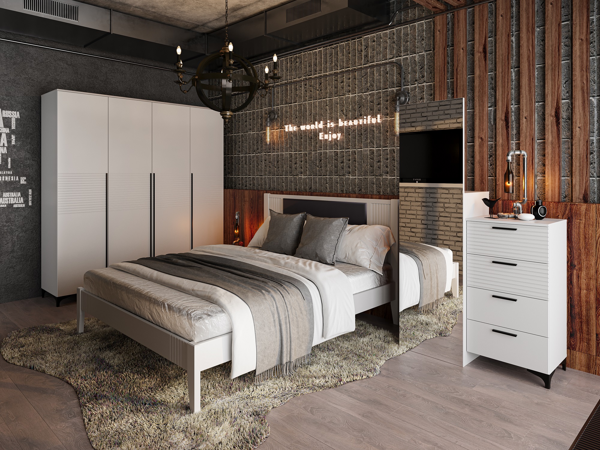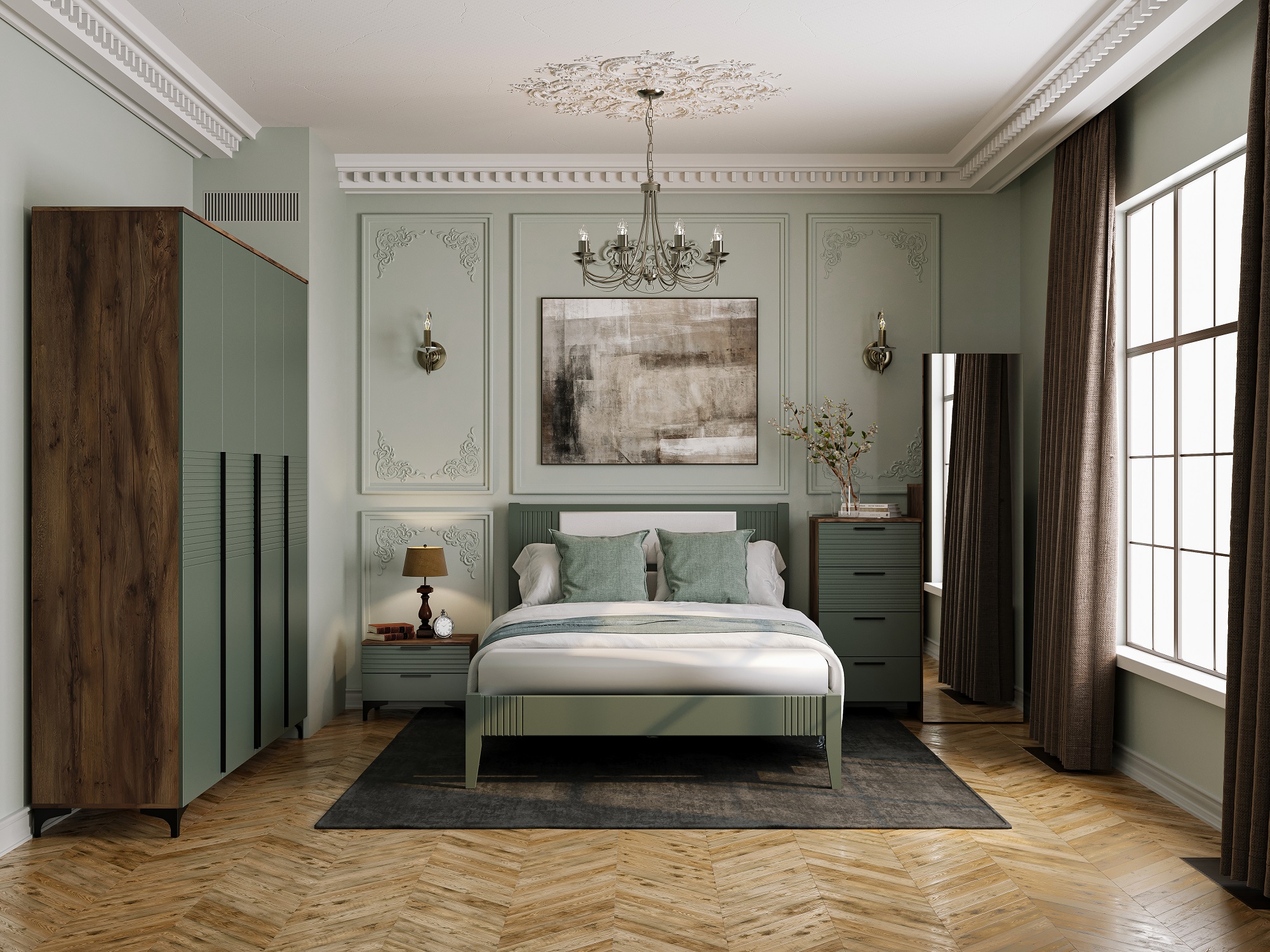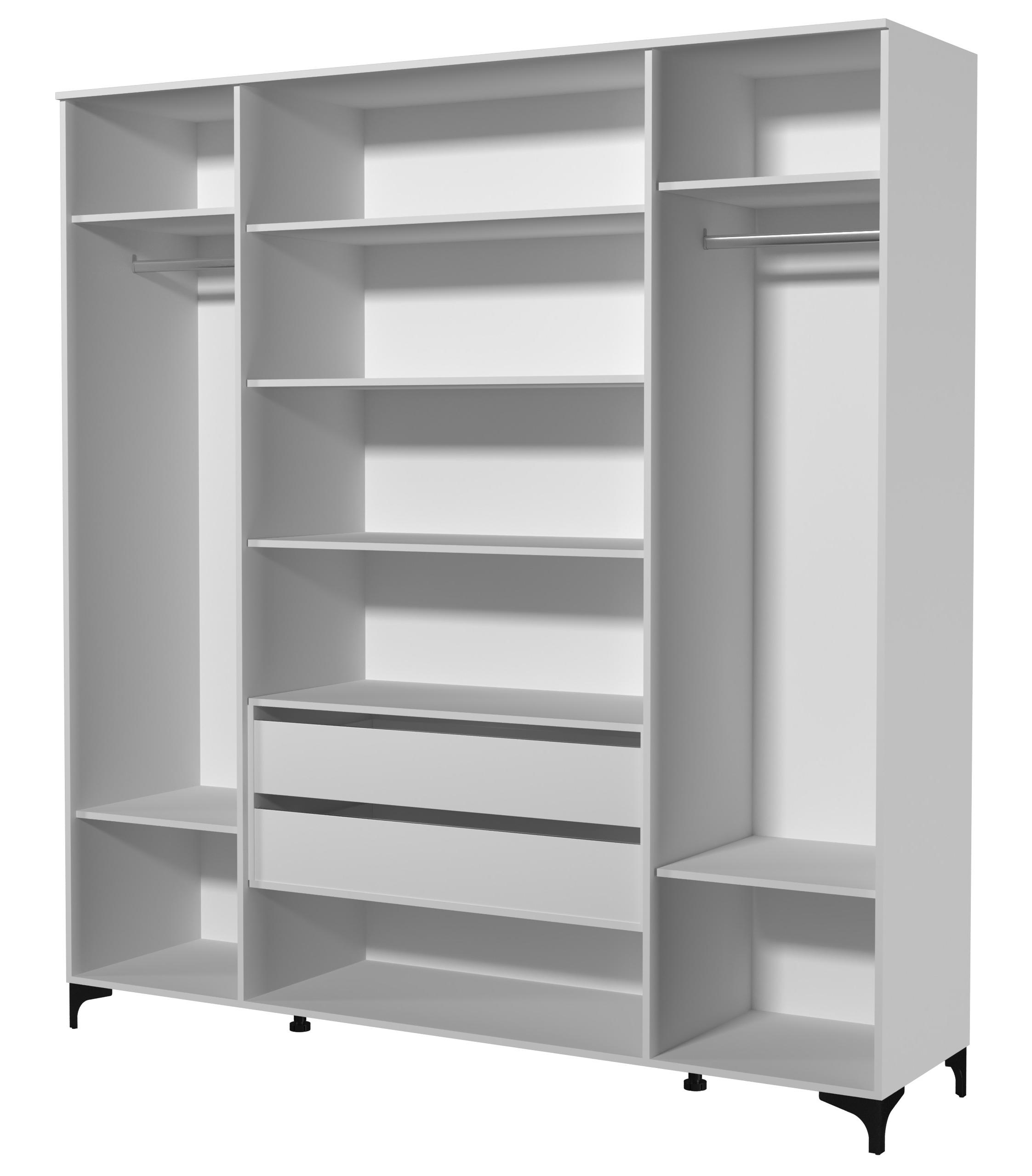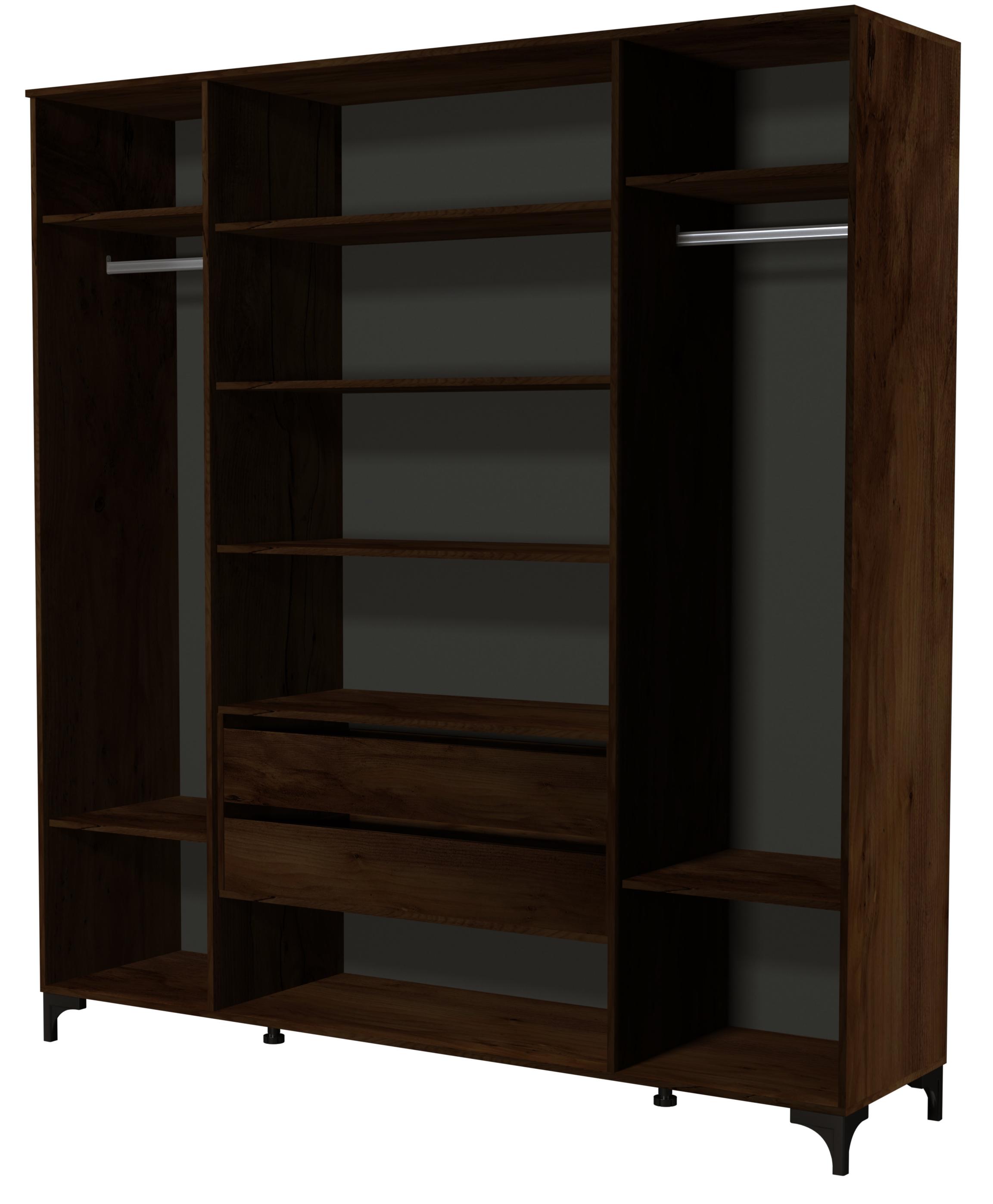 За левой и правой расположены секции со штангой и полками. Посередине, за центральными дверьми, располагаются четыре полки для белья, а также два выдвижных ящика.