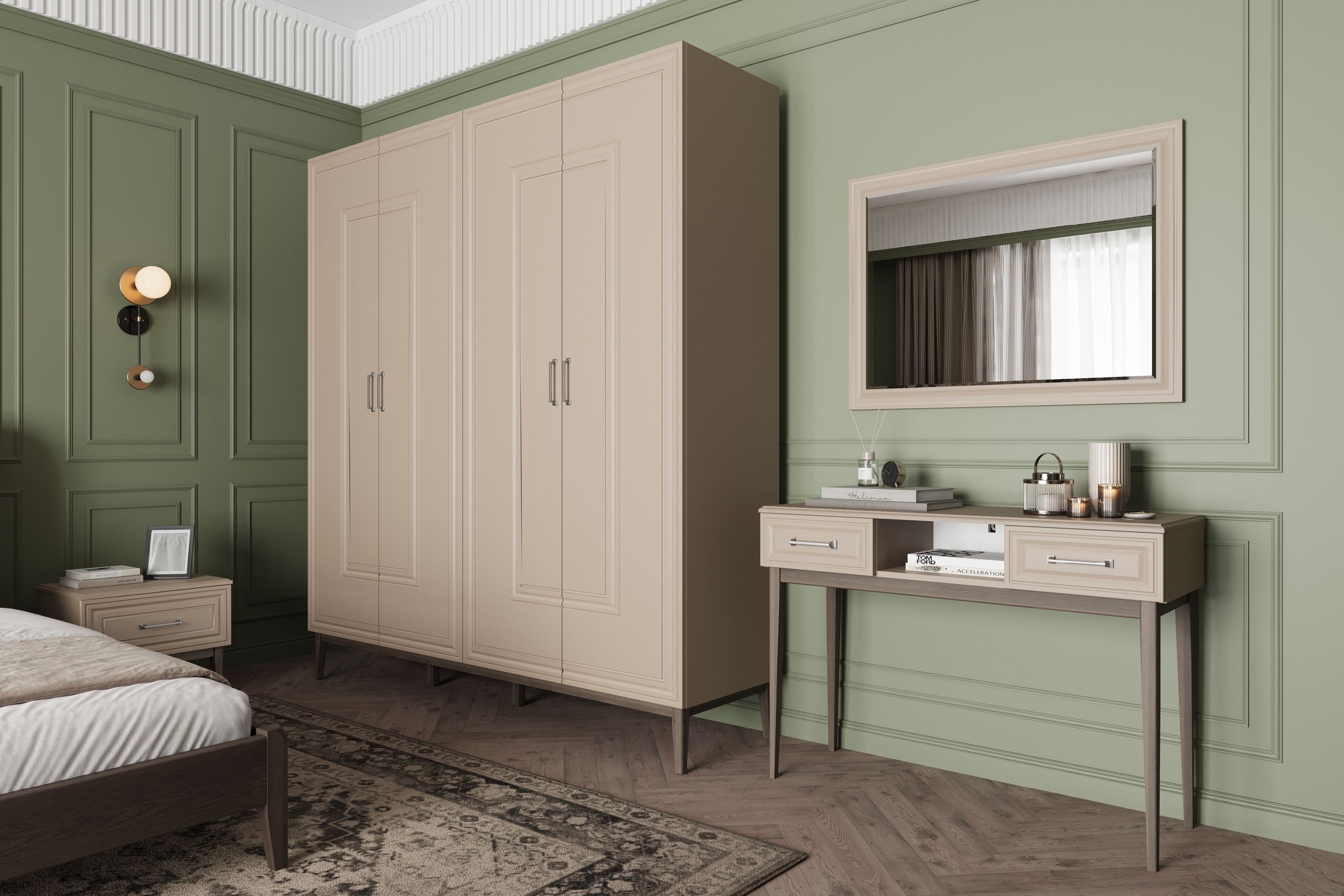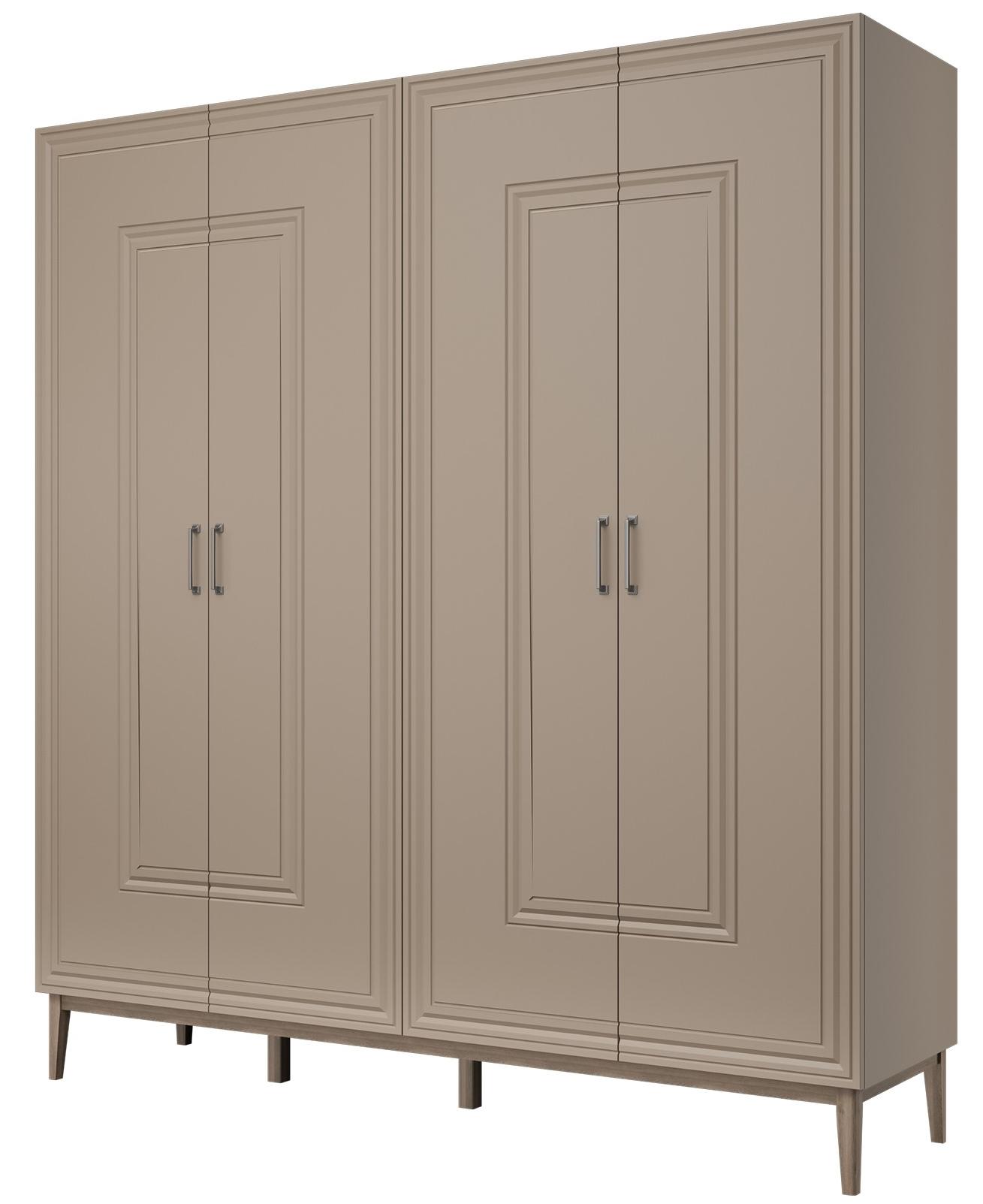 Шкаф с фрезерованными фасадами имеет две секции. За правой секцией расположена штанга и верхняя полка. За левой секцией располагается штанга с верхней полкой, а также четыре полки для белья.