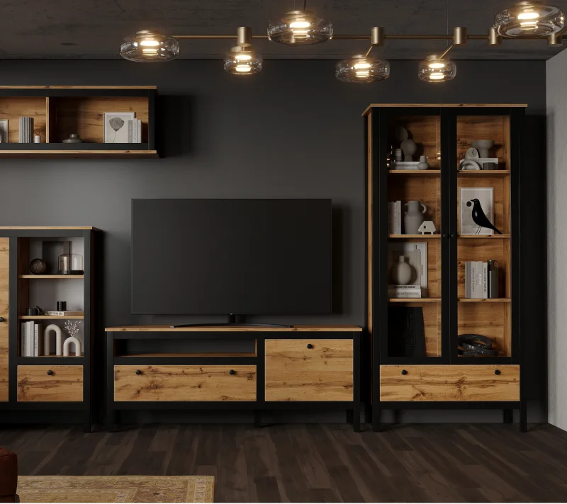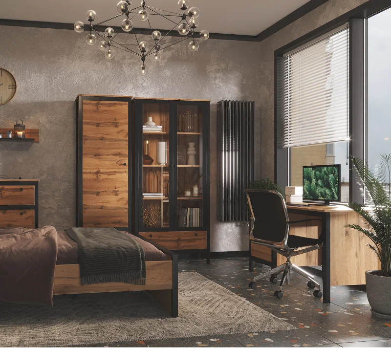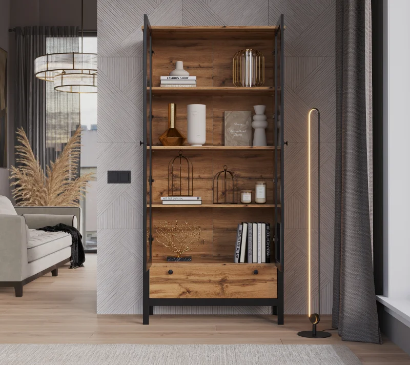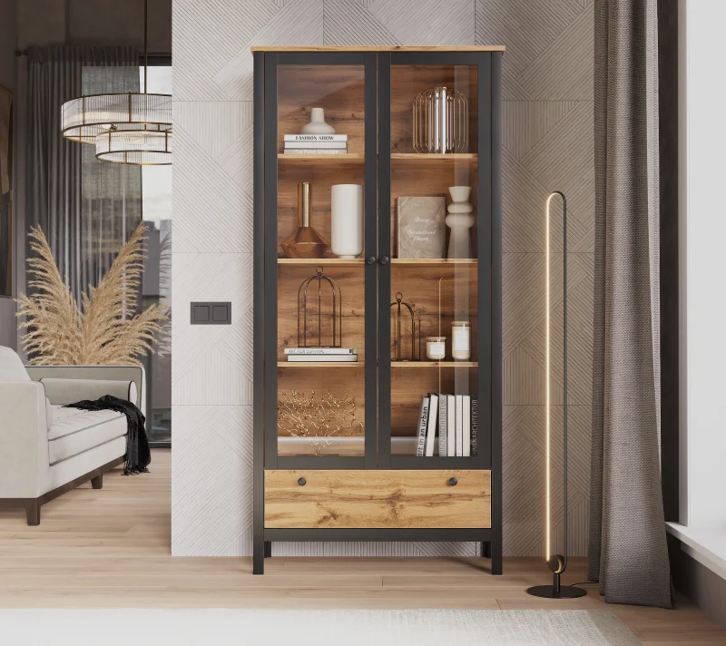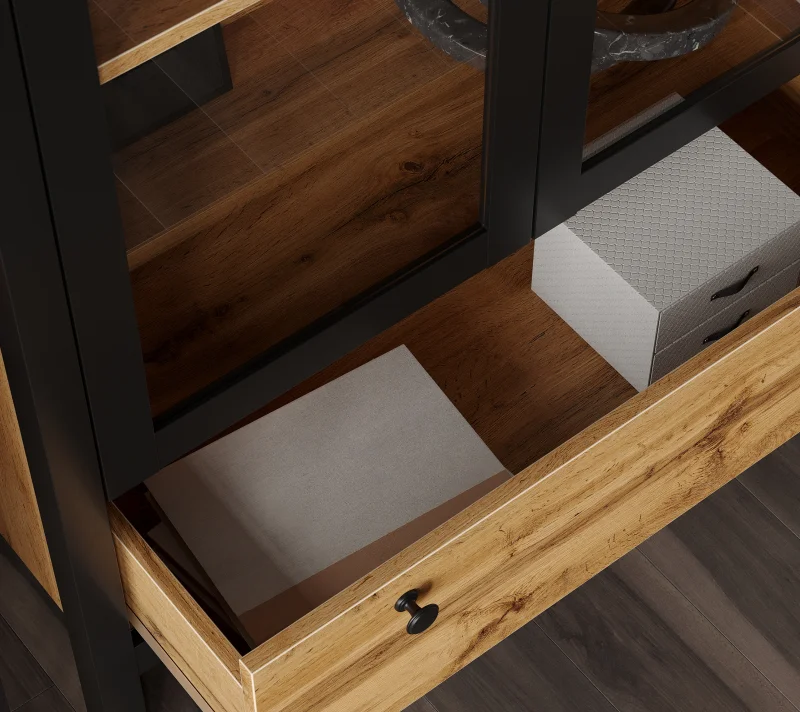 Вместительный сервант сохранит от пыли любимые вещи и продемонстрирует их с самой выгодной стороны. Распашные дверцы с металлическими ручками предоставляют удобный доступ к просторным полкам. Выдвижной ящик под полками оснащен шариковыми направляющими полного выдвижения, что гарантирует плавное закрытие.