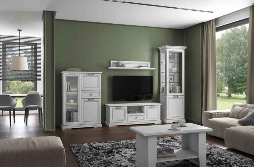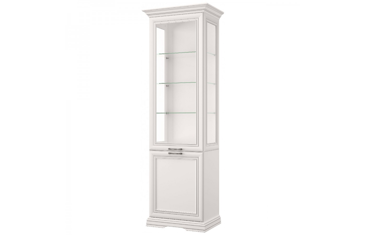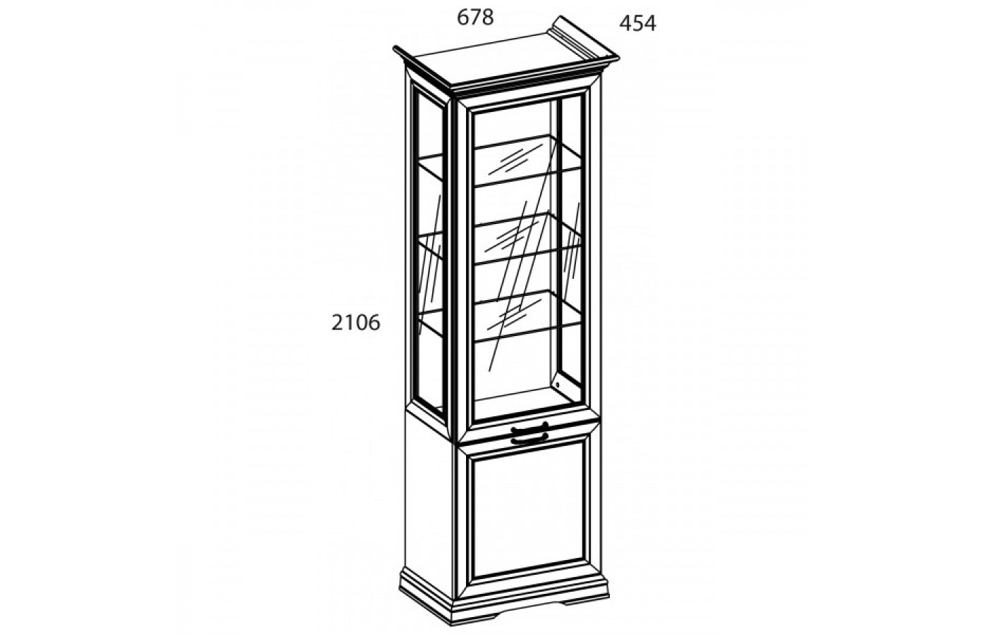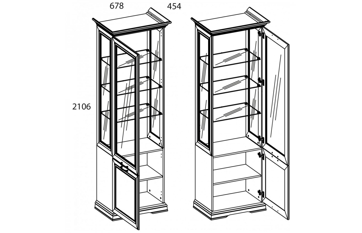 Конструкция шкафа с витриной 1VD прямая, представляет собой одно отделение с полками из стекла за одной витриной (1V), одно отделение с полкой за одно глухой дверью (1D). Витрина и дверь распашные, крепятся на петли к боковому корпусу. Особенностью элемента являются боковые корпуса из стекла и рамки.