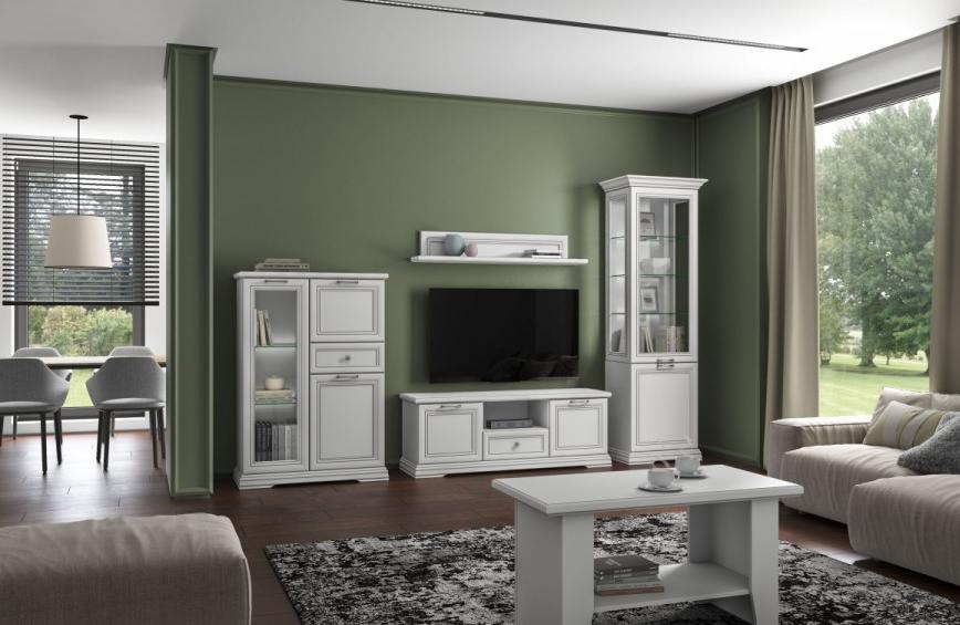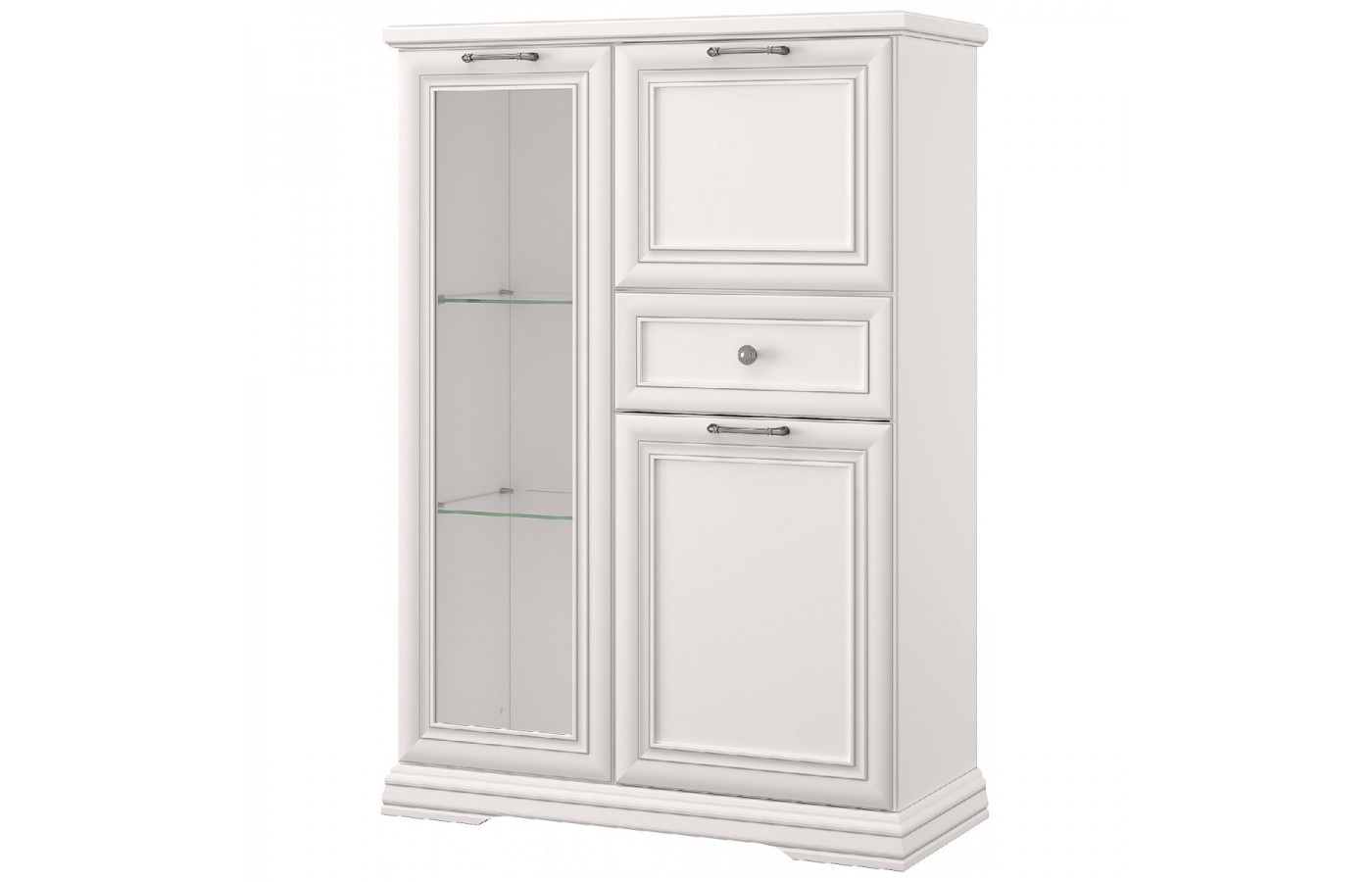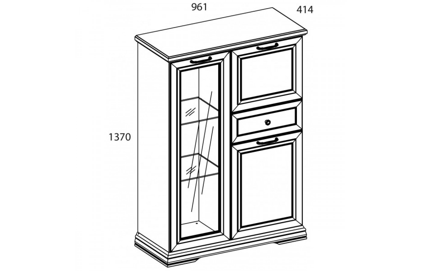 Конструкция шкафа с витриной 1V2D1S прямая, представляет собой одно отделение с полками из стекла за витриной (1V), два раздельных отделения за двумя глухими дверями (2D), один выдвижной ящик (1S).