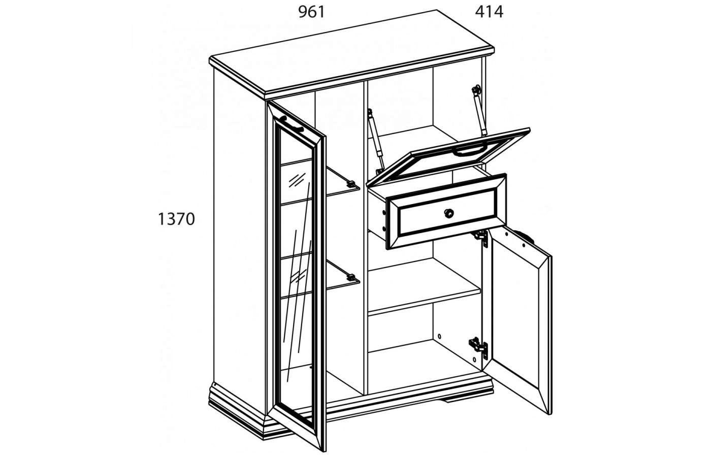 Витрины и глухая дверь внизу распашные, крепятся к боковому корпусу и внутренней перегородке; дверь, которая закрывает верхнее отделение, откидная и крепится посредством петель и газлифтов.