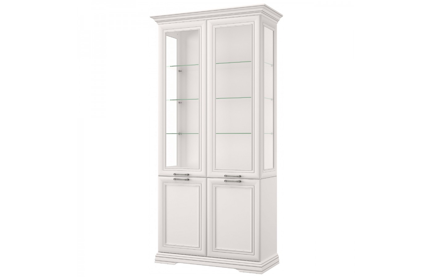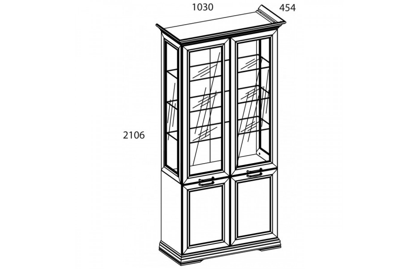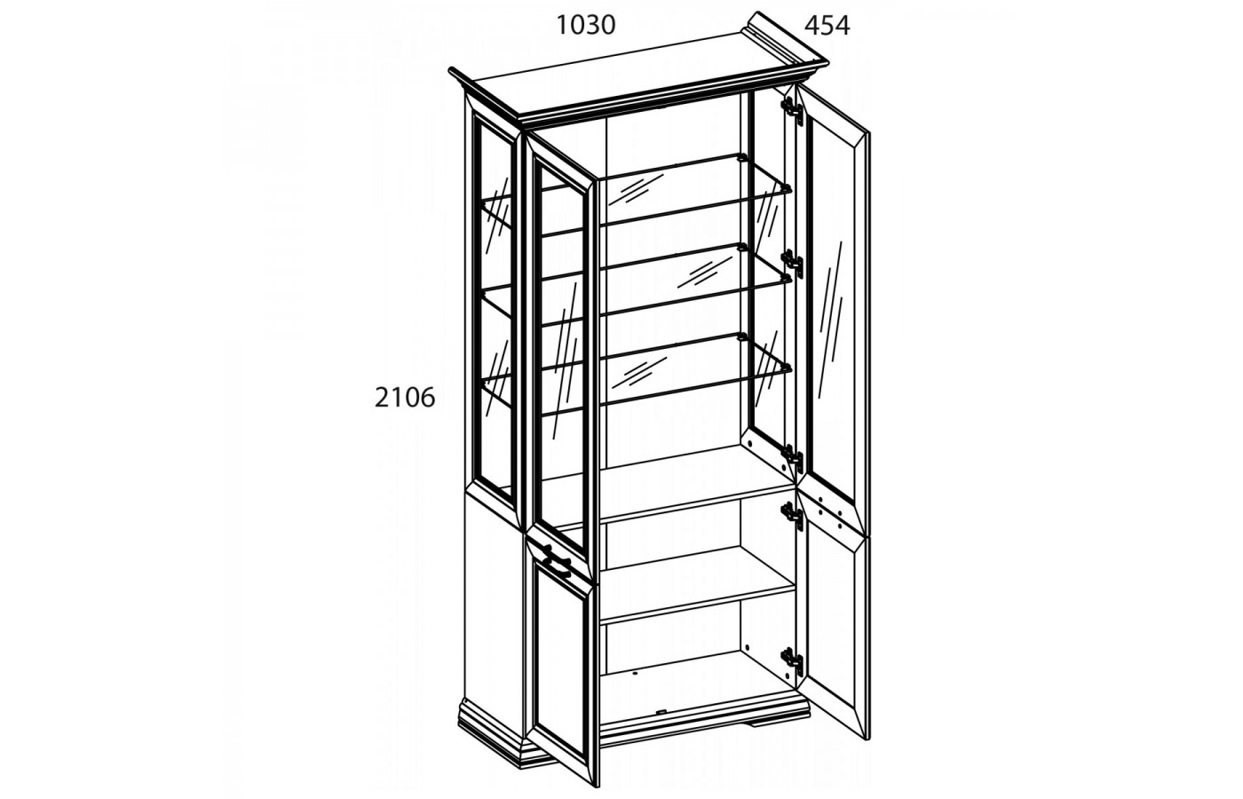 Конструкция шкафа с витриной 2V2D прямая, представляет собой отделение с полками из стекла за двумя витринами (2V), одно отделение с полкой ЛДСП за двумя глухими дверями (2D). Витрины и двери распашные, крепятся на петли к боковому корпусу изделия.