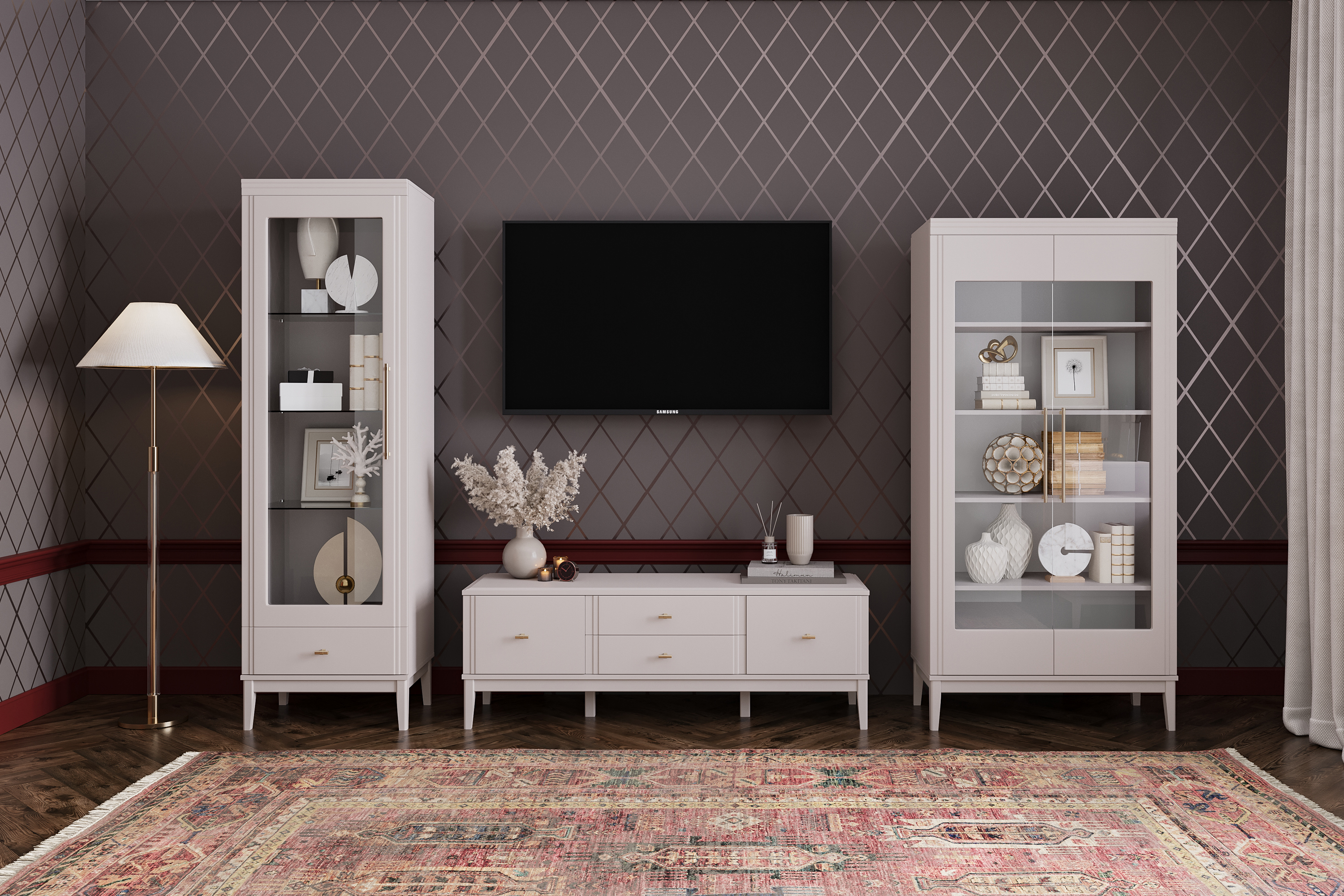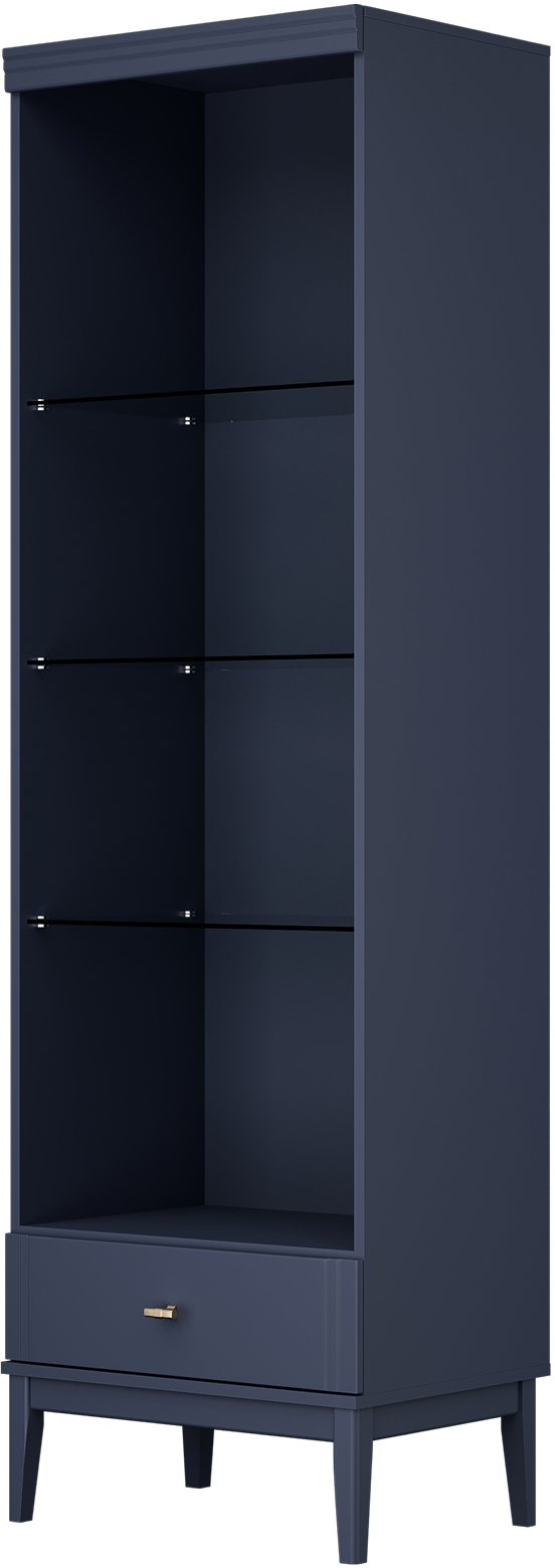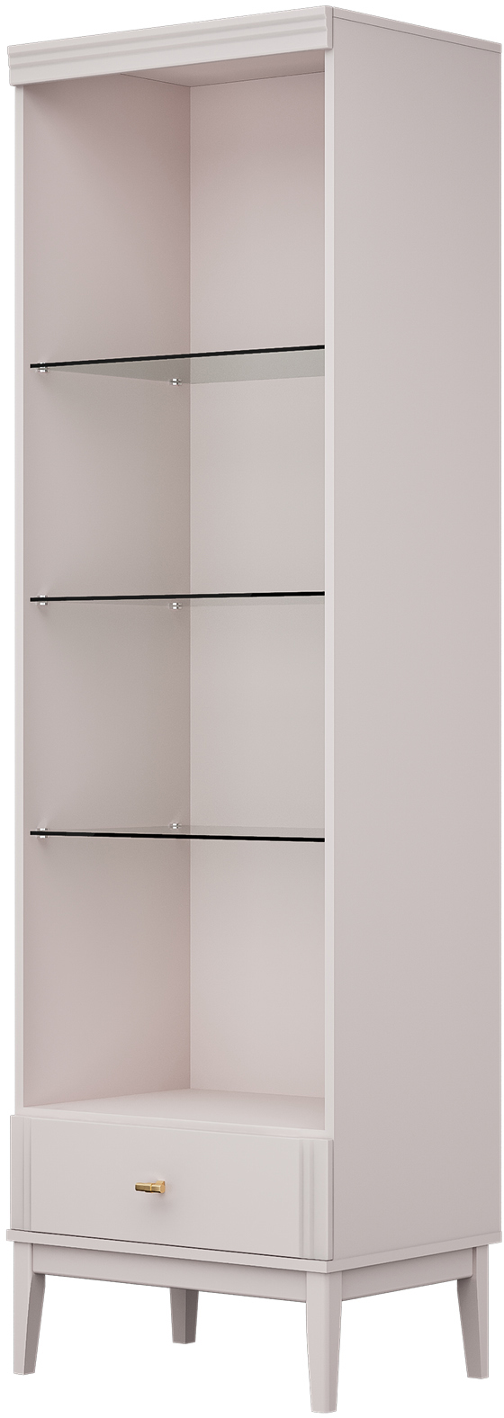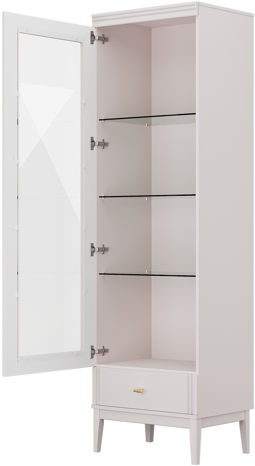 Внутреннее наполнение включает три стеклянные полки толщиной 4 мм, обеспечивающие прозрачность и визуальное расширение пространства. Витрина оснащена одним выдвижным ящиком на шариковых направляющих полного выдвижения. Дверцы установлены на петлях с доводчиком, что обеспечивает плавное и надёжное закрывание.