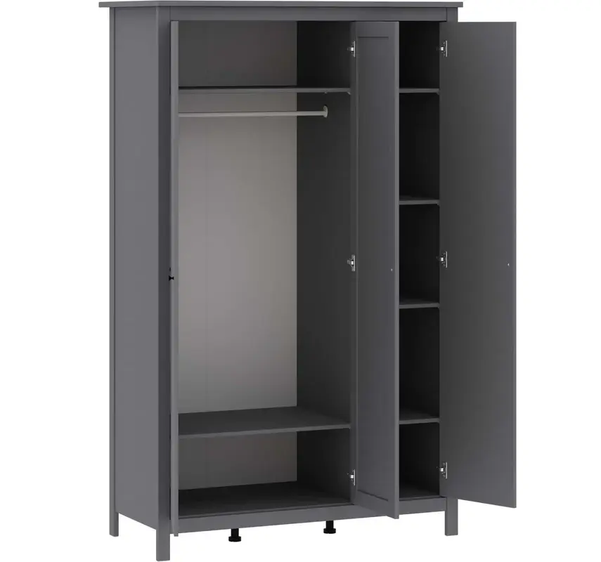 За двумя распашными дверцами находится большая секция с овальной металлической штангой для вешалок, верхней и нижней полками, за третьей дверцей - отсек с четырьмя полками. Шкаф выполнен из высококачественного ДСП обладающего повышенной прочностью и стойкостью от растрескивания и деформации. Дверца оснащены четырехшарнирными накладными петлями с доводчиком GTV и черной металлической ручкой-кнопкой. Полкодержатели пластмассовые с фиксатором.