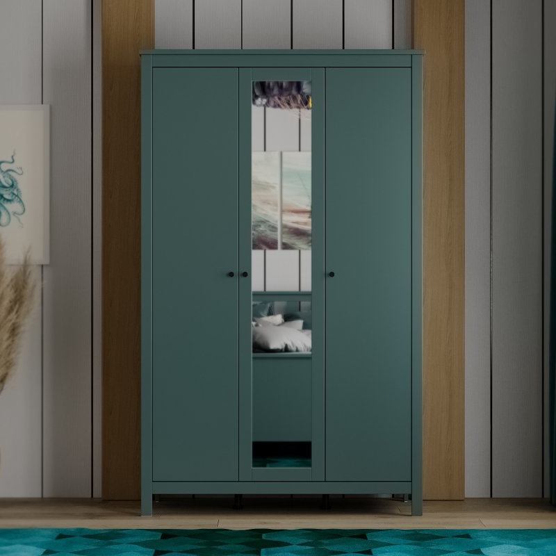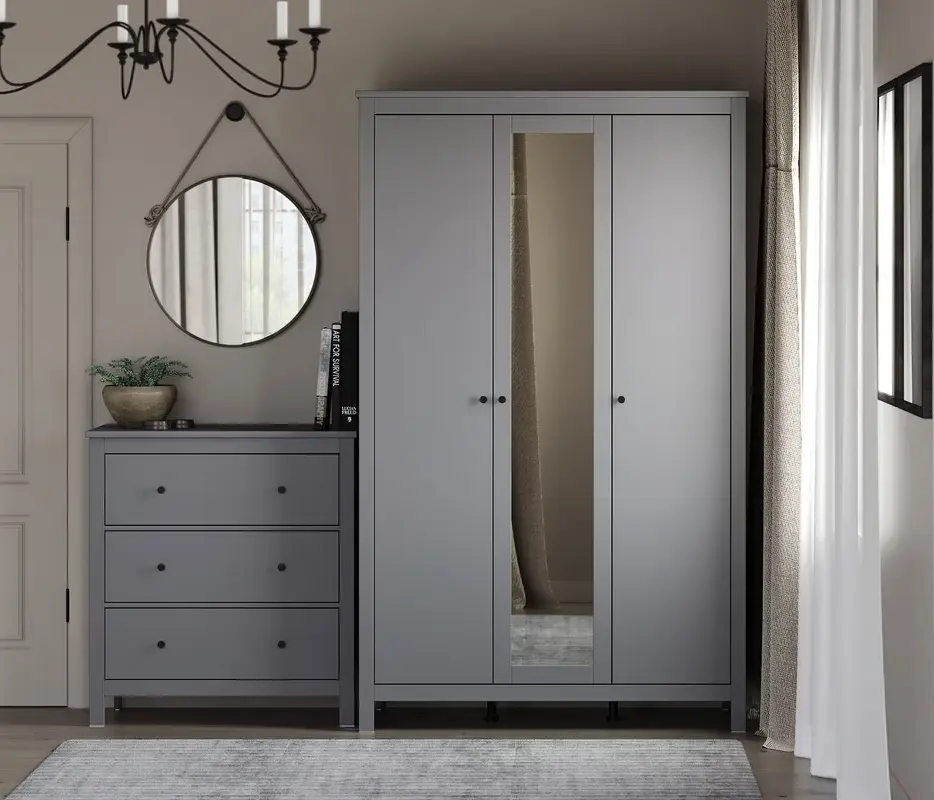 Зеркало на центральной двери не только визуально расширяет пространство, но и делает шкаф более функциональным, позволяя вам оценить свой образ перед выходом.