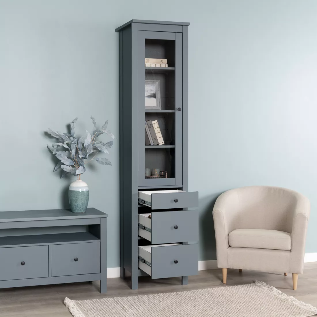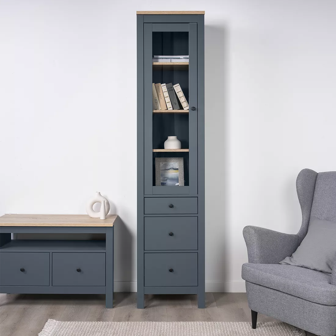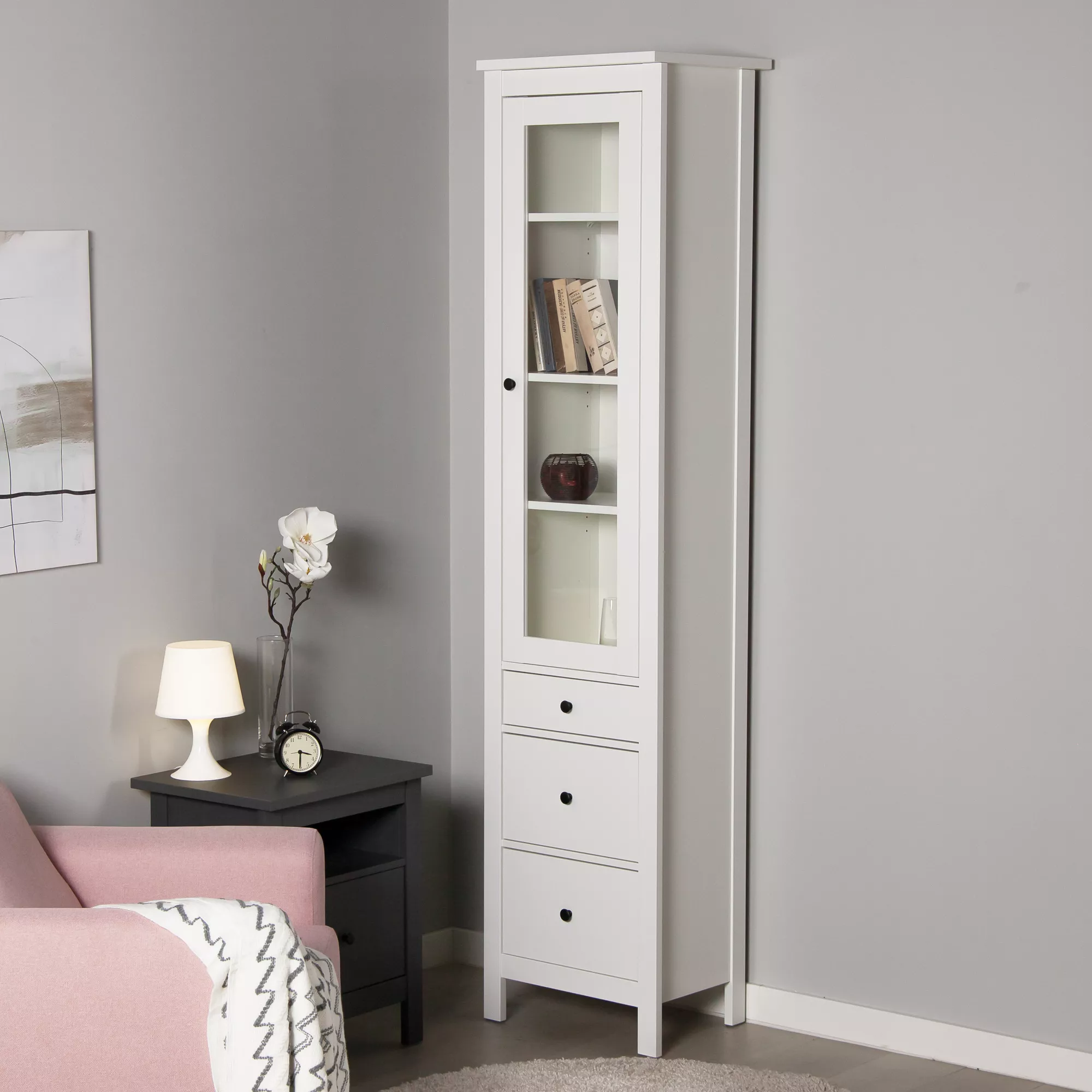 Дверца шкафа выполнена со стеклом, что позволяет демонстрировать содержимое, одновременно защищая его от пыли.