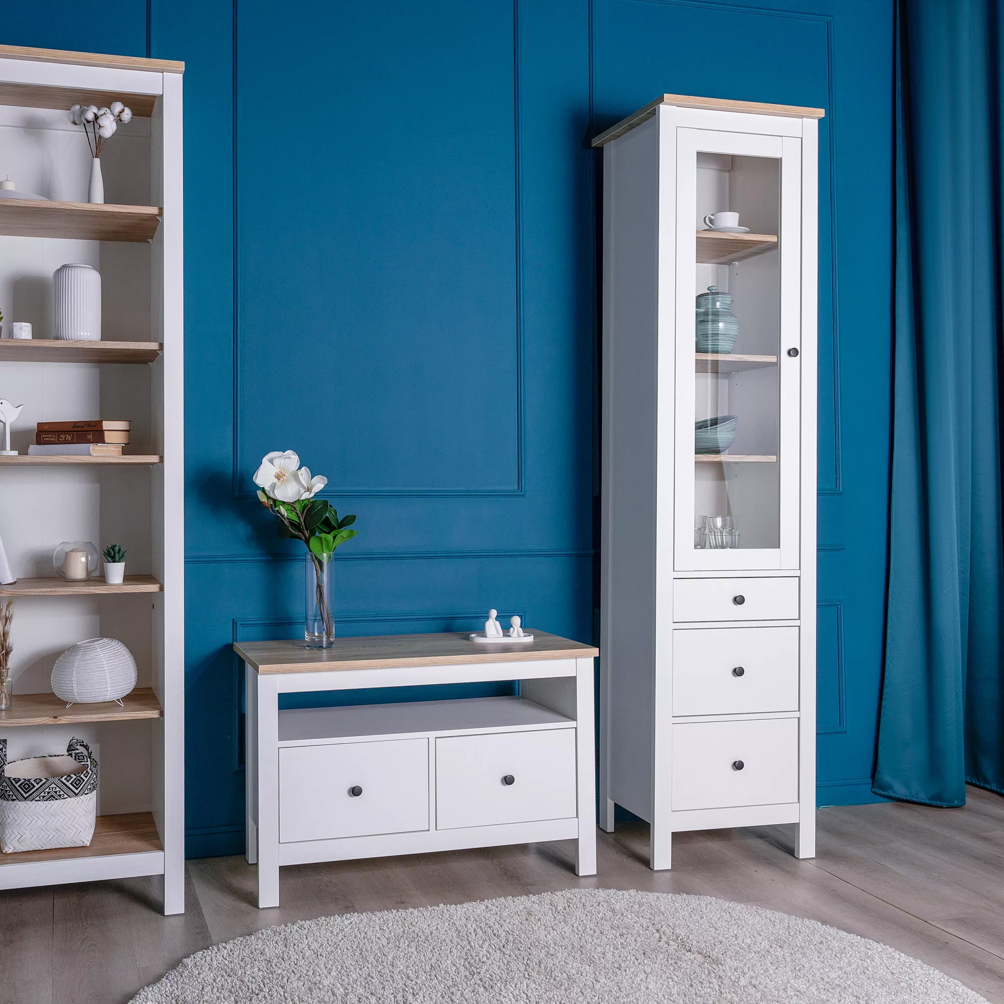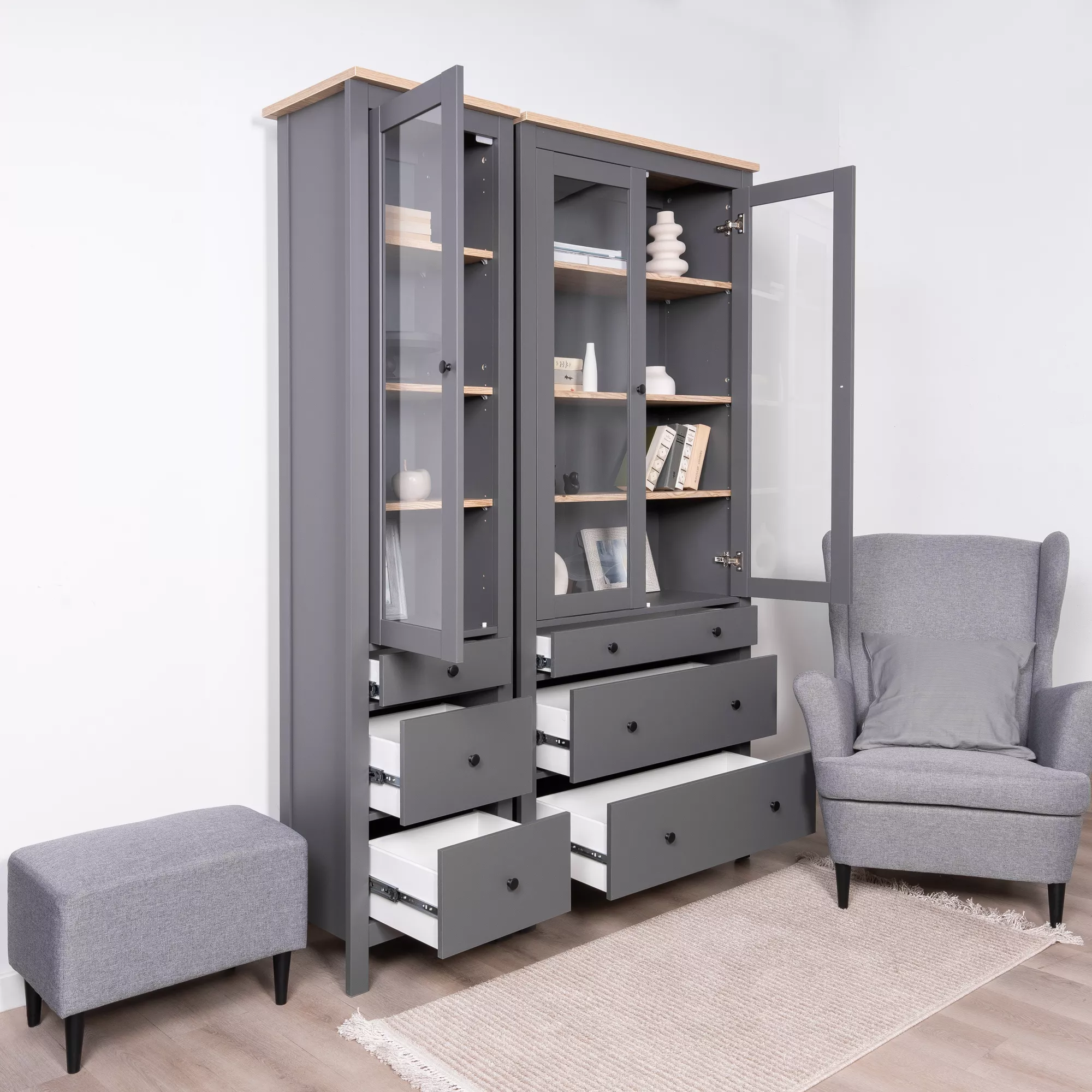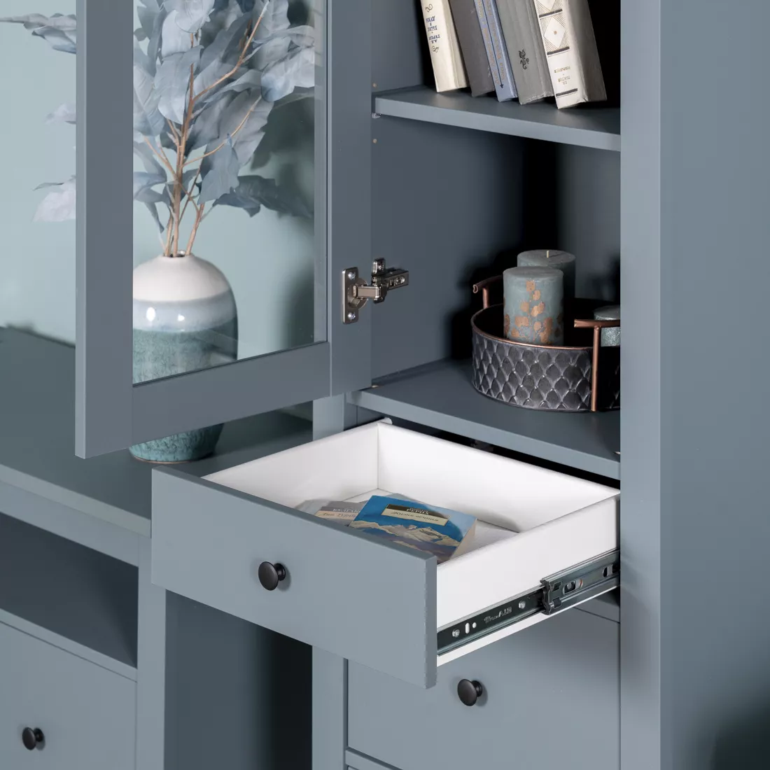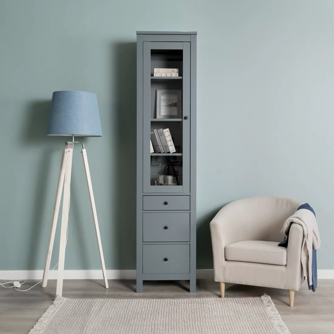 Дверца шкафа выполнена со стеклом, что позволяет демонстрировать содержимое, одновременно защищая его от пыли.