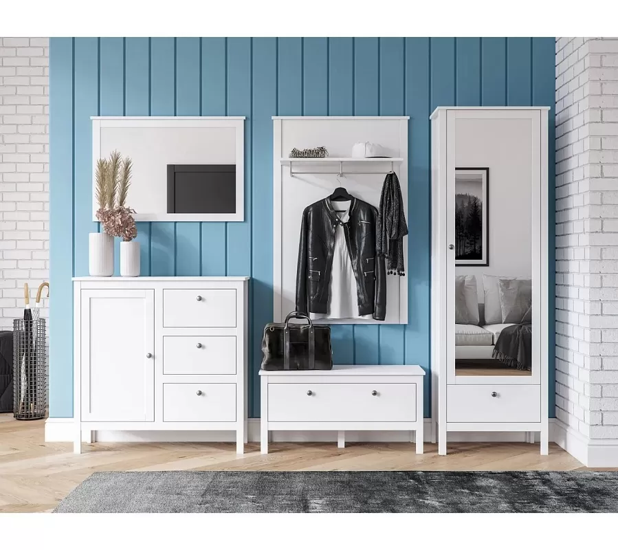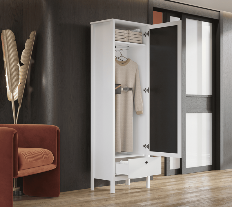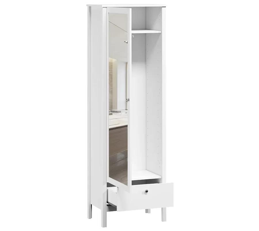 В ней легко можно уместить мелкие вещи, головные убору и внесезонную одежду. Верхняя полка переставляется по высоте, а дверь всегда можно перевесить на левую или правую сторону.