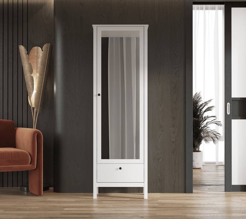 По периметру белого одностворчатого шкафа Ewa (Helga) проходит белая декоративная планка, а фасад украшают серебристые ручки. В остальном дизайн лаконичный и сдержанный. В оформлении преобладает шик, удобство, простота. Шкаф «Ева (Хельга)» радует плавной системой открывания, естественной красотой и идеальной сочетаемостью с другой мебелью коллекции Ewa (Helga).