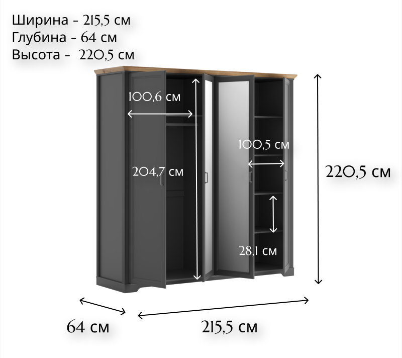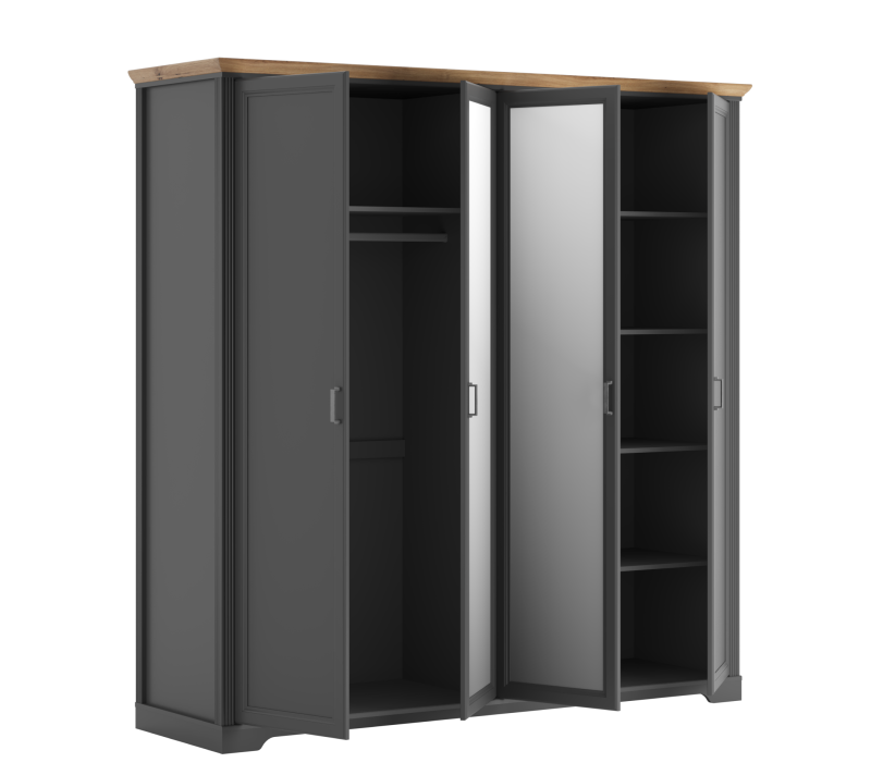Четырехстворчатый шкаф обладает емким внутренним пространством: просторными боковыми полками, штангой и верхней полкой для хранения объемных вещей. Распашные дверцы предоставляют удобный доступ внутрь.