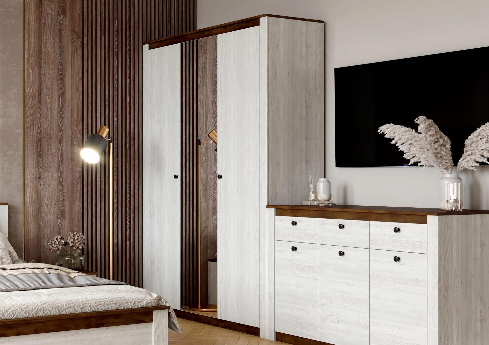 Дизайн шкафа “Даллас” выполнен в современном стиле, в цвете Дуб Винтерберг/Таксония, сочетающем в себе элегантность и минимализм.