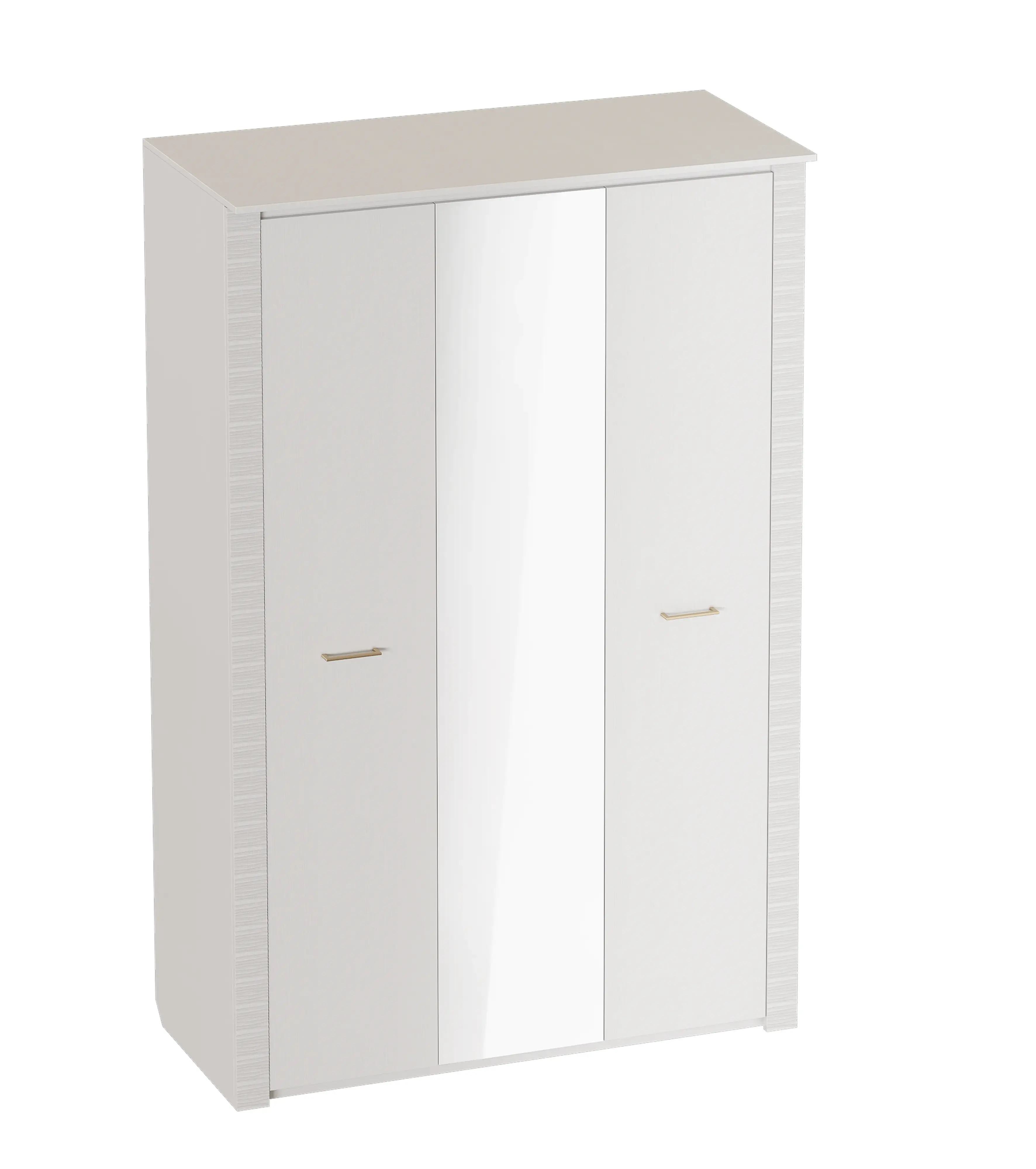 Трехдверный шкаф с зеркалом "Элана" оснащен двумя отделениями: для белья с четырьмя съёмными и центральной жёсткой полкой; платяное с жесткой полкой и продольной стальной штангой. В колпаке шкафа имеются пазы для двух светильников, входящих в комплект. Блок питания приобретается отдельно, и рассчитан на подключение шести светильников.