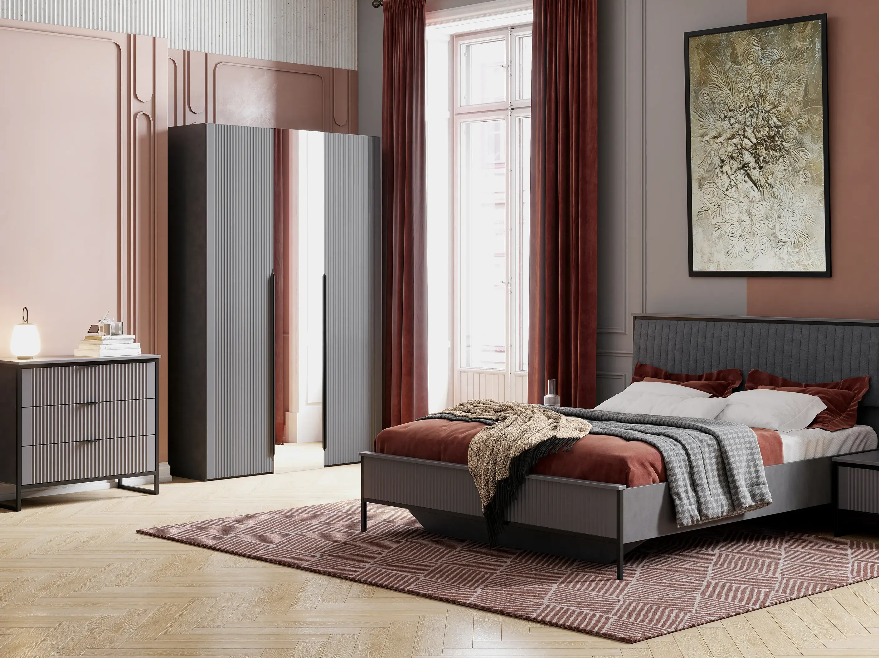 Коллекцию модульной спальни "Нора" отличает современный оригинальный стиль. Декоративная продольная фрезеровка на фасадах из МДФ и опоры на металлокаркасе цвета "Черная эмаль" соответствуют модным тенденциям этого года в ведущих зарубежных коллекциях.