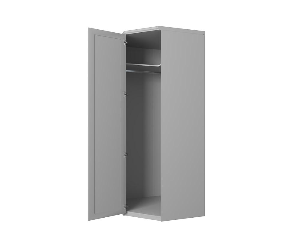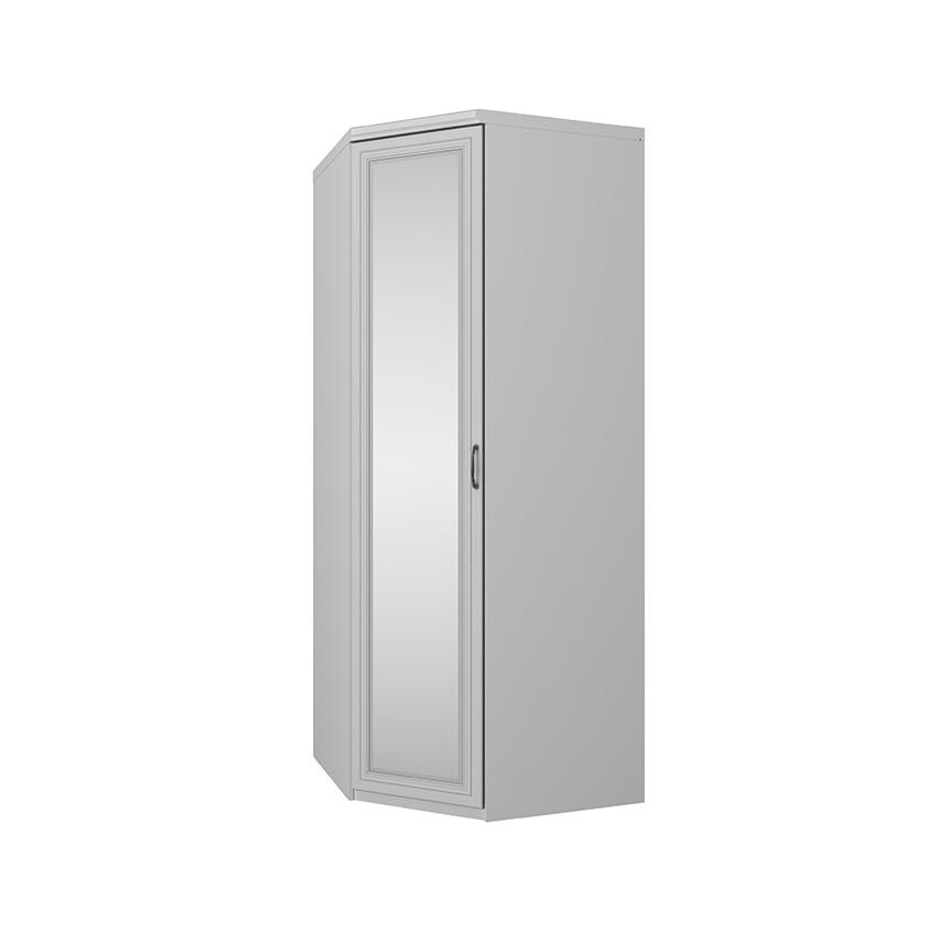 Шкаф имеет угловую форму, что позволяет эффективно использовать пространство комнаты. Внутри шкафа есть всё необходимое для хранения одежды и других вещей: полки, штанга для вешалок и выдвижные ящики. Благодаря зеркалу на фасаде шкаф может выполнять функцию туалетного столика.