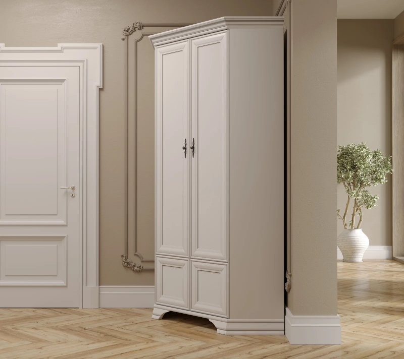 Шкаф отличается универсальностью и позволяет организовывать вещи как горизонтально, так и вертикально. Металлические ручки с декоративными элементами гармонично дополняют светлый фасад.