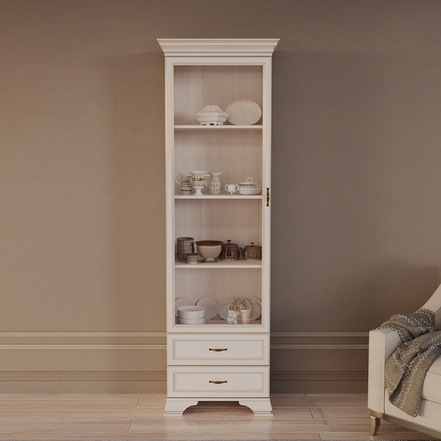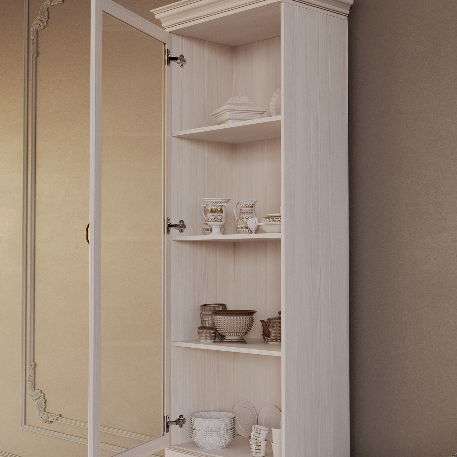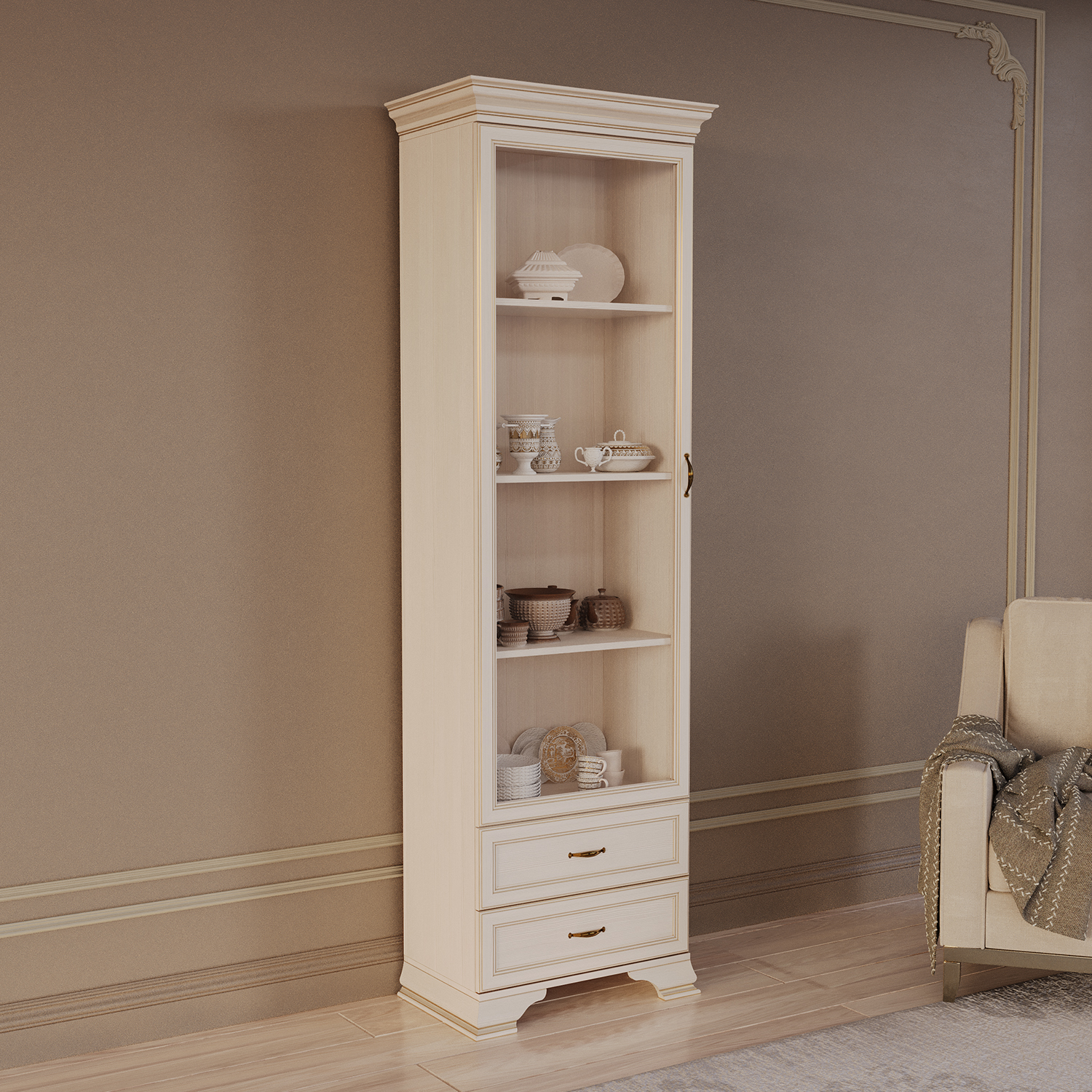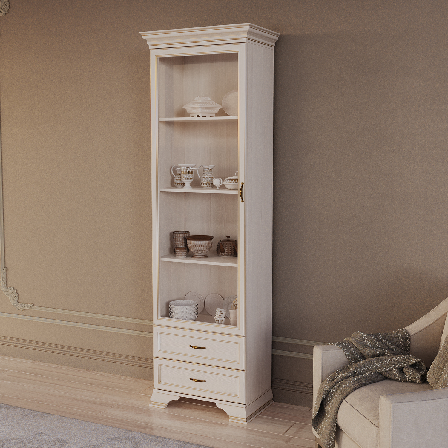 Современный шкаф‑витрина Сиена сочетает функциональность, эргономику и актуальный дизайн, становясь практичным элементом любого интерьера.