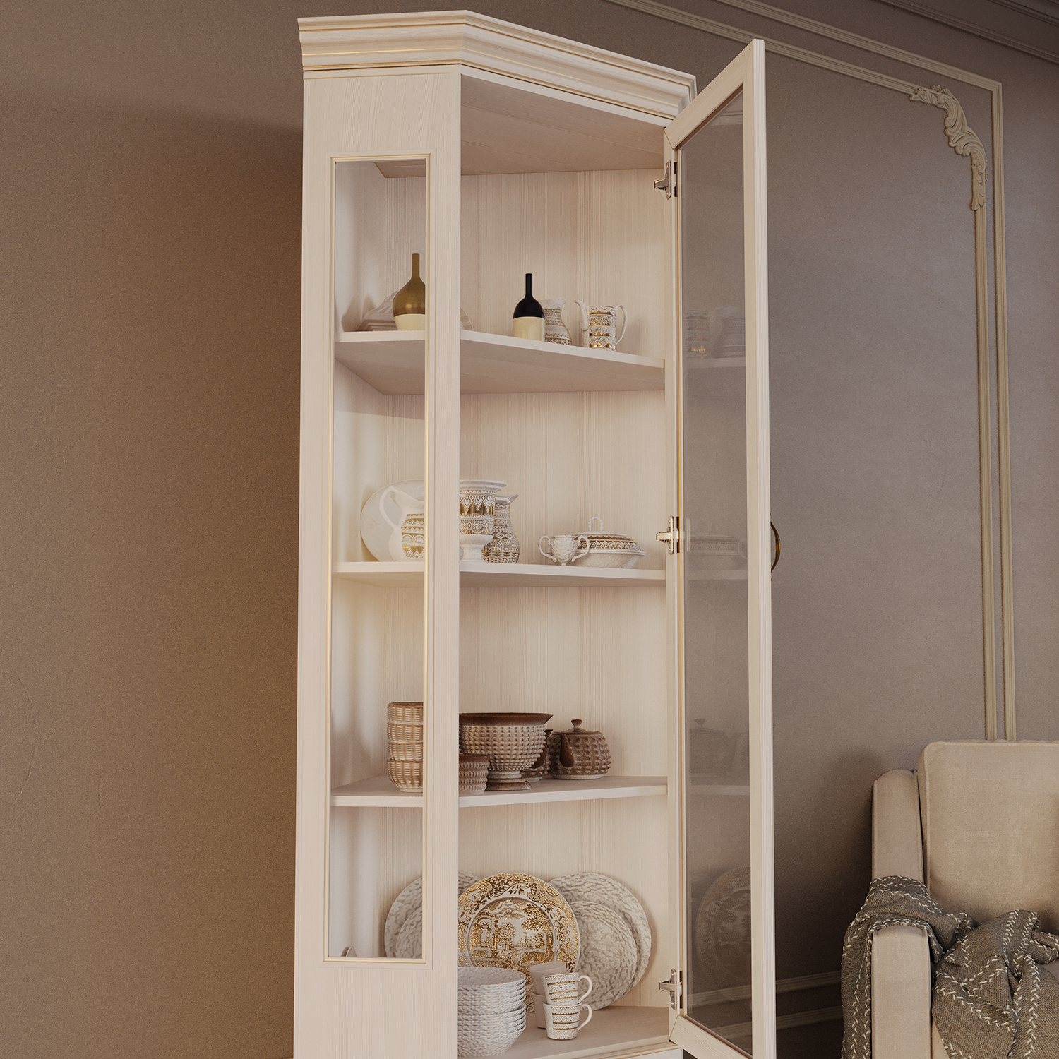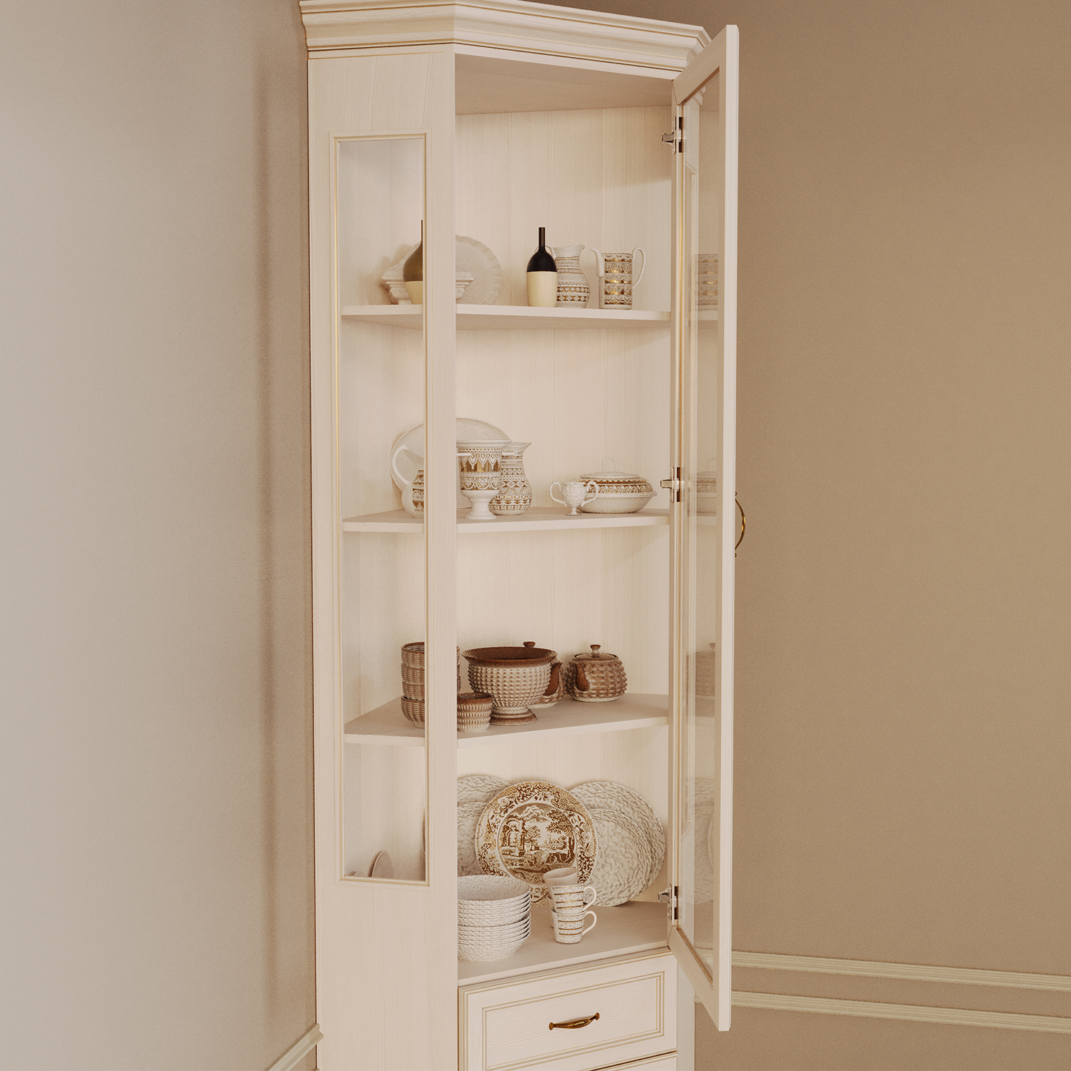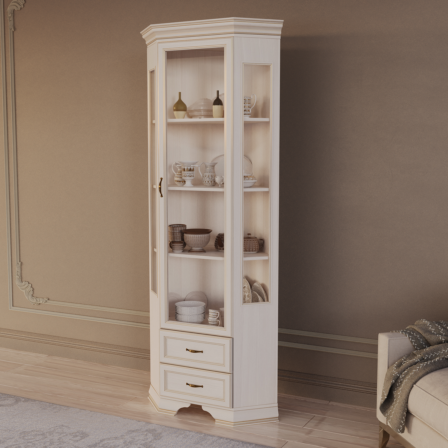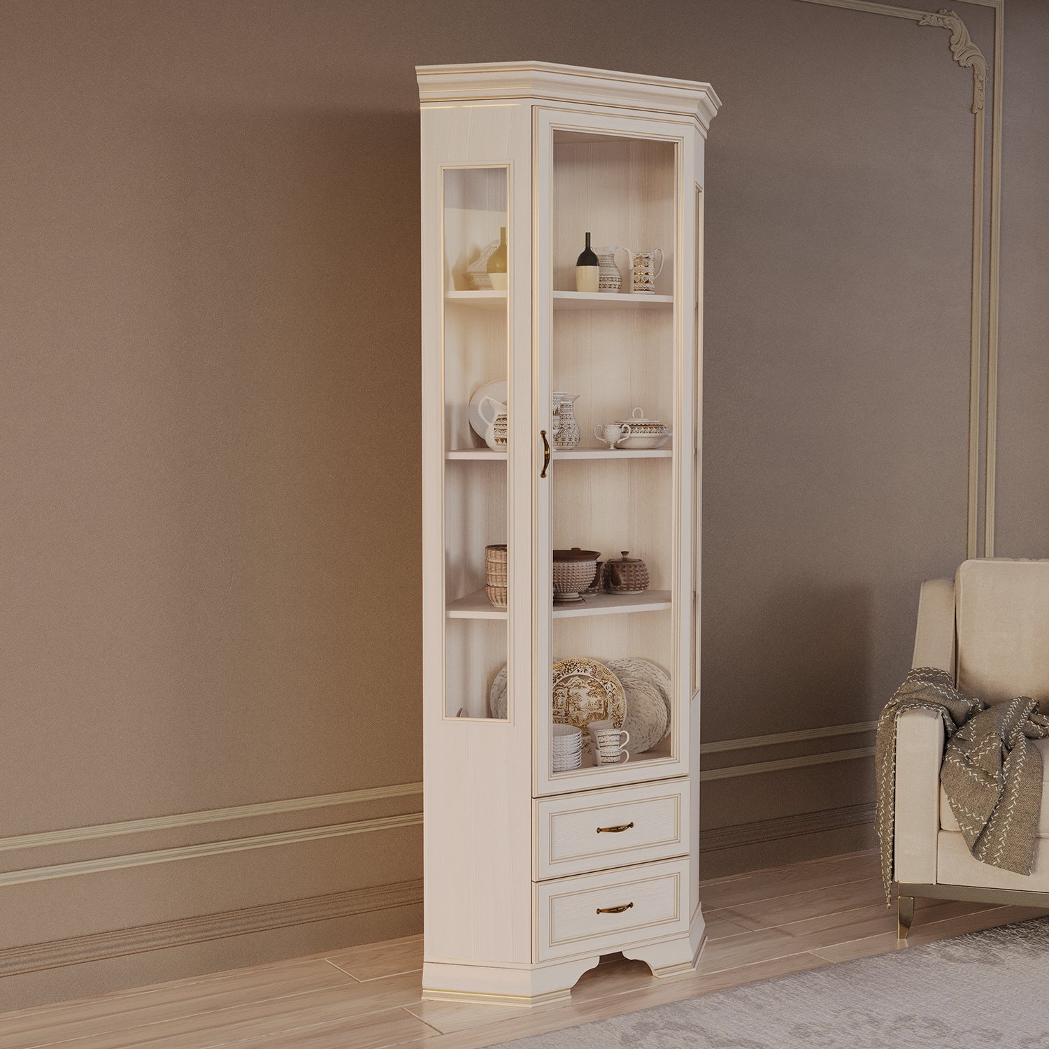 Современный шкаф‑витрина Сиена сочетает функциональность, эргономику и актуальный дизайн, становясь практичным элементом любого интерьера.