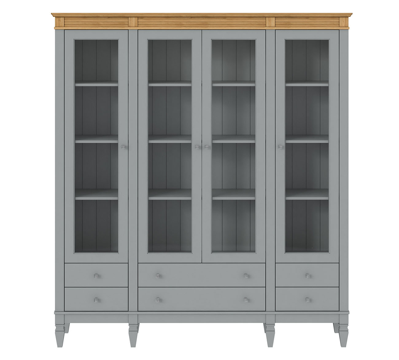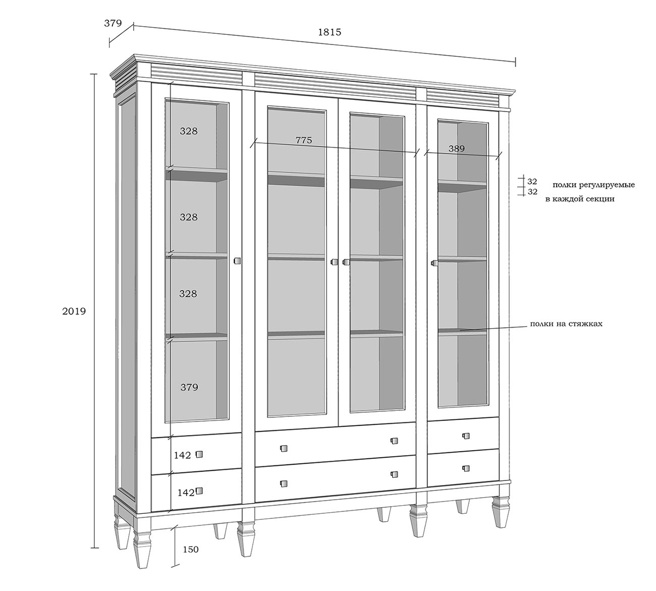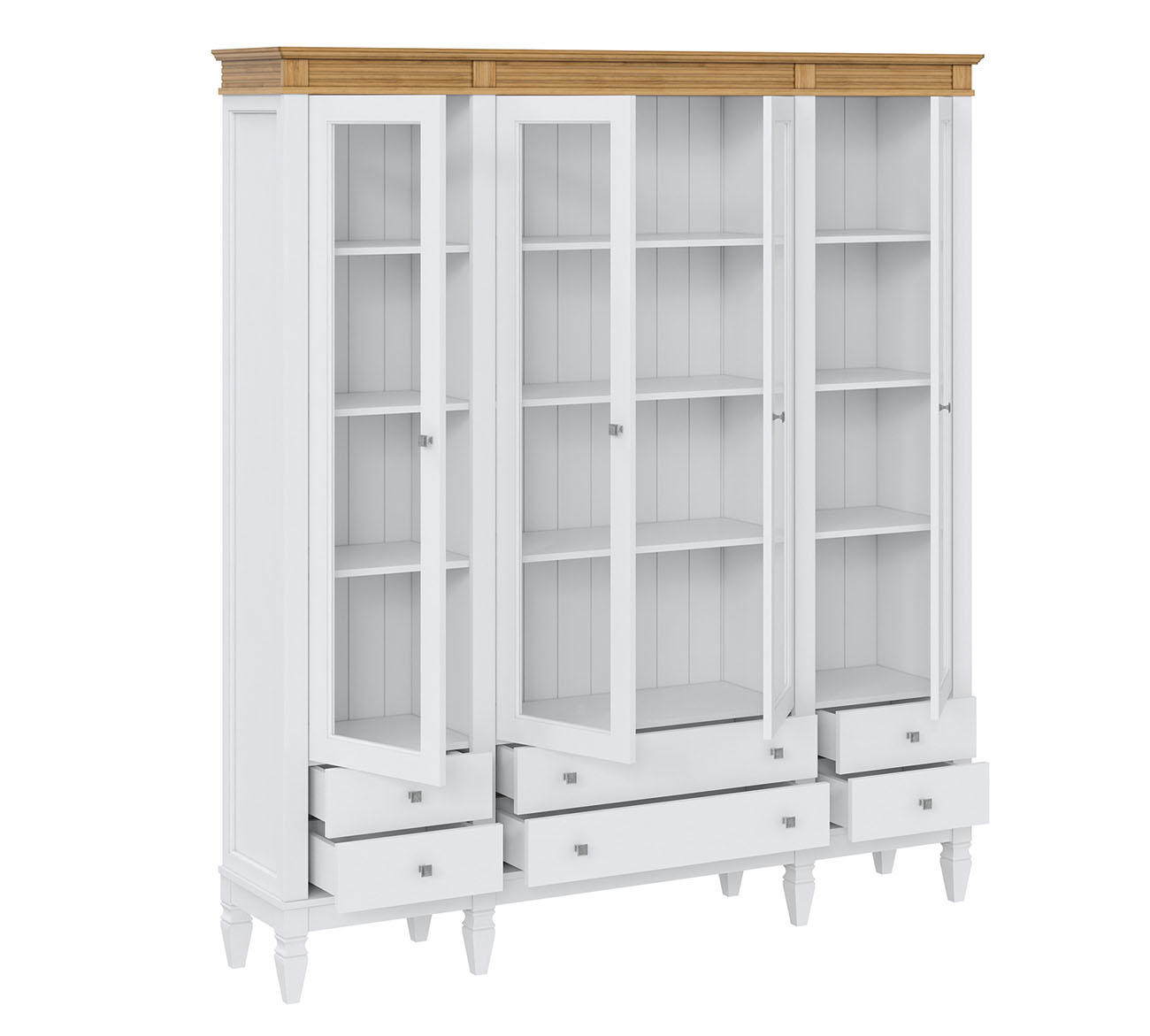 Фурнитура: Направляющие скрытого монтажа со встроенным демпфером (доводчиком плавного закрывания). Ручки - стиль классика, имеют форму квадрата, материал металл, цвет серебро состаренное.