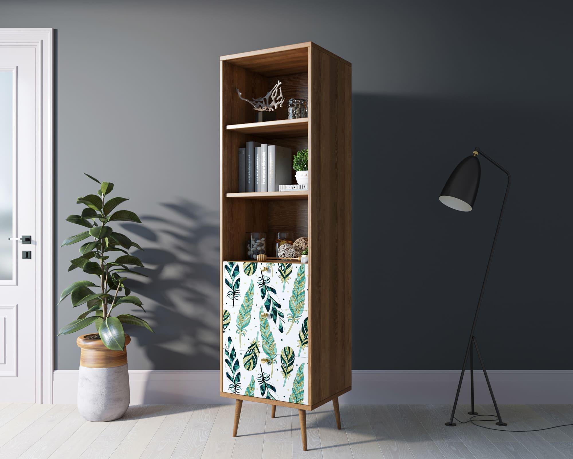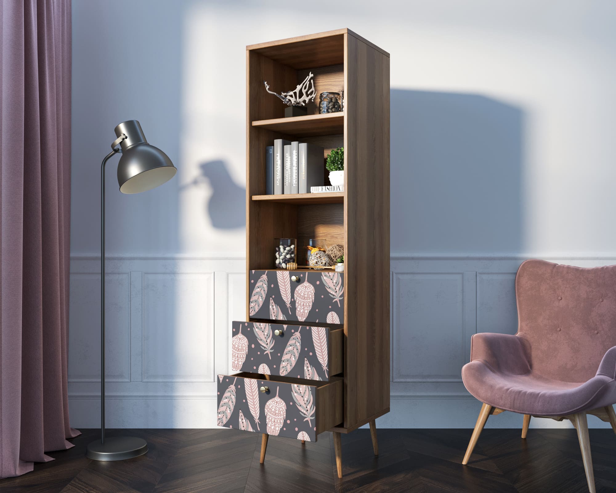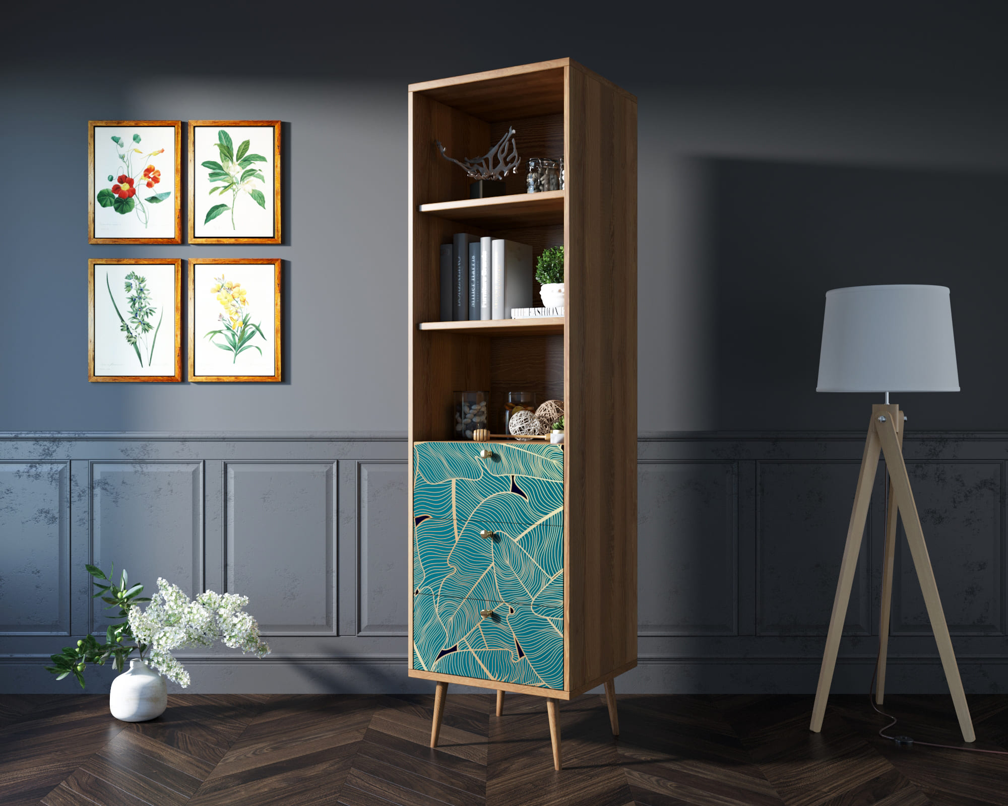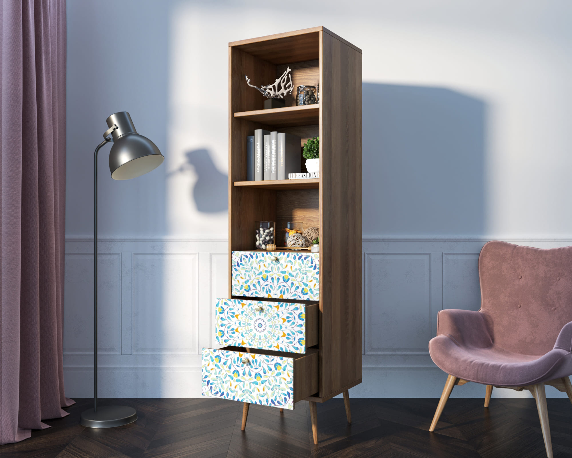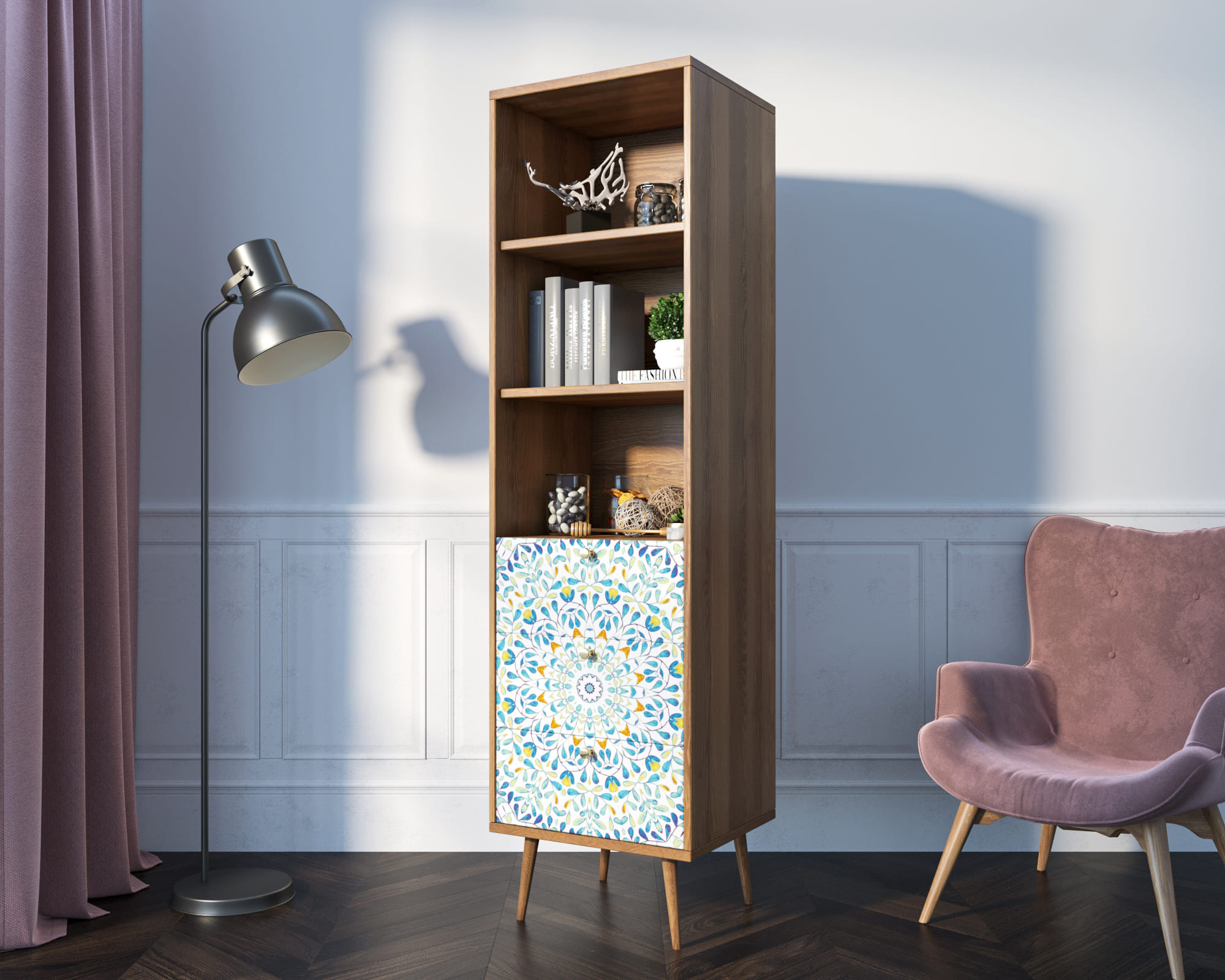 Стильный дизайн. Фасад стеллажа украшен принтом, выполненным в спокойных тонах. Это придаёт изделию элегантность и изысканность, а также позволяет гармонично вписать его в любой интерьер.