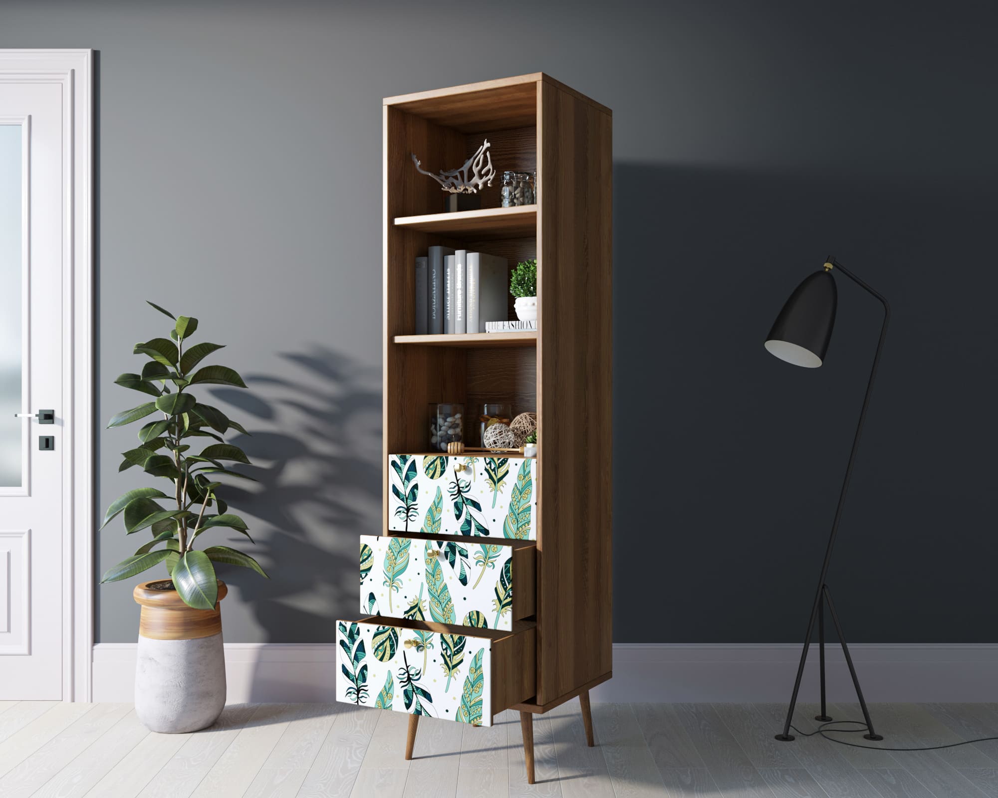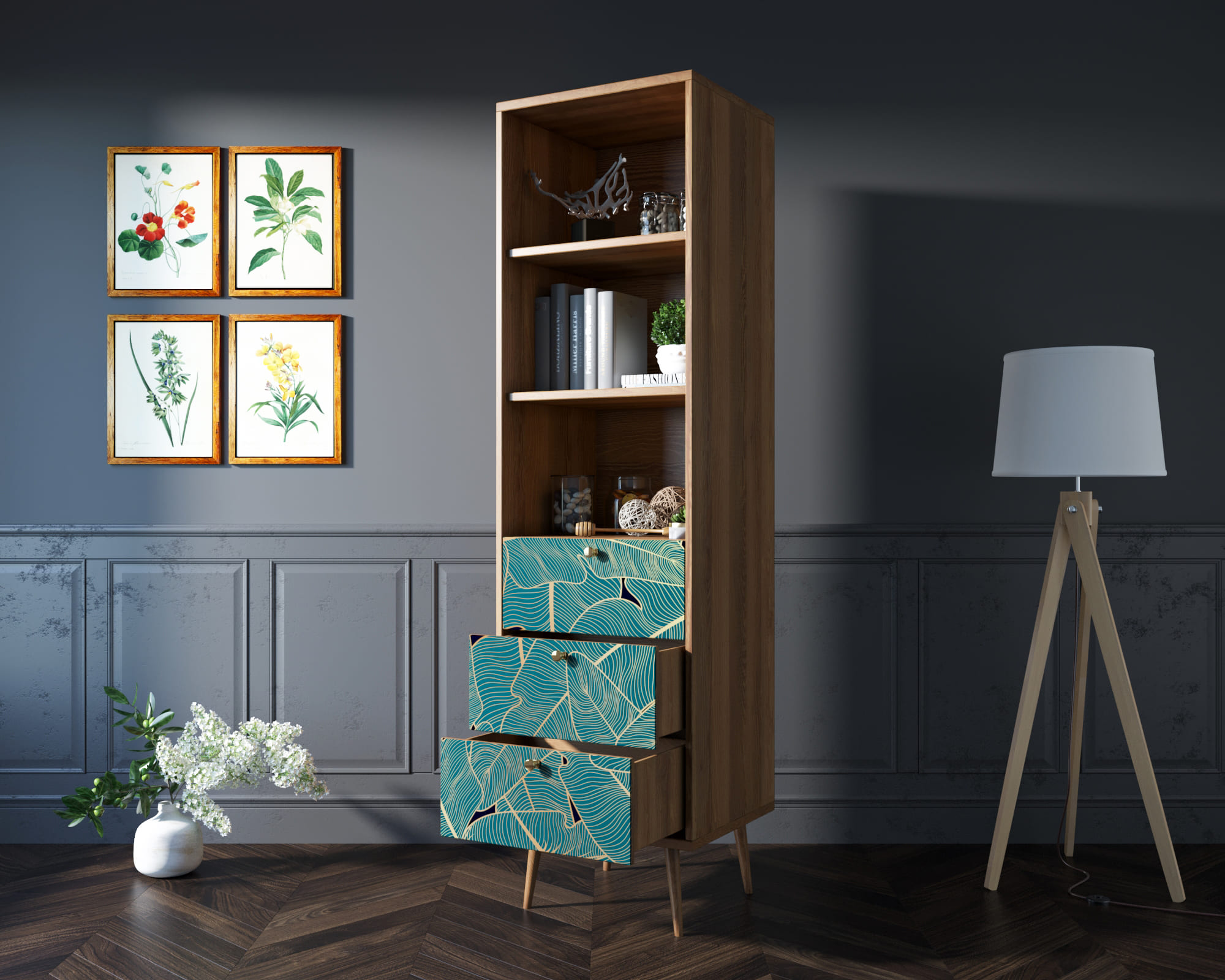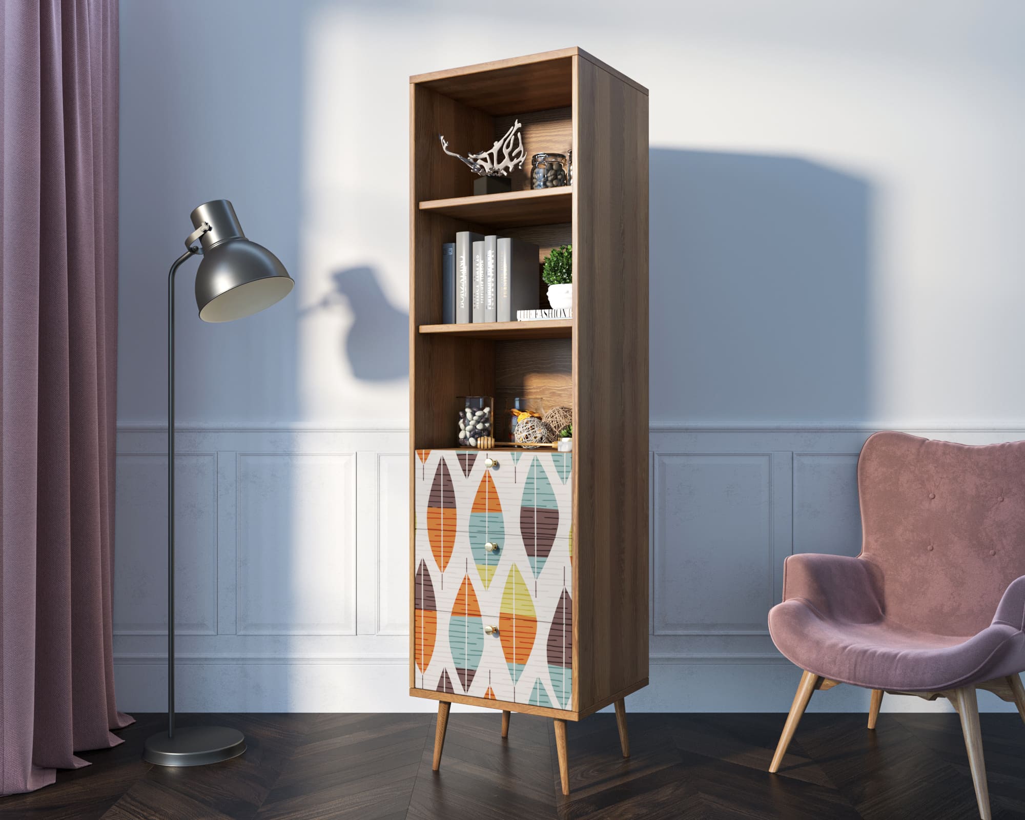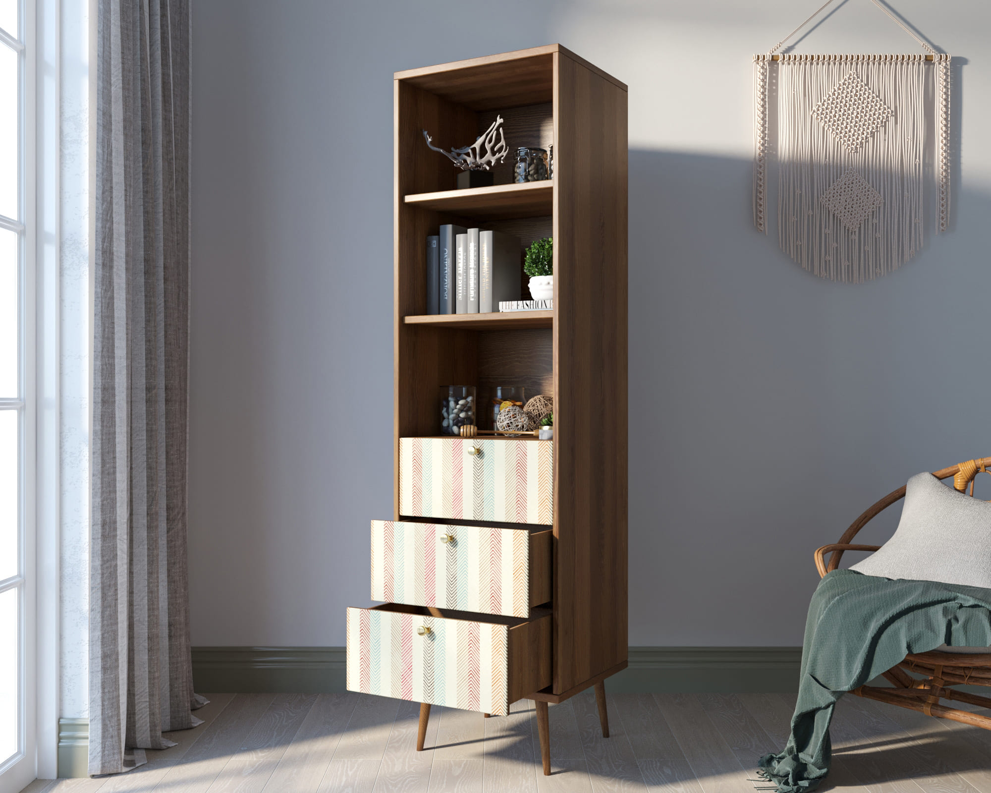 Стильный дизайн. Фасад стеллажа украшен принтом, выполненным в спокойных тонах. Это придаёт изделию элегантность и изысканность, а также позволяет гармонично вписать его в любой интерьер.