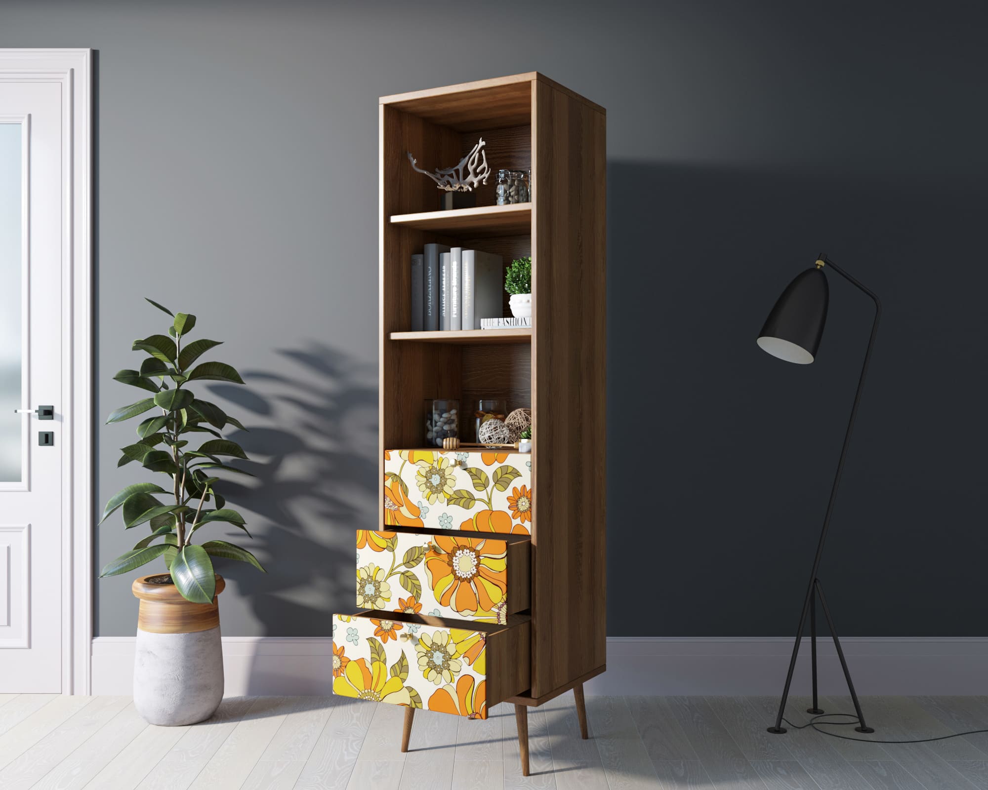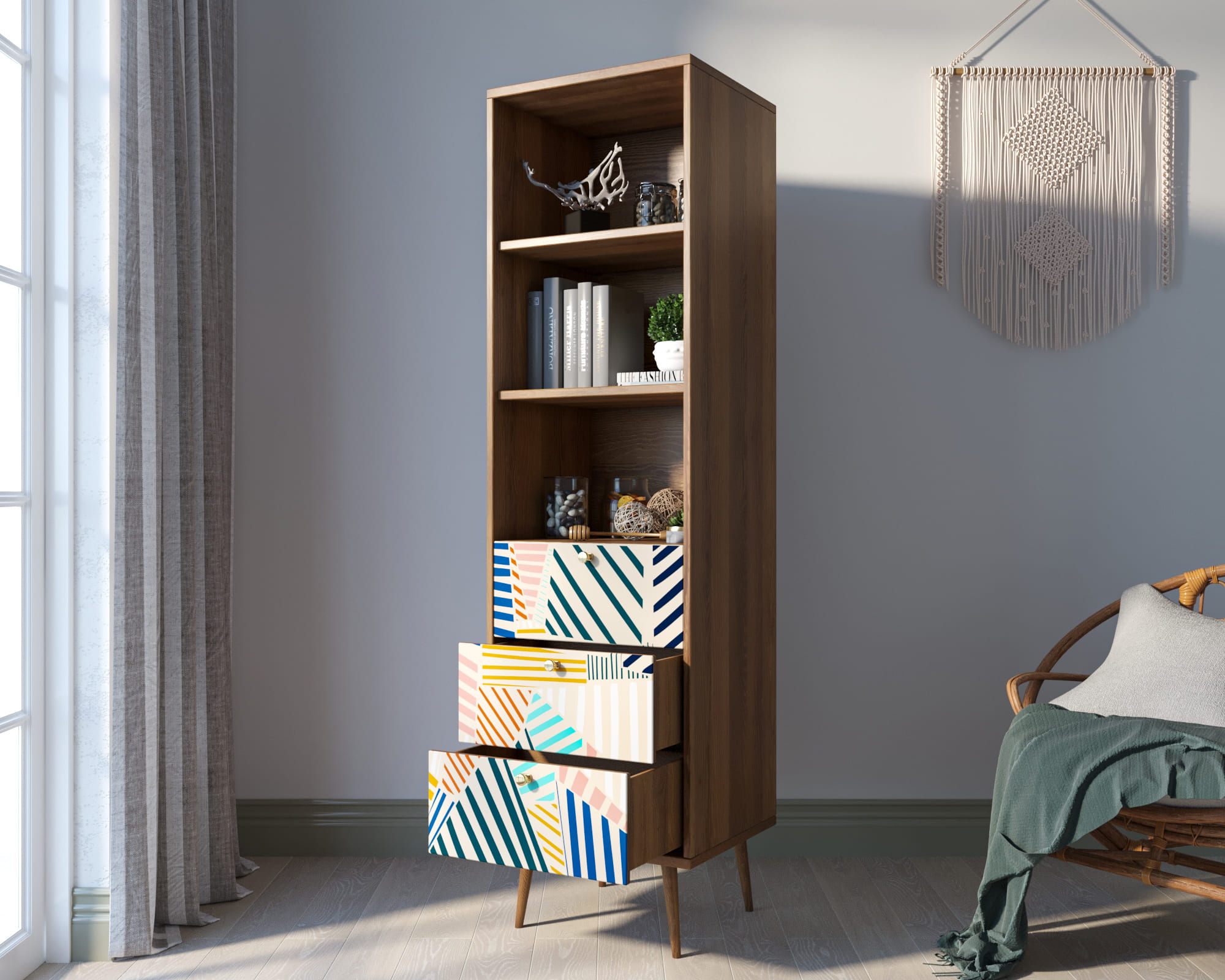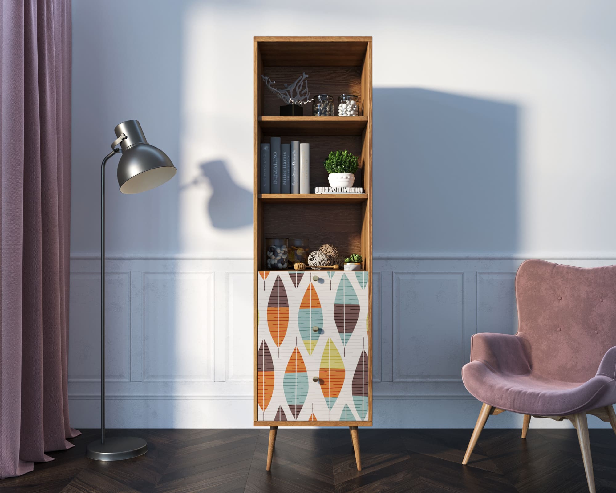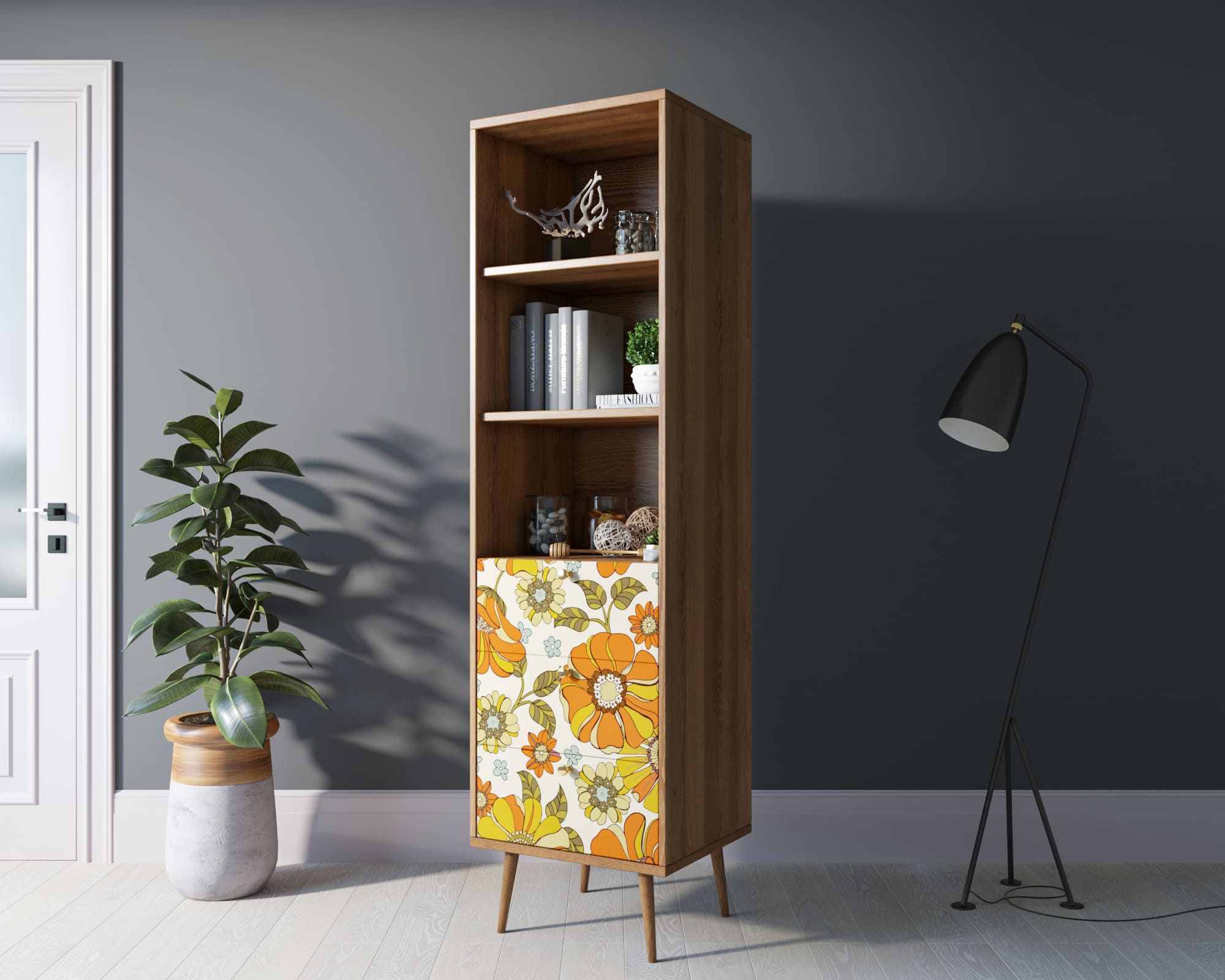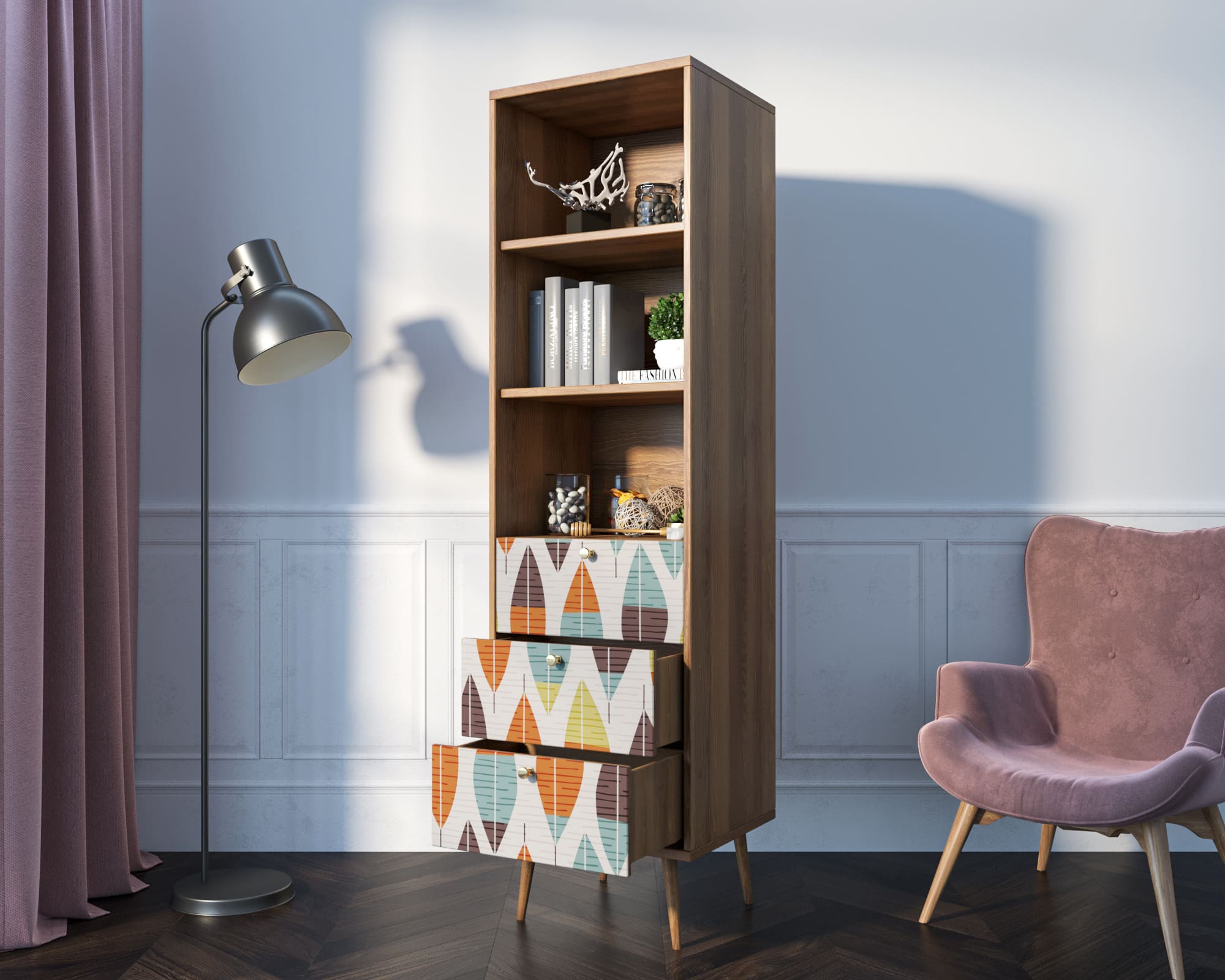Стильный дизайн. Фасад стеллажа украшен принтом, выполненным в спокойных тонах. Это придаёт изделию элегантность и изысканность, а также позволяет гармонично вписать его в любой интерьер.