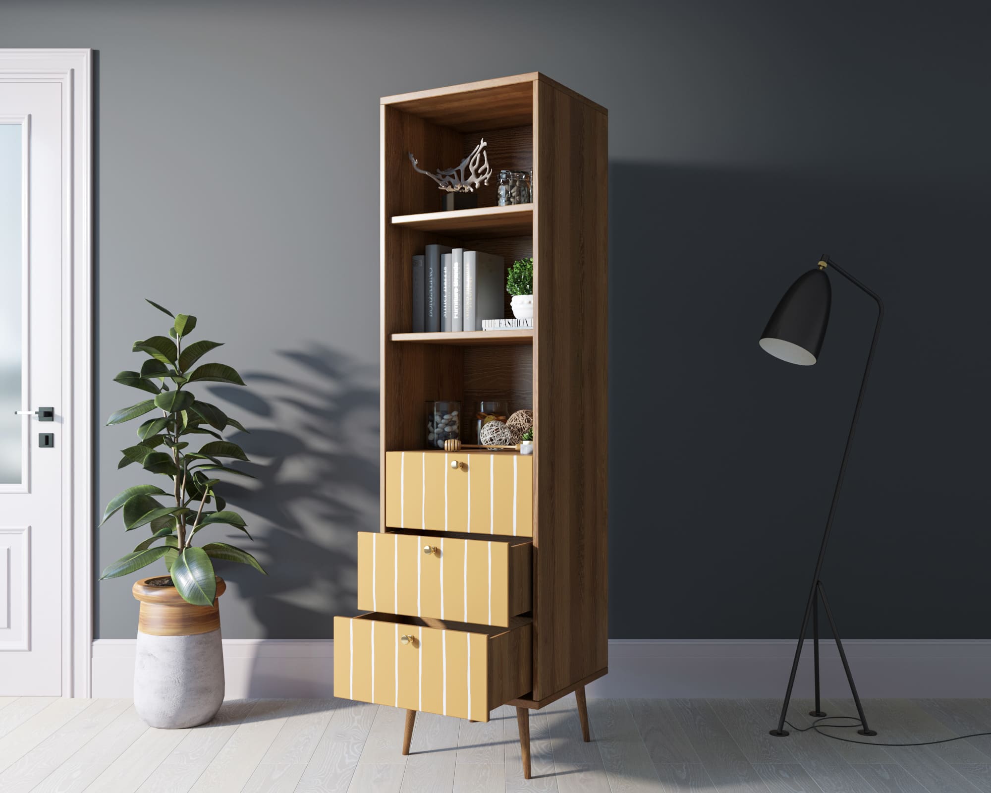Прочность и долговечность. Ножки стеллажа изготовлены из прочного массива ясеня, что обеспечивает устойчивость и надёжность конструкции. Это гарантирует долгий срок службы изделия даже при интенсивном использовании.