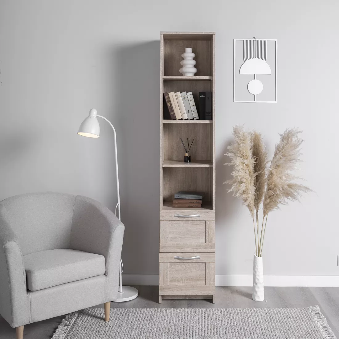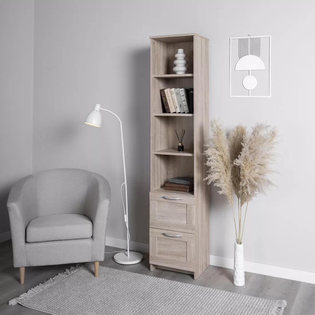благодаря своей узкой конструкции, стеллаж не занимает много места и легко вписывается в любое помещение.