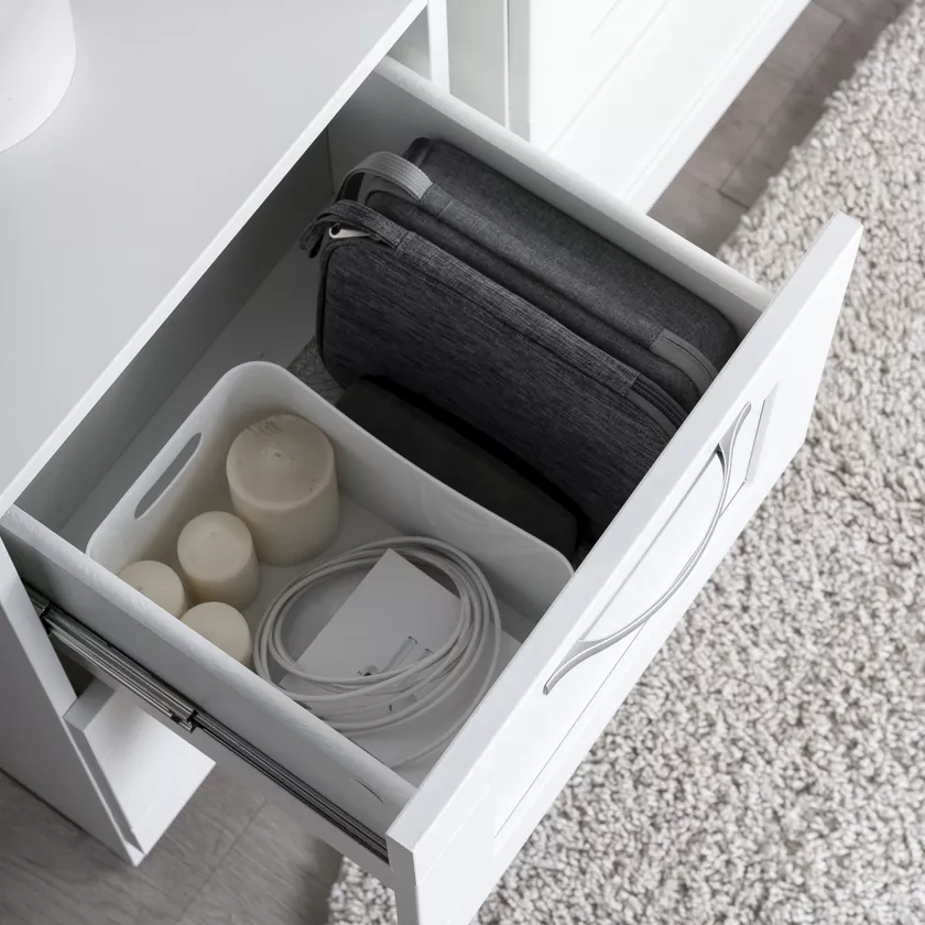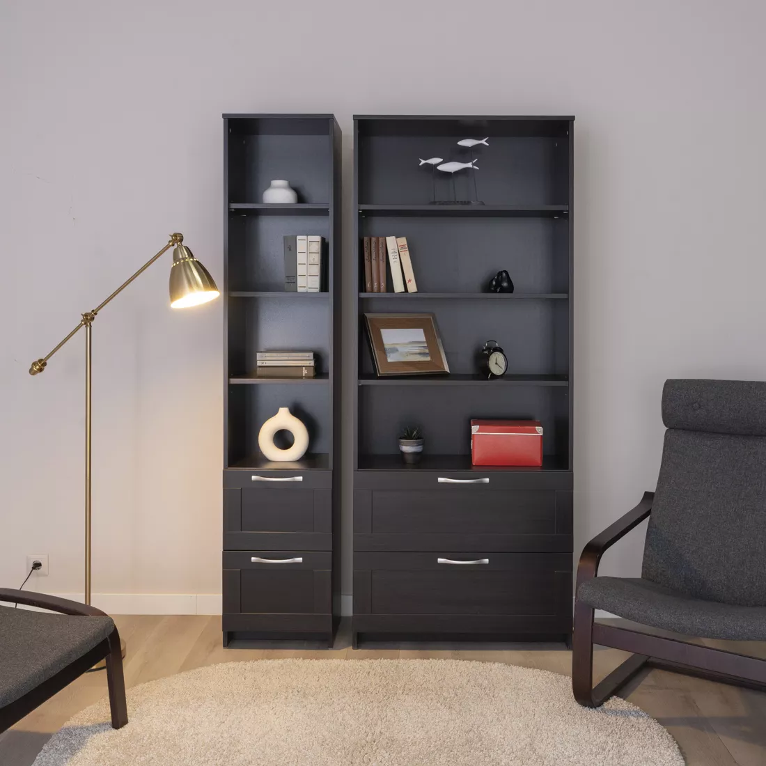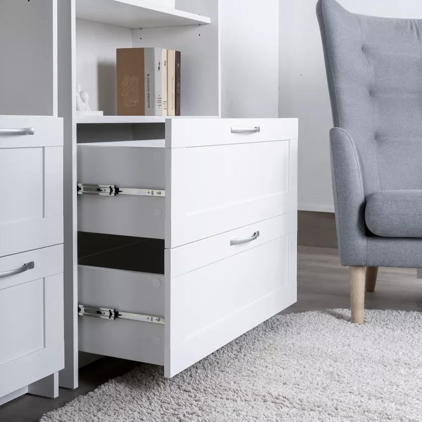 в стеллаже предусмотрены два выдвижных ящика, которые обеспечивают удобный доступ к хранящимся предметам.