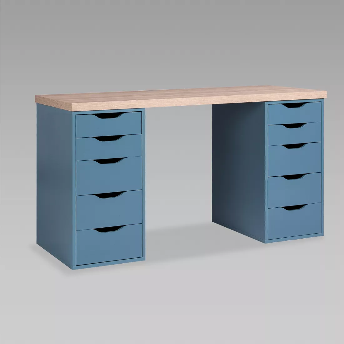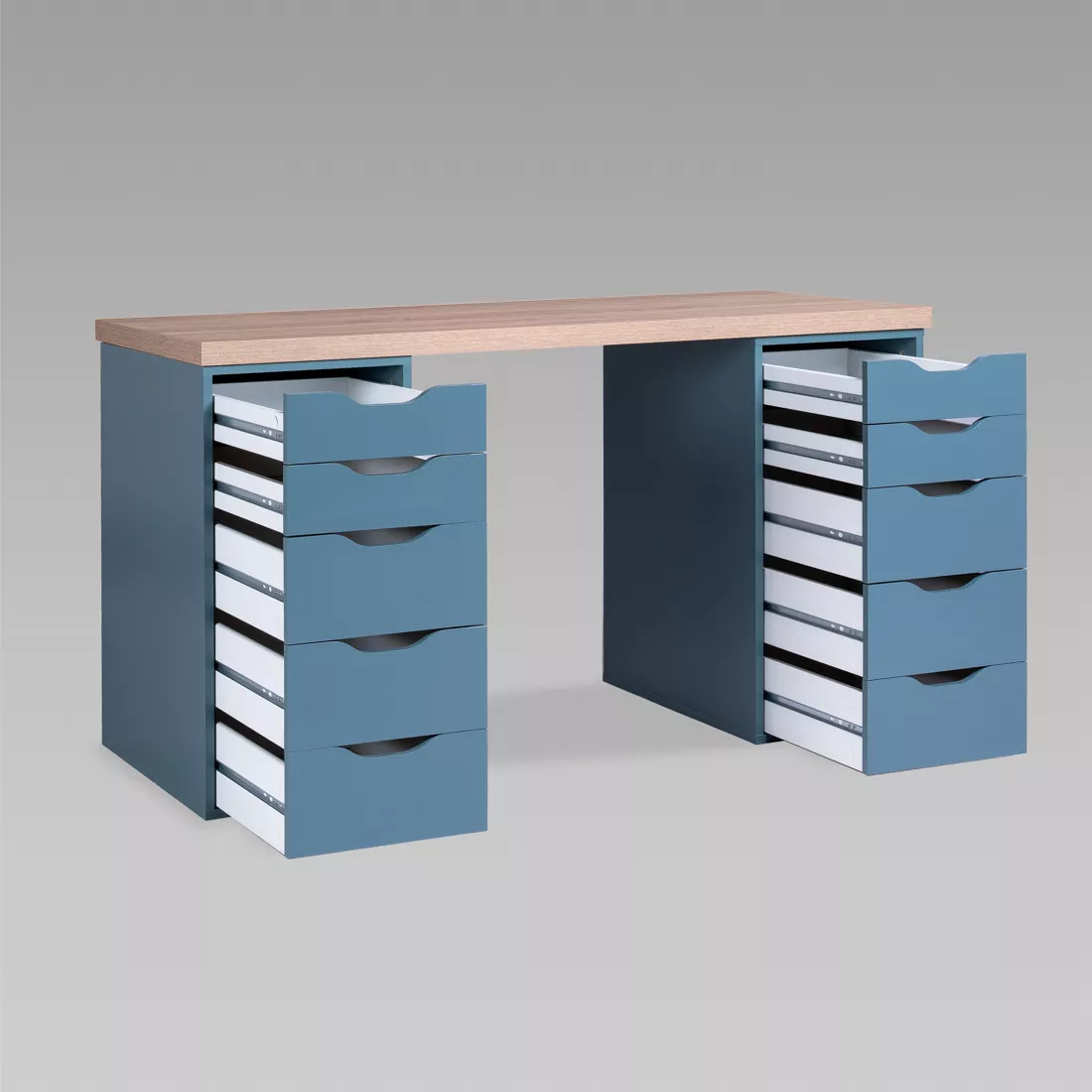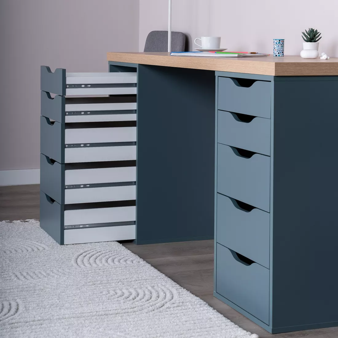 Фасады ящиков без ручек, с вырезами для удобного выдвижения. Ящики переменной высоты позволяют использовать их для хранения разнообразных предметов.