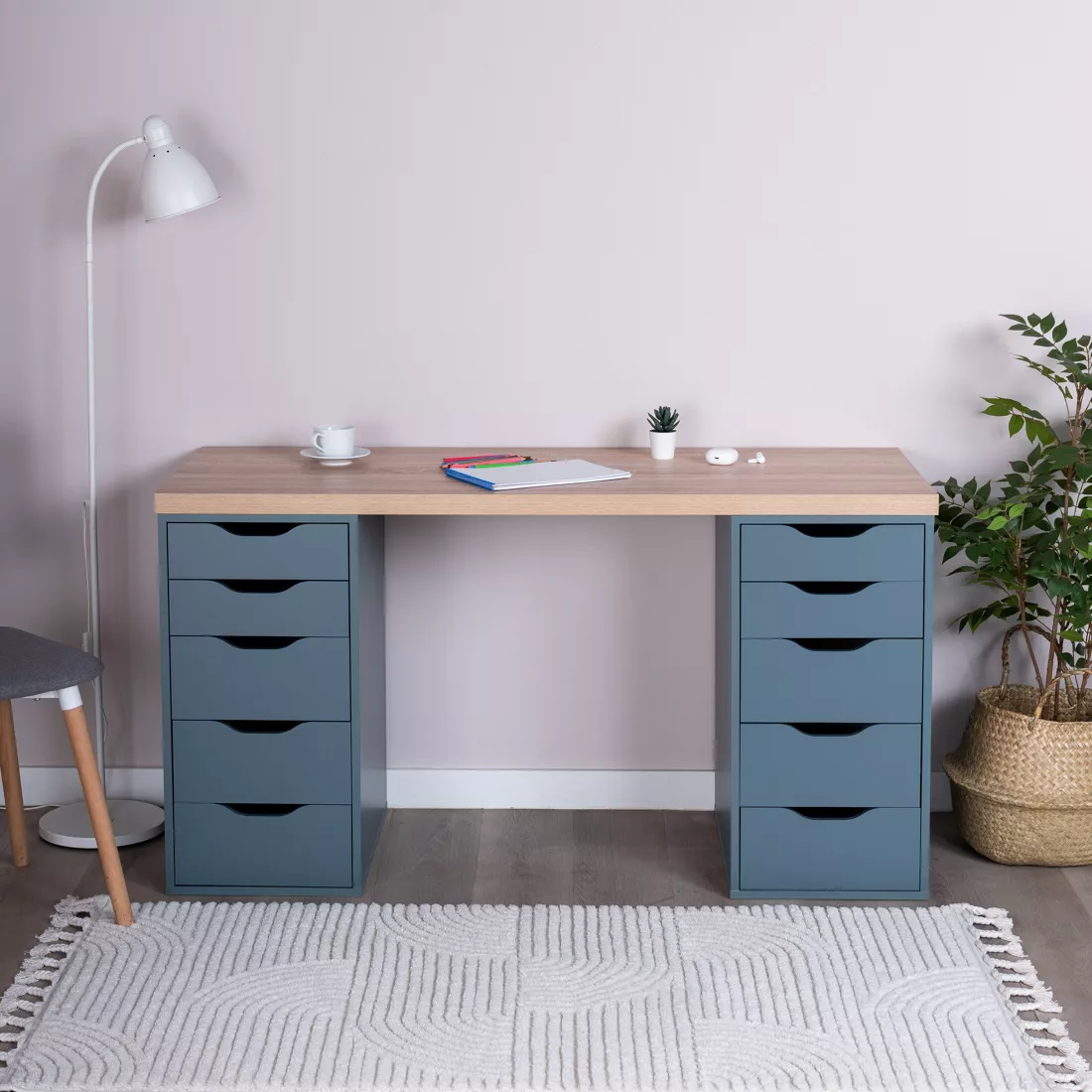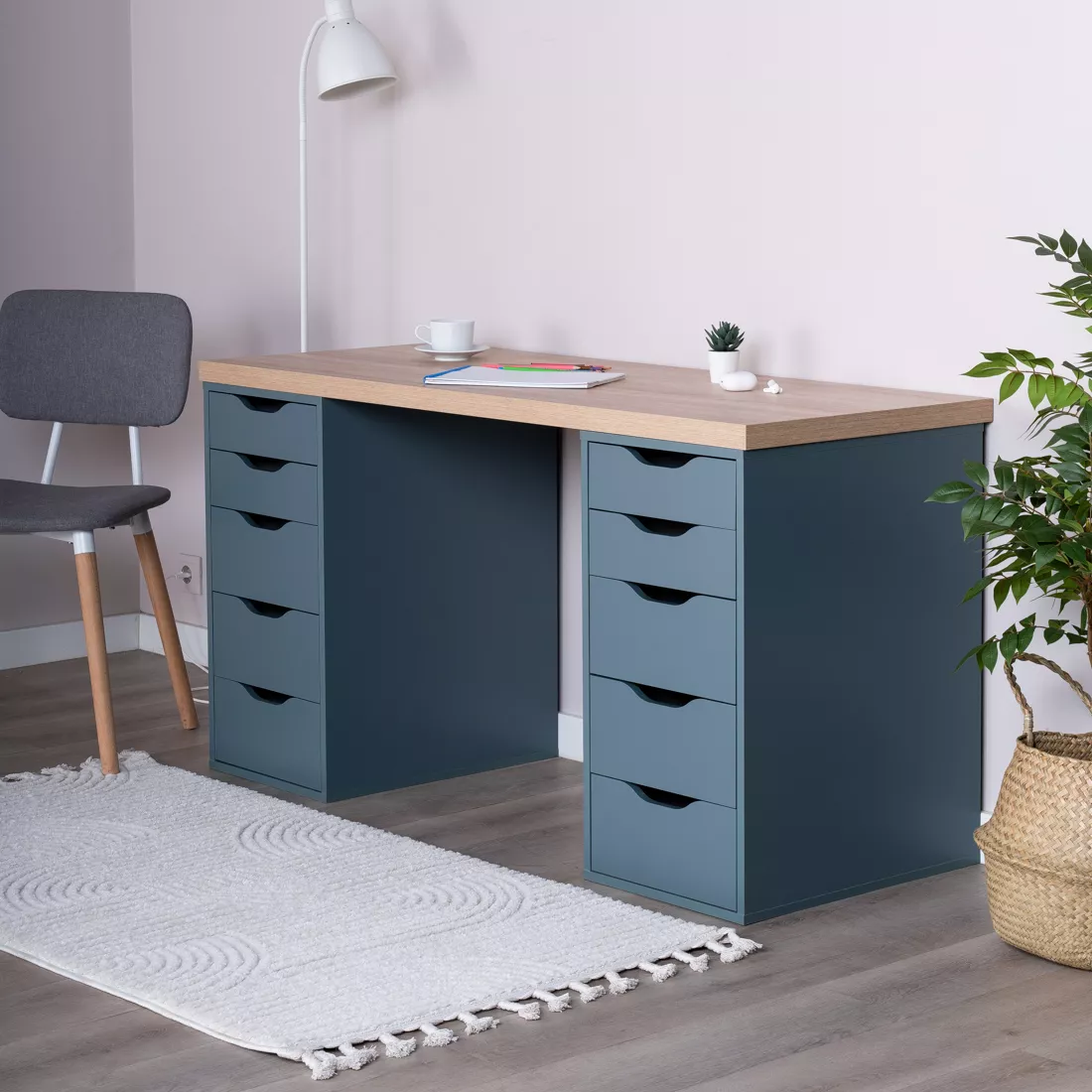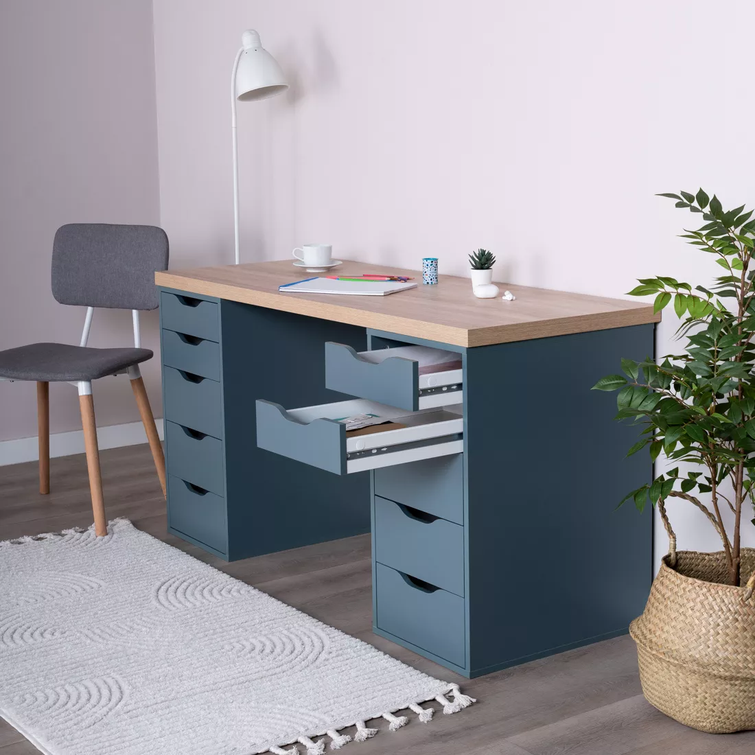 Фасады ящиков без ручек, с вырезами для удобного выдвижения. Ящики переменной высоты позволяют использовать их для хранения разнообразных предметов.