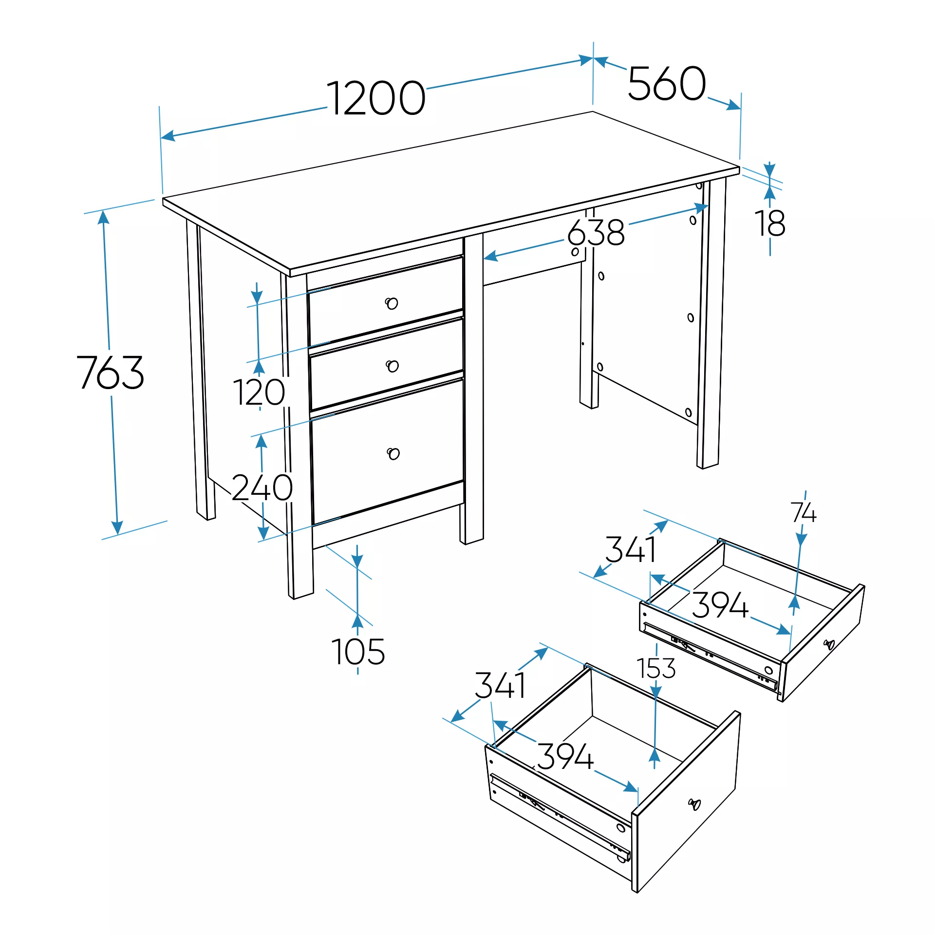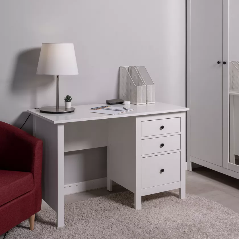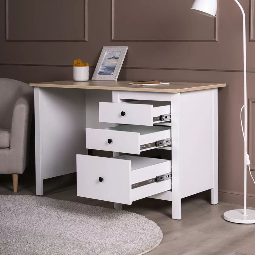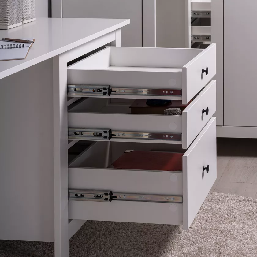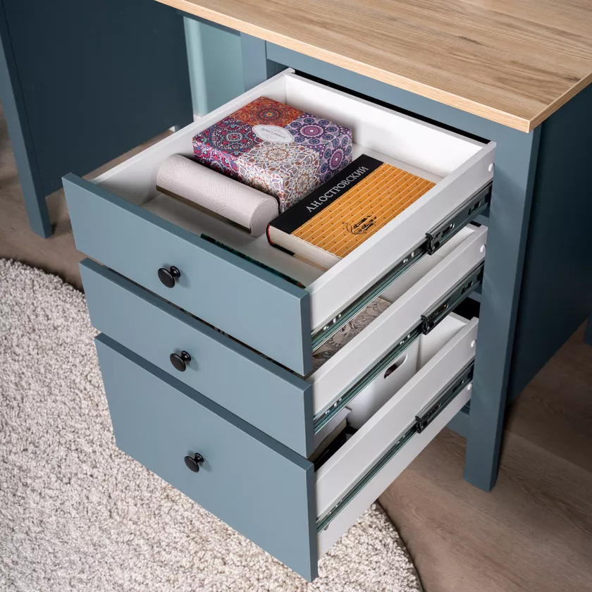 Стол оснащен тремя удобными выдвижными ящиками с направляющими полного выдвижения и доводчиками, которые обеспечивают плавное и бесшумное открывание. Эти ящики предназначены для хранения канцелярии, документов, учебников и других мелочей, которые всегда должны быть под рукой. Такое решение помогает поддерживать порядок и организованность, создавая комфортные условия для работы или учебы.