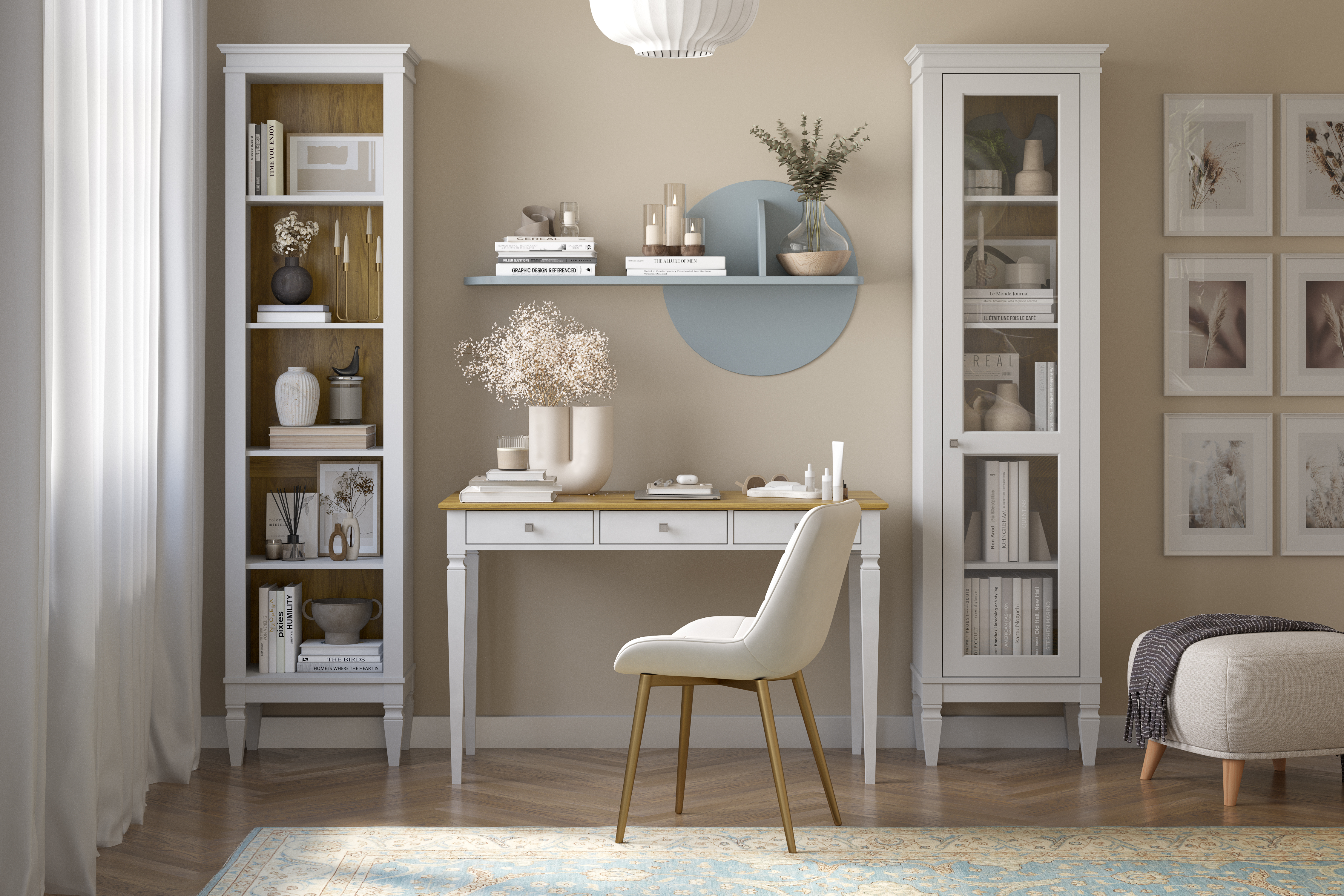 Фурнитура: Направляющие скрытого монтажа со встроенным демпфером (доводчиком плавного закрывания). Ручки - стиль классика, имеют форму квадрата, материал металл, цвет серебро состаренное.