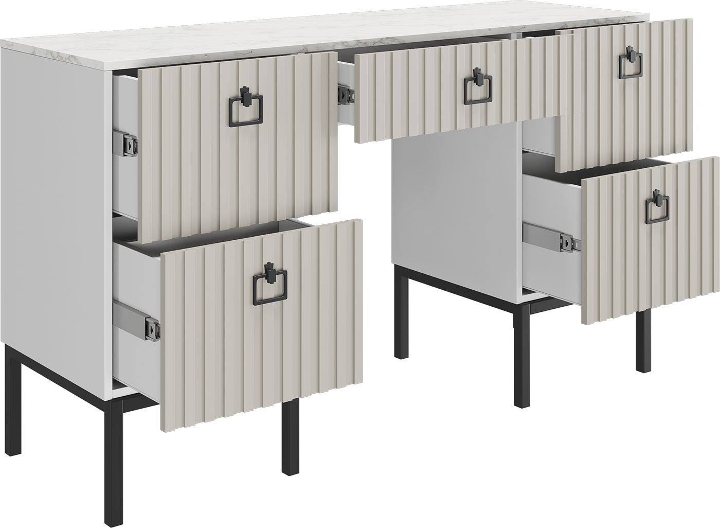 Цвет «Метрополитан Грей/Белый» придаёт изделию благородный и утончённый вид, а светлое цветовое решение визуально расширяет пространство спальни, делая её более светлой и просторной. Конструкция из ЛДСП и МДФ обеспечивает надёжность и долговечность стола в повседневной эксплуатации.