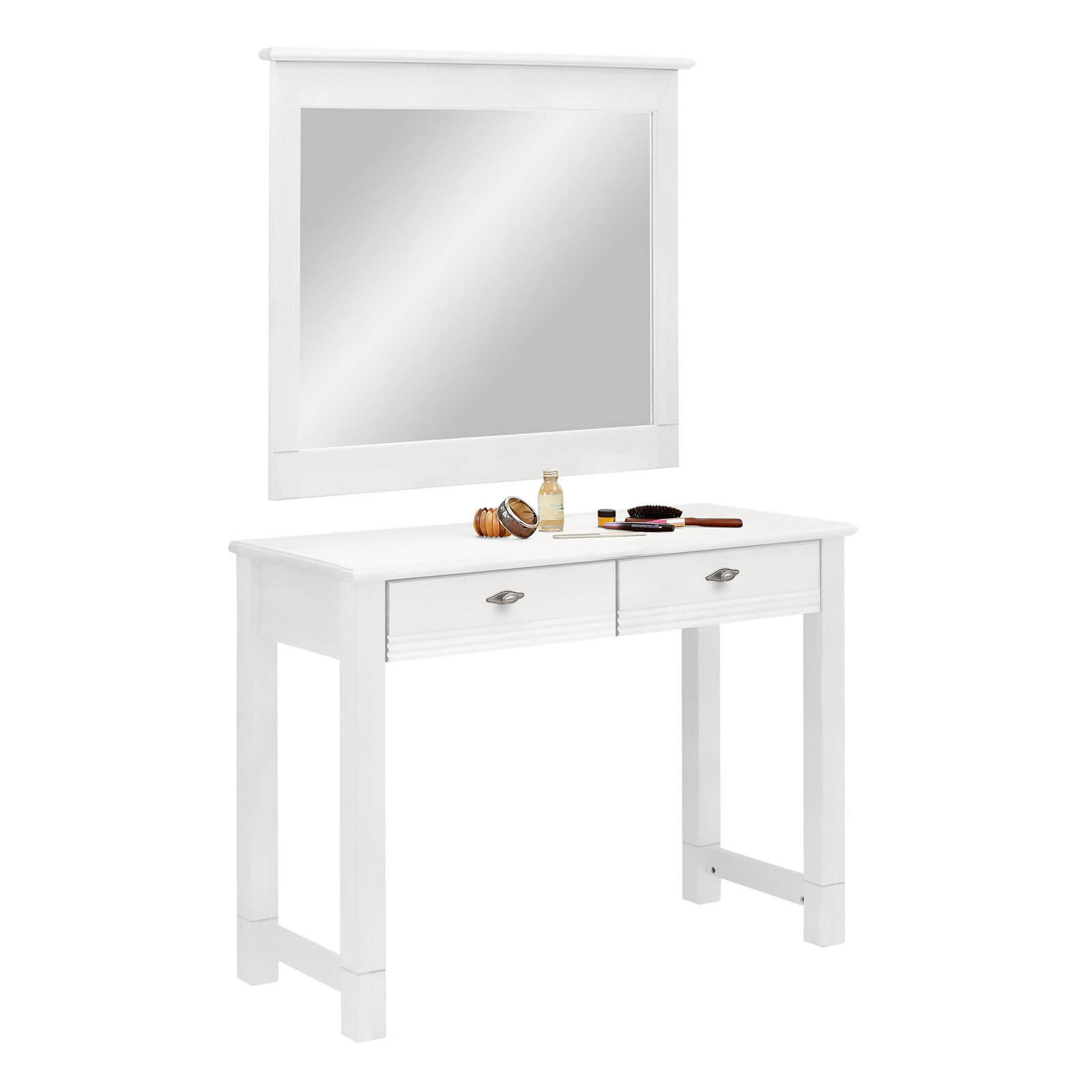 Капли тонального крема, жидкие тени или тушь, попавшие на столешницу, не редкость для сборов впопыхах. Поэтому поверхности этого изделия покрыты водными лаками и красками, которые надежно защищают древесину от попадания влаги и жира. Следуйте простому правилу: удалять загрязнения сразу после их появления. И тогда мебель будет сиять белизной долгие годы.