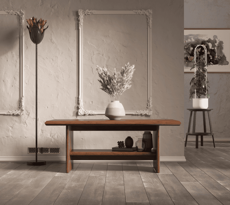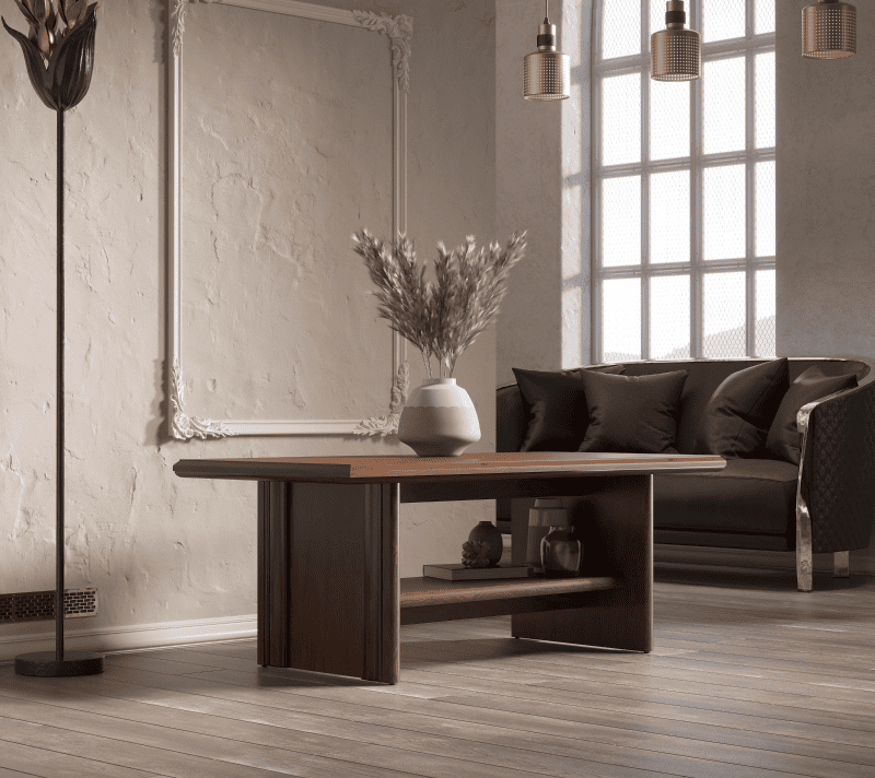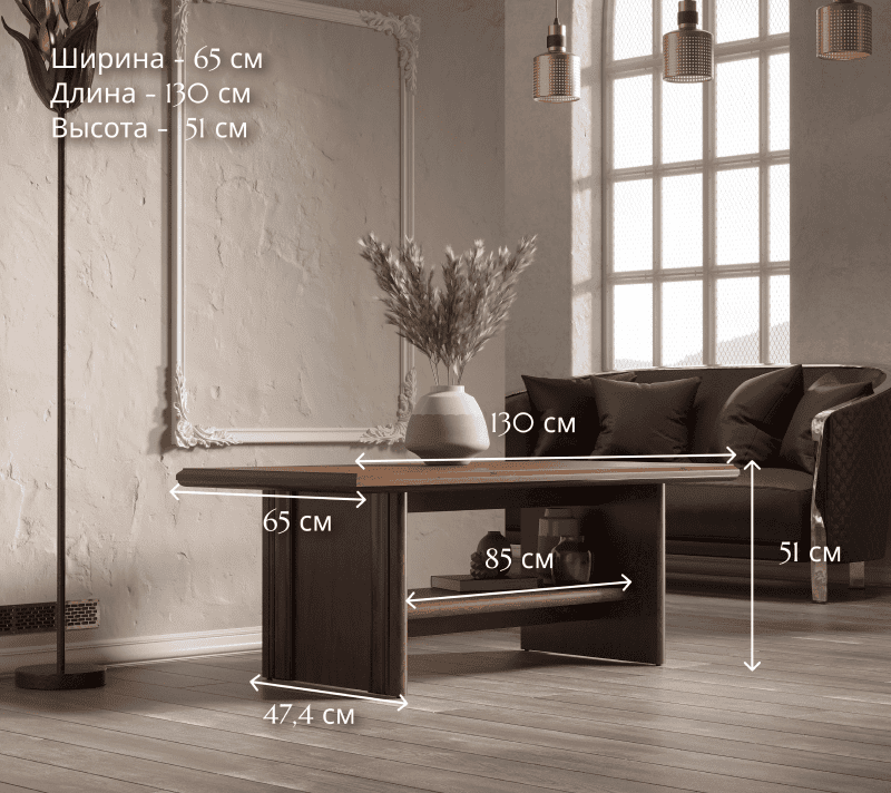 Отличительная черта столика — простой и лаконичный дизайн. Просторная верхняя поверхность с легкостью поместит на себе вазы с цветами, элементы декора, книги, напитки или даже ноутбуки. Встроенная полка снизу предоставляет дополнительное пространство для расположения необходимых вещей.