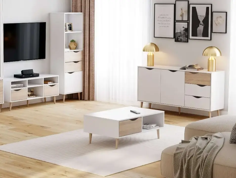 Серия «Соната» отличается простотой и натуральностью, выполнена в естественных тонах. В дизайне отчетливо улавливаются отсылки к скандинавской эстетике: чистые линии корпуса, использование белого цвета в отделке фасадов, расставленные в стороны высокие стильные опоры, выполненные из массива березы.