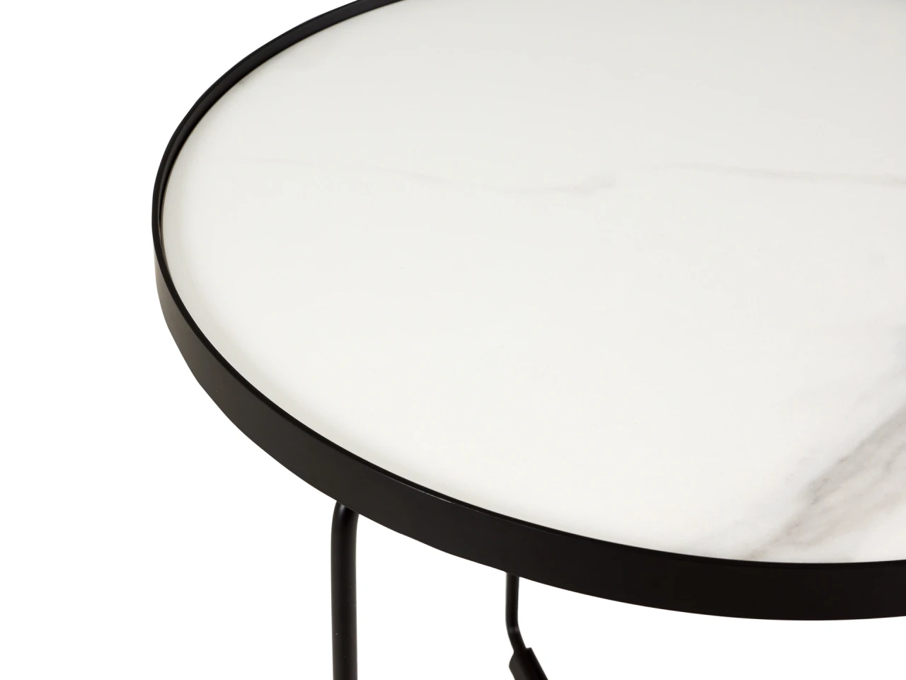 Материал столешницы - верхний слой из спеченного камня с фактурой под керамику на плите из МДФ, установленная на металлическое основание черного матового цвета круглой формы.