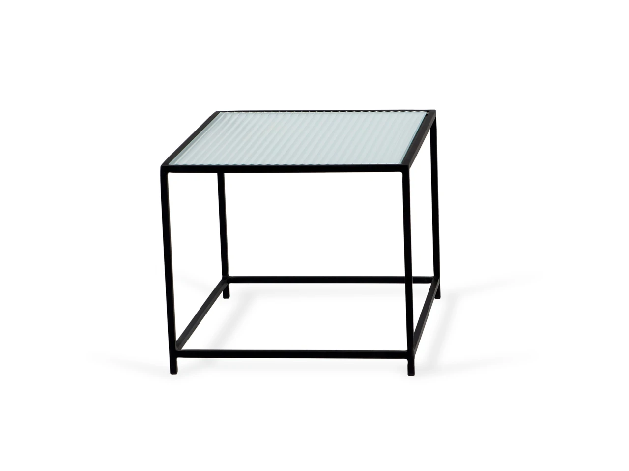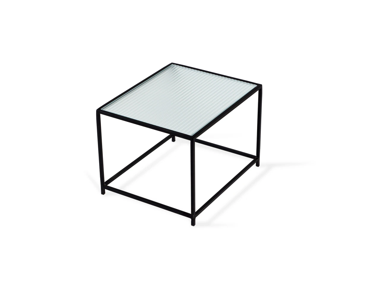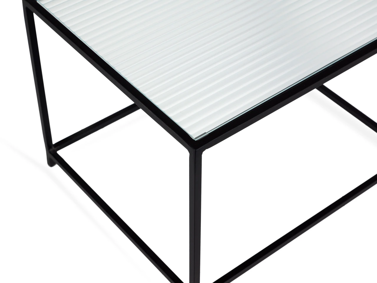 Каркас металлический с черным матовым покрытием. Стеклянная столешница выполнена из прозрачного рифленого стекла. Столешница укладывается сверху на резиновые демпферы, расположенные в углах каркаса.