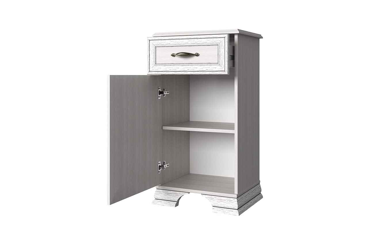 Напольная тумба Tiffany 1D1S цвета вудлайн кремовый оформлена в классическом стиле, что подтверждает наличие резных ножек и светлой поверхности с продольными бороздками. Фасады тумбочки имеют древесную текстуру, максимально приближенную к естественному материалу. Эта строгая и элегантная мебель подходит для разных типов помещений: молодежных комнат, спален и гостиных.