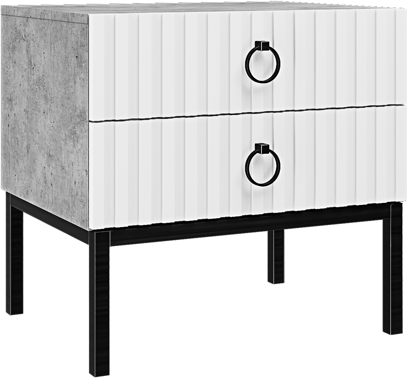 Удачное сочетание материалов и оттенков придаёт тумбе особый шарм: корпус из ЛДСП в цвете «Метрополитан Грей» создаёт основательную базу, а фасад из МДФ добавляет композиции сдержанной элегантности. Изящные чёрные ручки‑кольца выступают стильным акцентом, подчёркивающим индустриальный дух стиля лофт.
