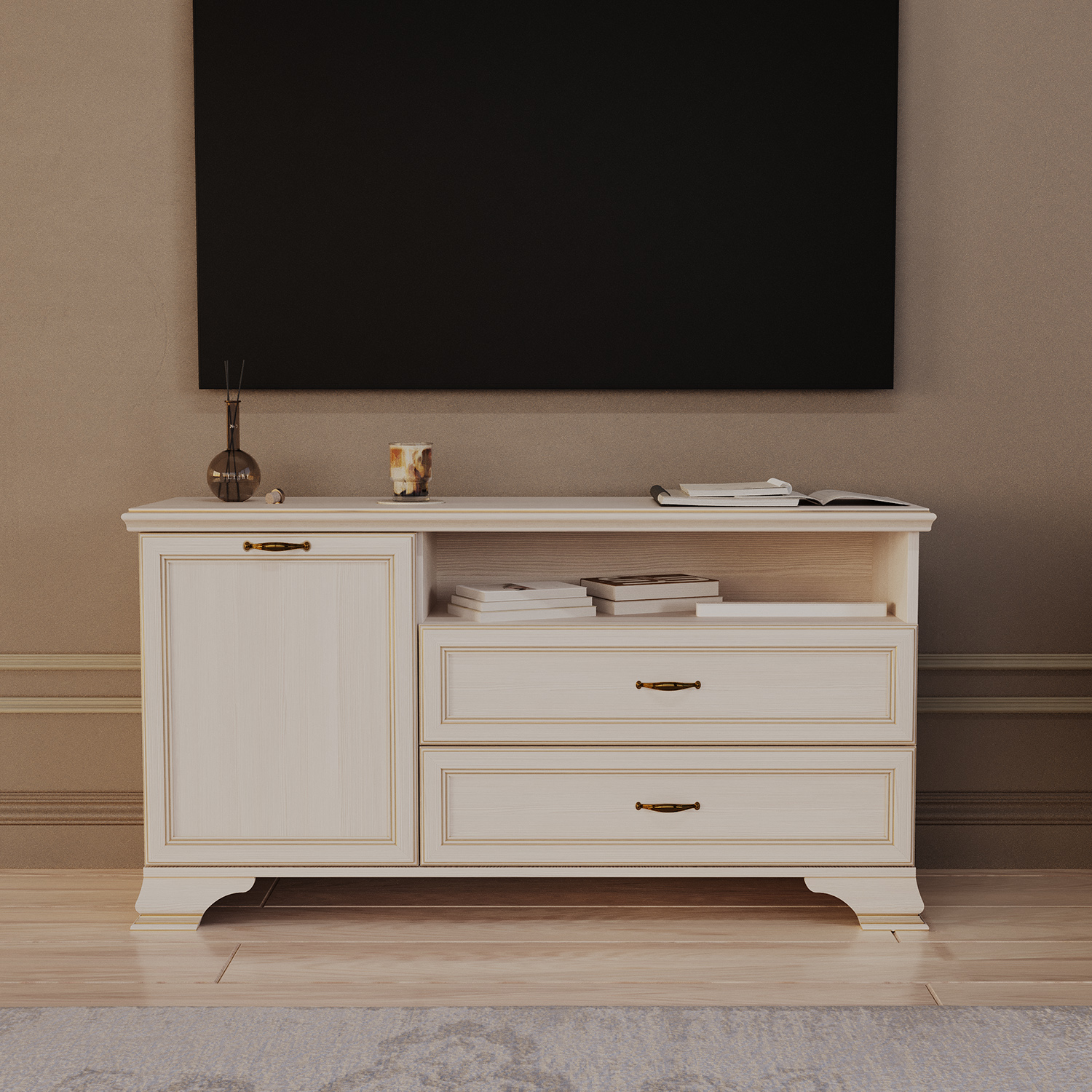 Дизайн выдержан в тёплой светлой гамме: корпус из ЛДСП 16 мм оттенка «Бодега белый» дополнен декоративными накладками, профильным оформлением крышки и эффектными опорами из МДФ. Акценты в виде золотой патины и ручек цвета «старая бронза» придают модели благородный облик.