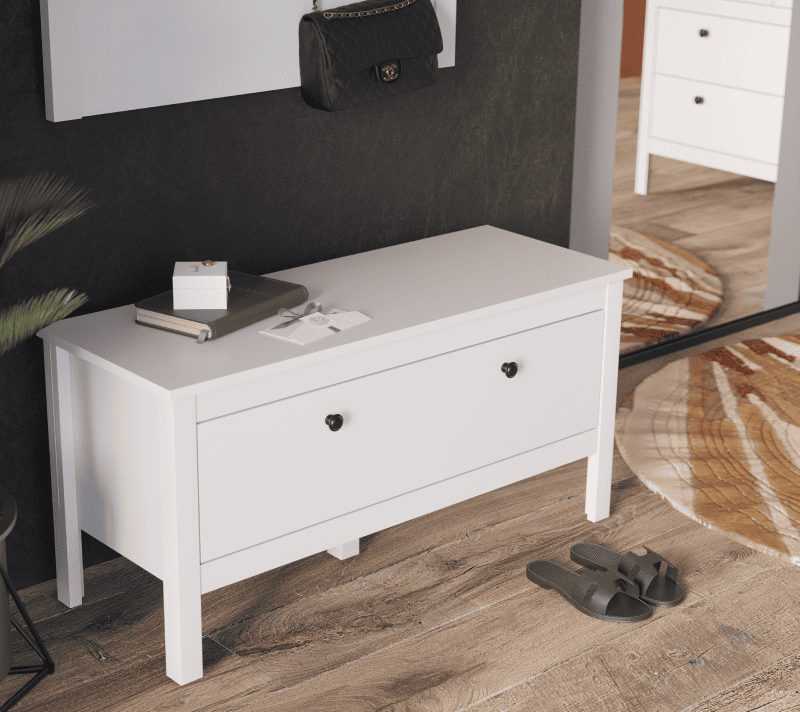 Тумба для обуви Ewa (Helga) белый KOM1K/90 гармонично смотрится в комплекте с вешалкой из одноименной коллекции.