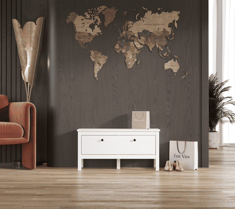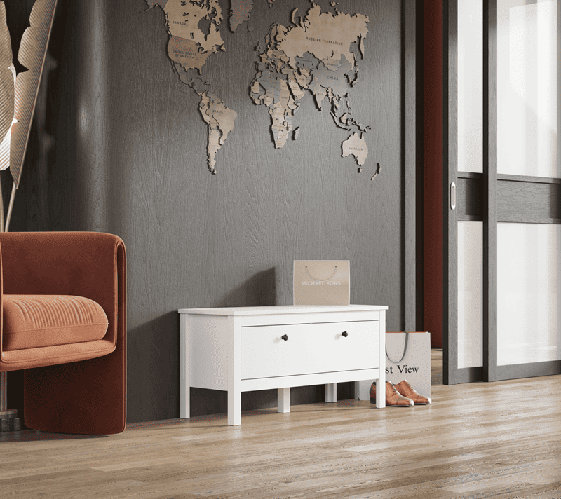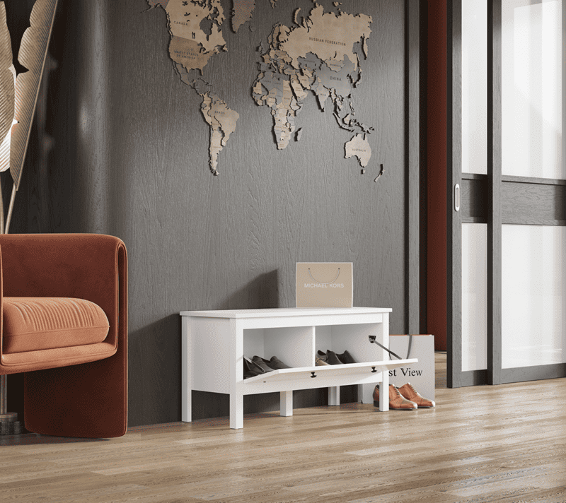 Обувница имеет простую, но надежную конструкцию. Откидная дверца предоставляет доступ к двум вместительным нишам. Вы можете хранить обувь как внутри, так и под тумбой, благодаря высоким ножкам.