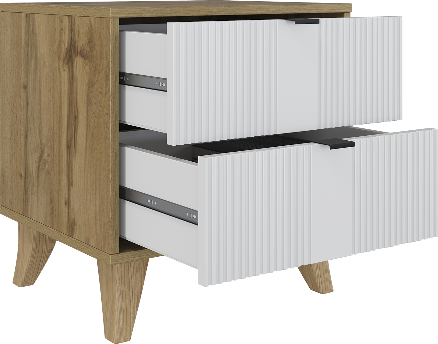 Фрезерованный белый матовый фасад придаёт модели утончённый вид и визуально гармонирует с любым интерьером, а корпус в оттенке «Дуб вотан» добавляет теплоты и подчёркивает естественную эстетику. Строгие прямые линии отражают лаконичность скандинавского дизайна: тумба не перегружает пространство, а аккуратно дополняет его.