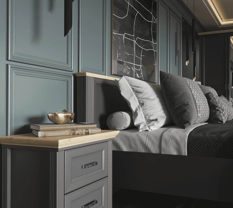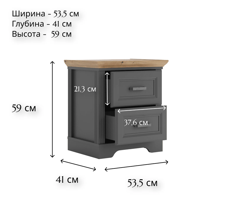 Тумбочка имеет два просторных выдвижных ящика для хранения необходимых вещей. Акцентная столешница предоставляет дополнительное место для размещения часов, цветов, фоторамок и других элементов декора. Ящики оснащены механизмом бесшумного закрытия.