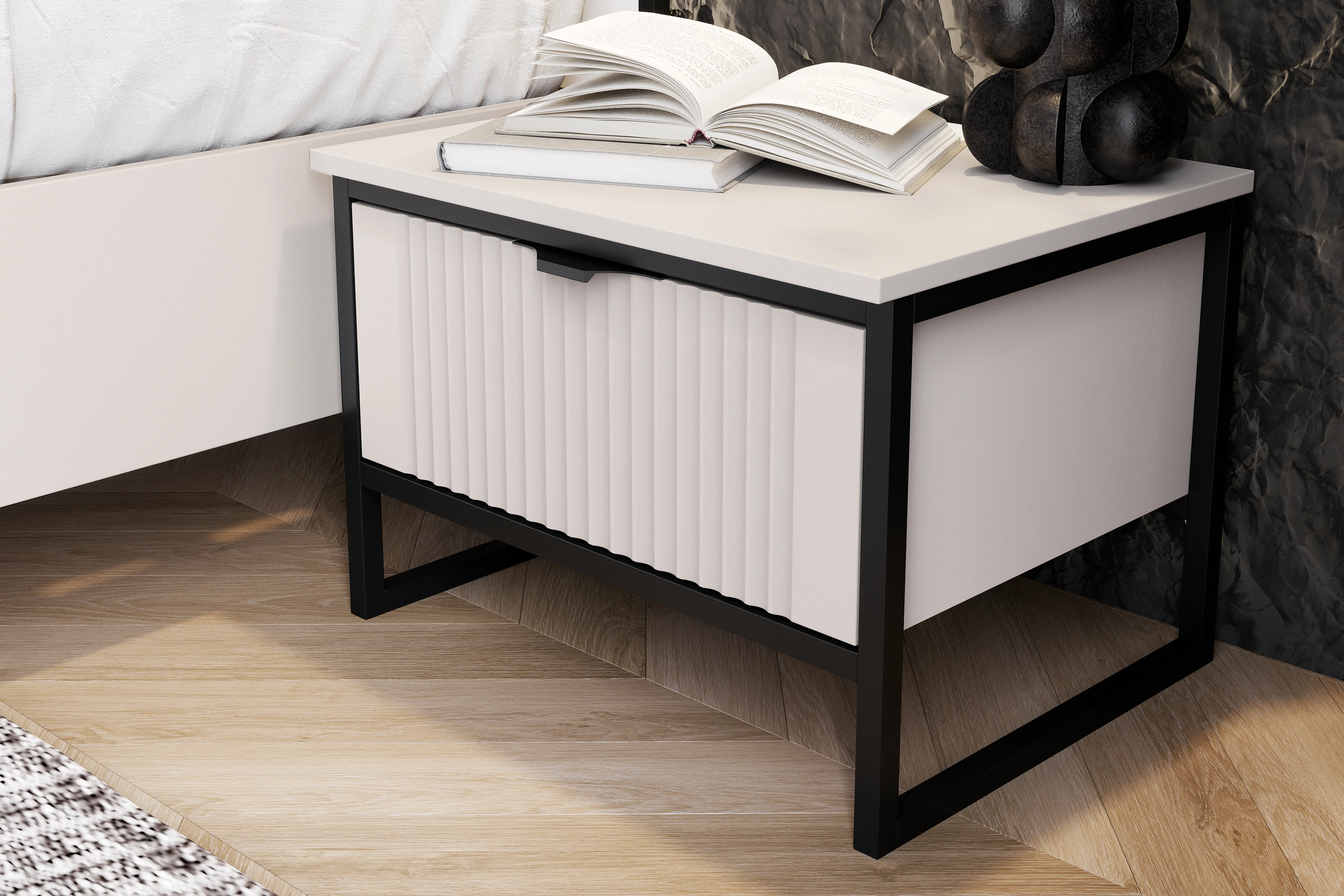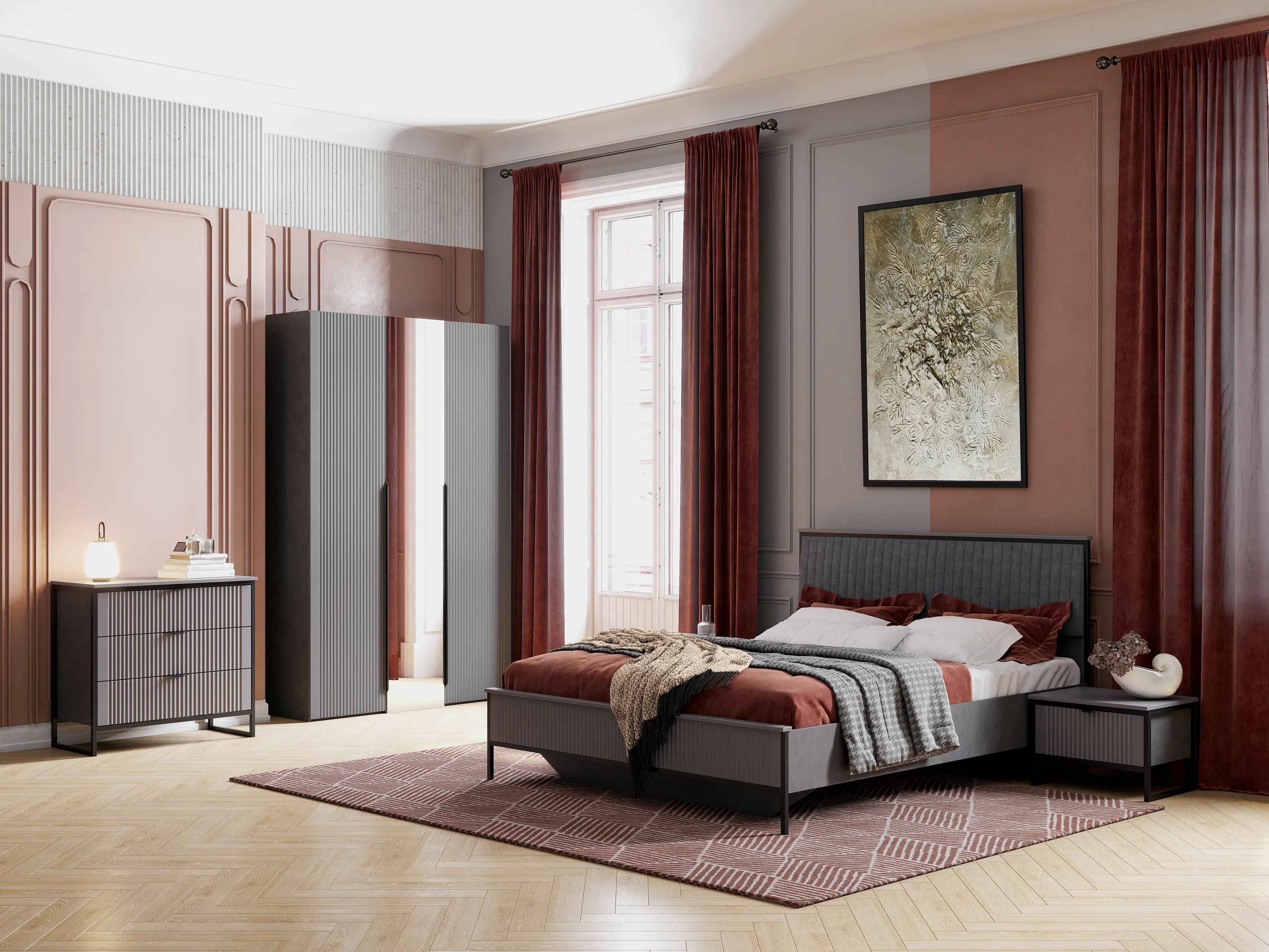 Коллекцию модульной спальни "Нора" отличает современный оригинальный стиль. Декоративная продольная фрезеровка на фазадах из МДФ и опоры на металлокаркасе цвета "Черная эмаль" соответствуют модным тенденциям этого года в ведущих зарубежных коллекциях.