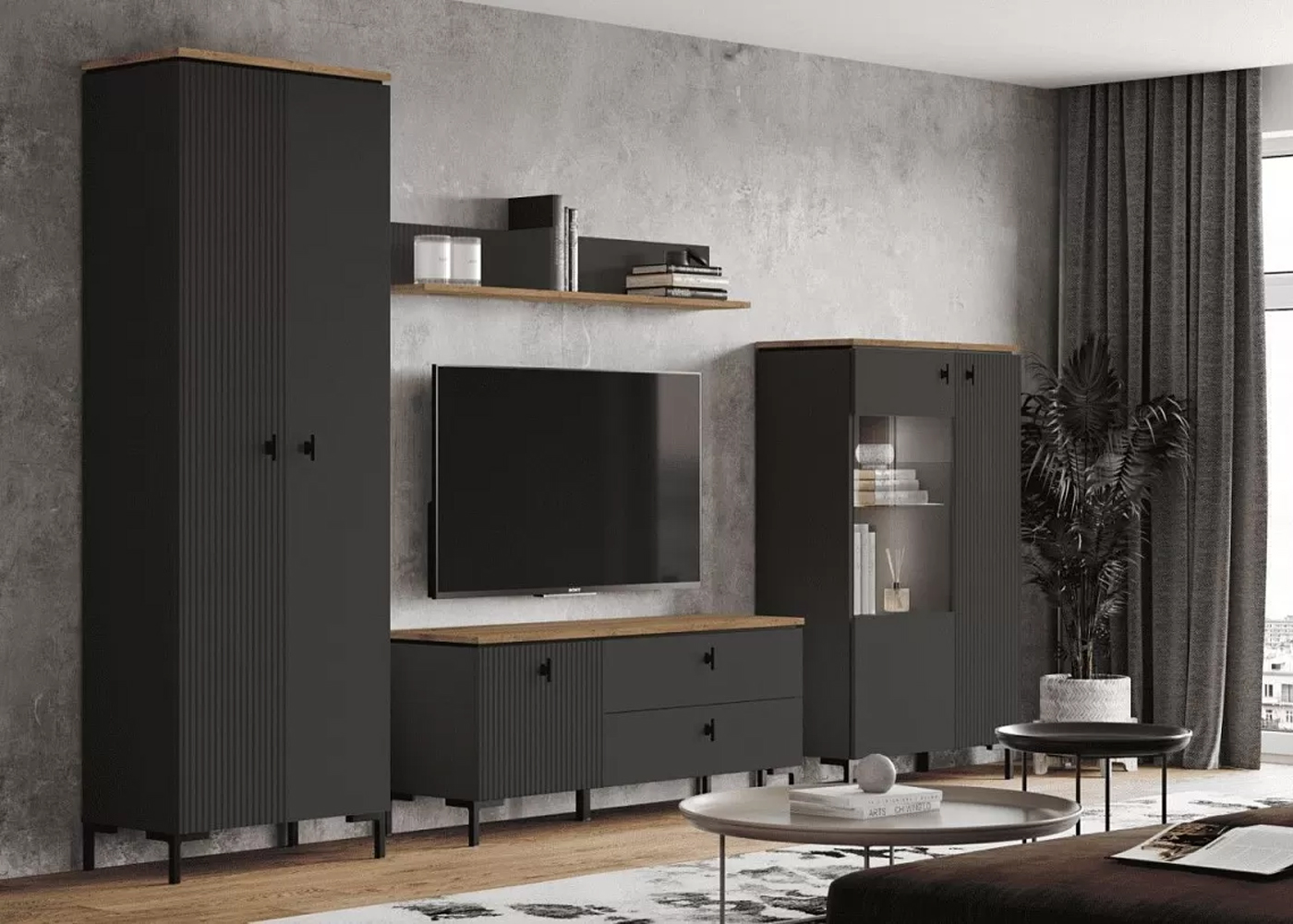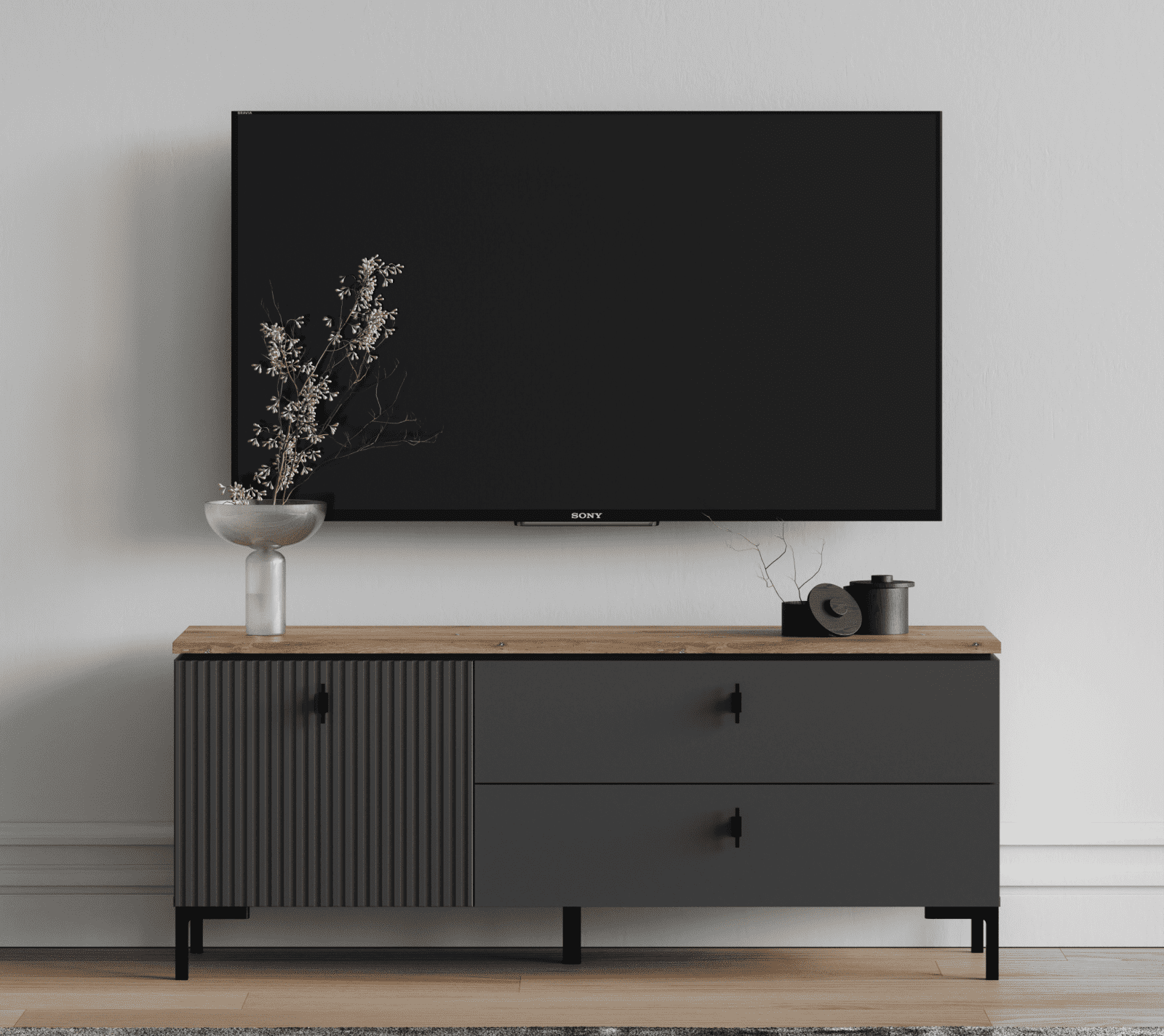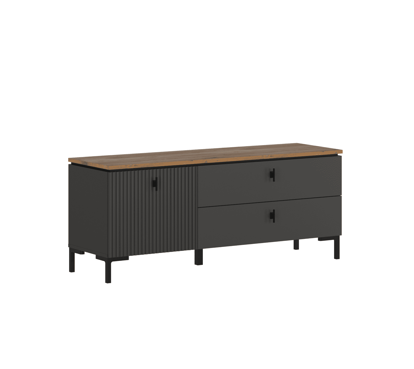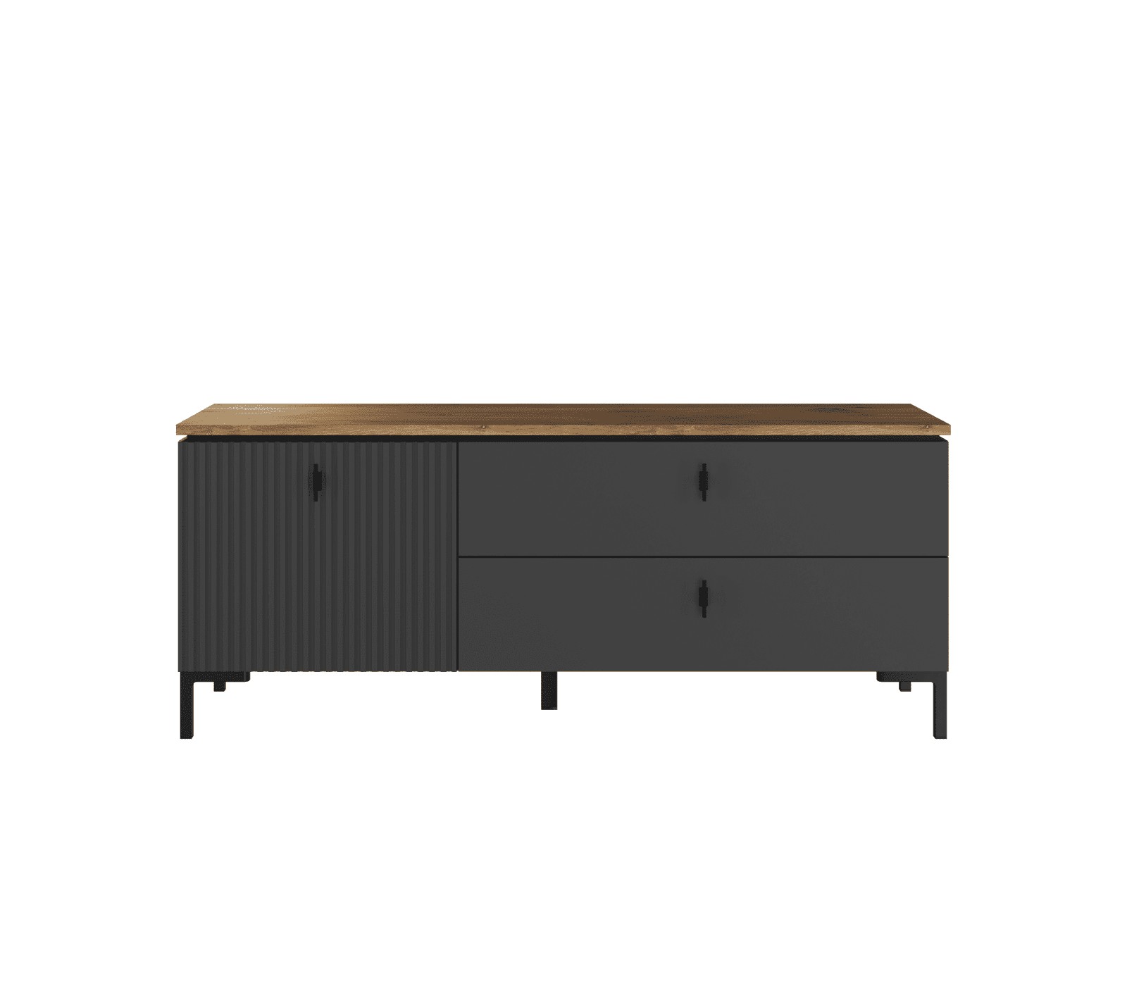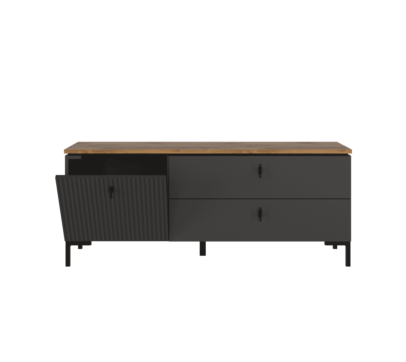 Просторная столешница в натуральном цвете дуб нокс позволяет разместить как телевизор, так и аудио и видео аппаратуру. Выдвижные ящики оснащены шариковыми направляющими и гарантируют плавное закрывание. Откидная рельефная дверца скрывает просторный отдел, где вы можете хранить необходимые вещи.