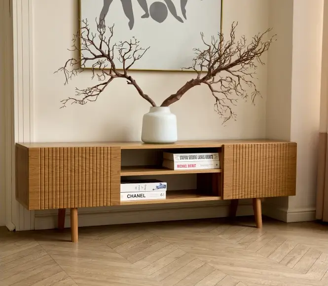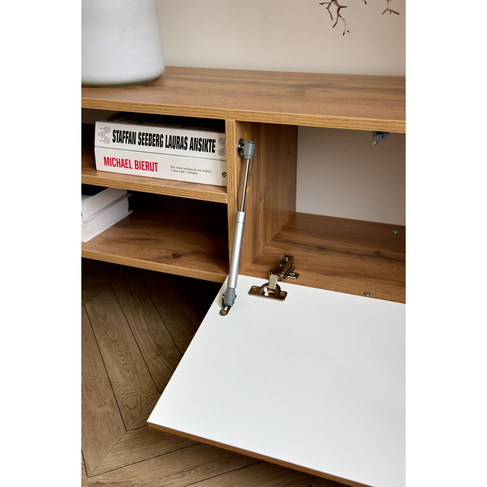 Тумба под ТВ этой модели имеет фасад из материала мдф. Это безопасный для здоровья и долговечный материал, который сохраняет свой внешний вид.