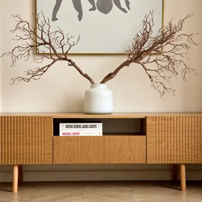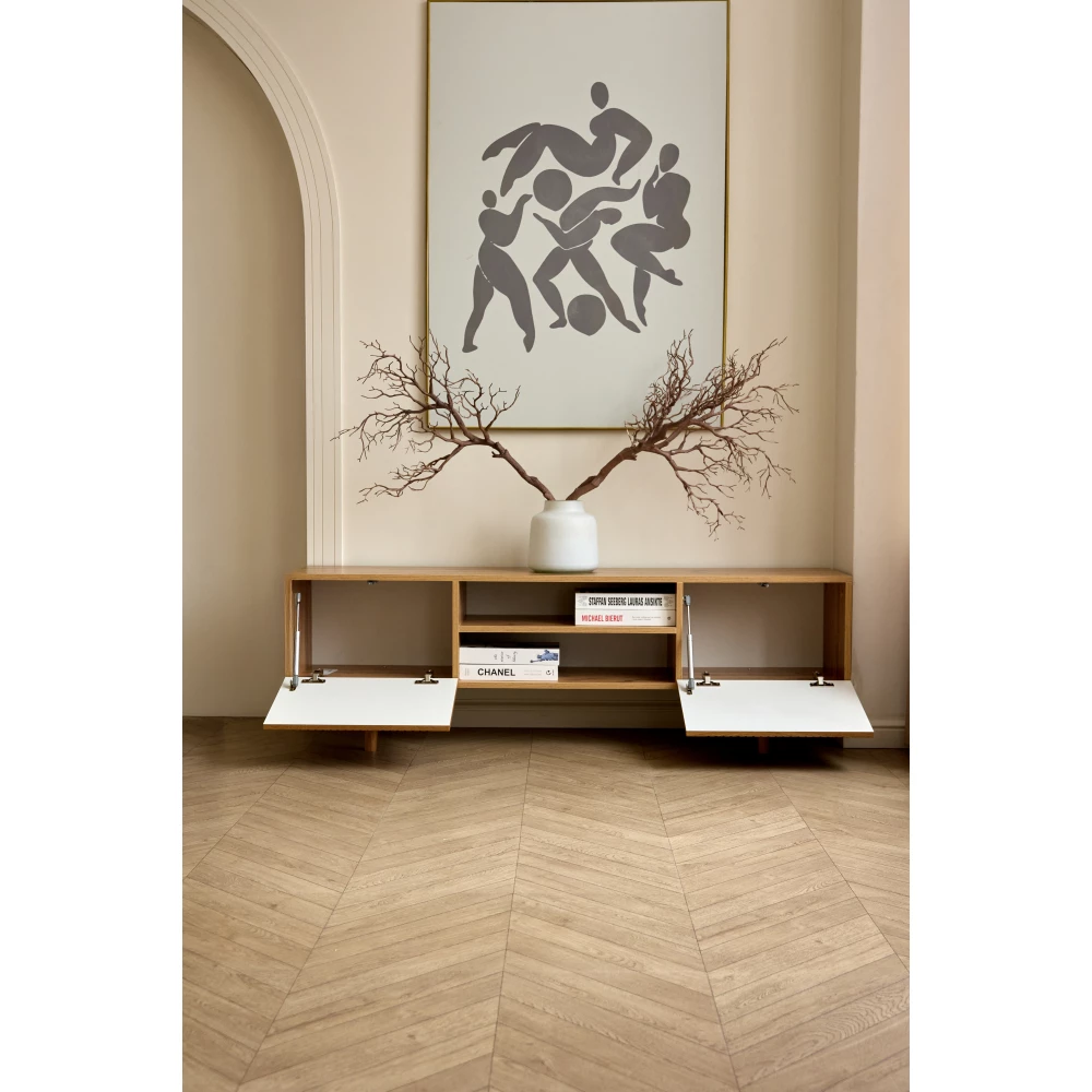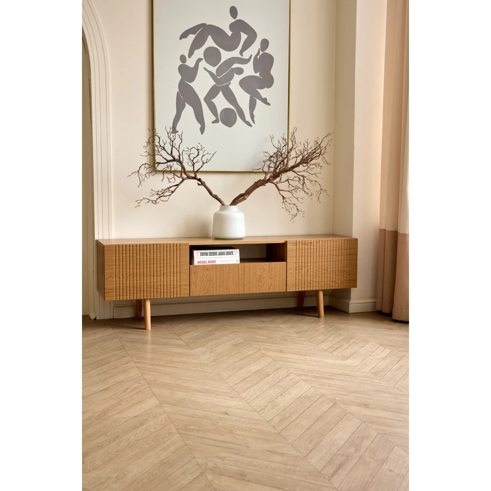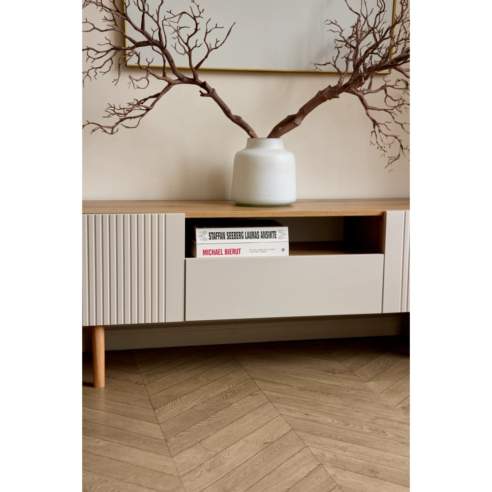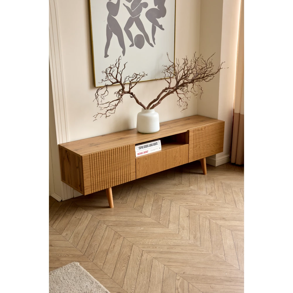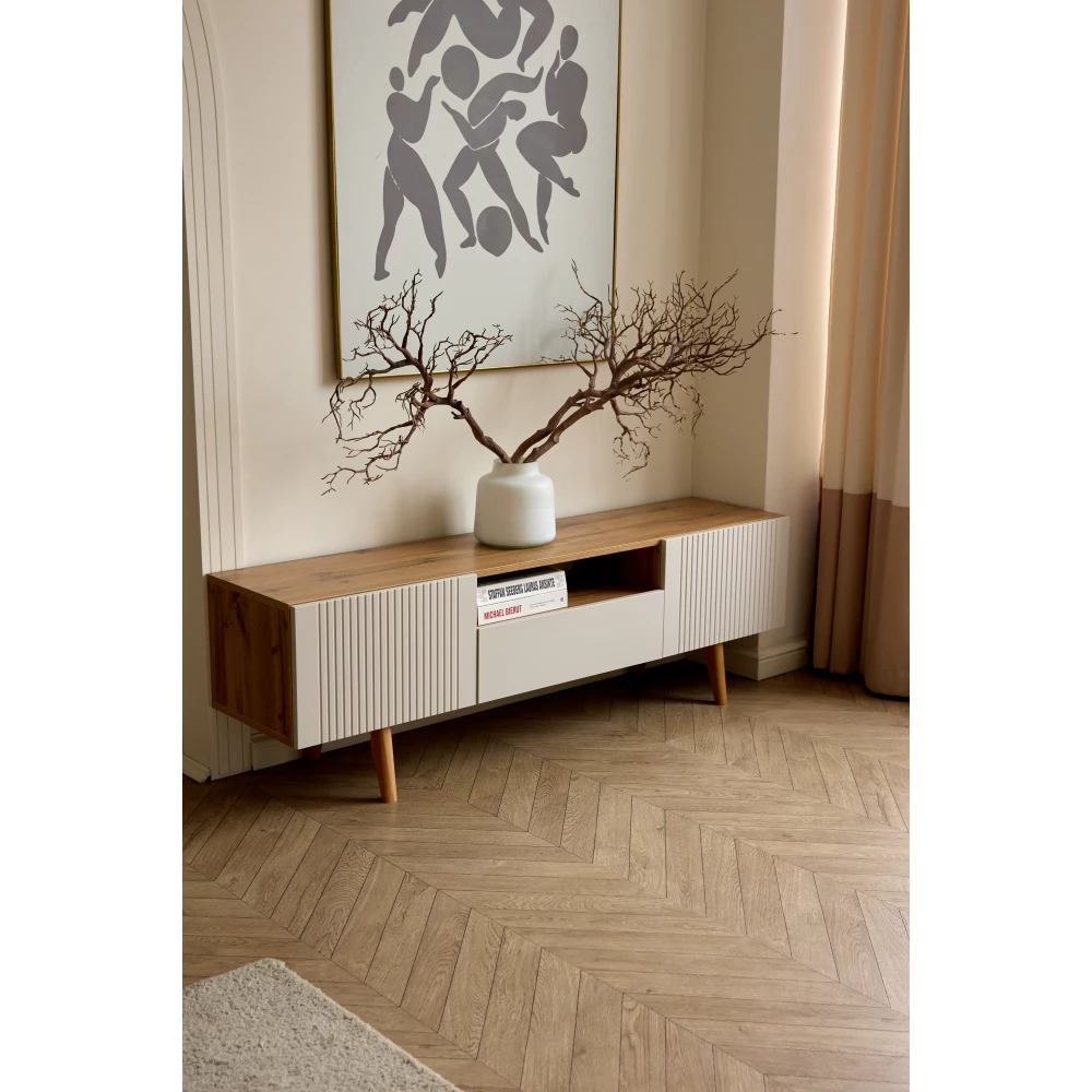Тумба под ТВ этой модели имеет фасад из материала мдф. Это безопасный для здоровья и долговечный материал, который сохраняет свой внешний вид.
